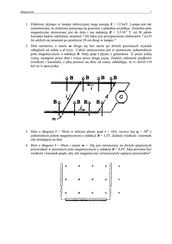 Magnetyzm 1 1. Elektrony płynące w lampie telewizyjnej mają energię E = 12 keV. Lampa jest tak zorientowana, Ŝe elektrony poruszają się poziomo z południa na północ. Ziemskie pole magnetyczne skierowane jest do dołu i ma indukcję B = 5,5·10-5 T. (a) W jakim kierunku będzie odchylany strumień ? (b) Jakie jest przyspieszenie elektronów ? (c) O ile odchyli się strumień po przebyciu 20 cm drogi w lampie ? 2. Drut metalowy o masie m ślizga się bez tarcia po dwóch poziomych szynach odległych od siebie o d (rys). Całość umieszczona jest w pionowym, jednorodnym polu magnetycznym o indukcji B. Stały prąd i płynie z generatora G przez jedną szynę, następnie przez drut i wraca przez drugą szynę. Znaleźć zaleŜność prędkości (wielkość i kierunek), z jaką porusza się drut, od czasu, zakładając, Ŝe w chwili t=0 był on w spoczynku. 3. Drut o długości l = 50cm w którym płynie prąd i = 10A, tworzy kąt α = 300 z jednorodnym polem magnetycznym o indukcji B = 1,5T. Znaleźć wielkość i kierunek siły działającej na drut. 4. Drut o długości l = 60cm i masie m = 10g jest zawieszony na dwóch spręŜystych przewodach w poziomym polu magnetycznym o indukcji B = 0,4T. Jaka powinna być wielkość i kierunek prądu, aby siły magnetyczne zrównowaŜyły napięcie przewodów? Magnetyzm 2 5. Na rysunku przedstawiony jest drewniany walec o masie m = 0,25 kg, promieniu R i długości l = 0,1m. Na walcu nawinięte jest N=10 zwojów drutu w ten sposób, Ŝe oś walca leŜy w płaszczyźnie zwojów. Jaki najmniejszy prąd musi płynąć przez obwód, aby walec nie toczył się w dół, jeśli umieścimy go na pochyłej płaszczyźnie tworzącej z poziomem kąt α, w skierowanym pionowo do góry polu magnetycznym o indukcji B = 0,5 T. Zakładamy, Ŝe płaszczyzna zwojów jest równoległa do płaszczyzny, na której umieszczamy walec. 6. W doświadczeniu wywołującym efekt Halla prąd o natęŜeniu i = 3,0 A płynie wzdłuŜ przewodnika o szerokości a =1,0 cm, długości b = 4,0 cm i grubości c = 10-3 cm. Obliczyć poprzeczne napięcie Halla (przez szerokość), gdy pole magnetyczne B = 1,5T przechodziło prostopadle przez cienki przewodnik. Prędkość unoszenia elektronów wynosi v = 0,06 cm/s. 7. Elektron przyspieszamy w polu o róŜnicy potencjałów U = 15000 V, a następnie pozwalamy mu krąŜyć w płaszczyźnie prostopadłej do jednorodnego pola magnetycznego o indukcji B = 0,4 T. Jaki jest promień orbity tego elektronu ? 8. Cząstka α porusza się po torze kołowym o promieniu R = 0,45 m w polu magnetycznym o indukcji B = 1,2T. Obliczyć: (a) prędkość cząstki, (b) okres jej obrotu, (c) energię kinetyczną. 9. Rysunek przedstawia spektrometr masowy uŜywany do pomiaru masy jonów. Jony o masie M i ładunku +q wytwarzane są w źródle Z znajdującym się w komorze, w której następuje wyładowanie gazu. Znajdujące się początkowo w spoczynku jony są następnie przyspieszane w polu o róŜnicy potencjałów U i wchodzą do pola magnetycznego o indukcji B. W polu tym jony poruszają się po półokręgu i na końcu uderzają w kliszę fotograficzną, w odległości x od szczeliny wejściowej, gdzie zostają pochłonięte. Obliczyć masę jonów M. B x U q Z R Magnetyzm 3 10. Elektron przyspieszony przez róŜnicę potencjałów U = 1000V został skierowany w obszar między dwoma równoległymi okładkami oddalonymi o d = 0,02 m z róŜnicą potencjałów między nimi wynoszącą U0 = 100V. JeŜeli elektron wchodzi w ten obszar poruszając się prostopadle do pola elektrycznego między okładkami, to jakie pole magnetyczne prostopadłe zarówno do drogi elektronu jak i do pola elektrycznego jest konieczne, aby elektron poruszał się po linii prostej ? Prawa Ampere’a i Biota-Savarta 11. Na rysunku przedstawiony jest przewodnik w kształcie okręgu o promieniu R, w którym płynie prąd o natęŜeniu i. Obliczyć B dla punktów leŜących na osi tego okręgu. 12. Długi współosiowy kabel składa się z dwóch koncentrycznych przewodników o wymiarach podanych na rysunku. W przewodnikach płyną równe, lecz przeciwnie skierowane prądy o natęŜeniu i. Wyznaczyć wartości indukcji B: (a) Wewnątrz środkowego przewodnika (r<a), (b) między przewodnikami (a<r<b), (c) wewnątrz zewnętrznego przewodnika (b<r<c), na zewnątrz kabla (r>c). 13. Dwa długie, równoległe druty o pomijalnych promieniach znajdują się w odległości d od siebie. Niech przez kaŜdy z nich płynie prąd (a) w tym samym kierunku, (b) w przeciwnych kierunkach. Niech r będzie odległością od środka jednego z drutów. Znaleźć wartość B pola magnetycznego w obszarze między przewodnikami, w punktach leŜących na płaszczyźnie przechodzącej przez te druty, jako funkcję r. Magnetyzm 4 14. Na rysunku przedstawiony jest długi drut przewodzący prąd o natęŜeniu I = 10A oraz prostokątny obwód, w którym płynie prąd o natęŜeniu i = 20A. Obliczyć siłę wypadkową działającą na ten obwód. Przyjąć: a = 1,0cm, b = 8,0 cm, l = 30 cm. I a i b l 15. Solenoid o 200 zwojach, o długości 25 cm i średnicy 10 cm przewodzi prąd 3,0 A. (a) Jaka jest wartość pola magnetycznego B w pobliŜu środka solenoidu? (b) Jaki strumień magnetyczny przechodzi przez pierścień o wewnętrznej średnicy 2 cm i średnicy zewnętrznej 8 cm, jeŜeli płaszczyzna pierścienia jest prostopadła do osi solenoidu ? 16. Toroid o przekroju poprzecznym 5cm x 5cm i promieniu wewnętrznym 15cm ma 500 zwojów drutu i przewodzi prąd 0,8A. (a) Jaka jest wartość pola magnetycznego B w środku toroidu (tzn. w odległości 17,5 cm od osi toroidu) ?(b) Jaki jest strumień magnetyczny przechodzący przez przekrój poprzeczny ? 17. Policzyć wektor indukcji B we wspólnym środku łuków dla obwodów przedstawionych na rysunkach. i i a R l l b α i i R1 R2 R r 18. W pętli kołowej o promieniu R = 10 cm, wykonanej z drutu miedzianego, płynie prąd o natęŜeniu I = 15A. W jej środku u