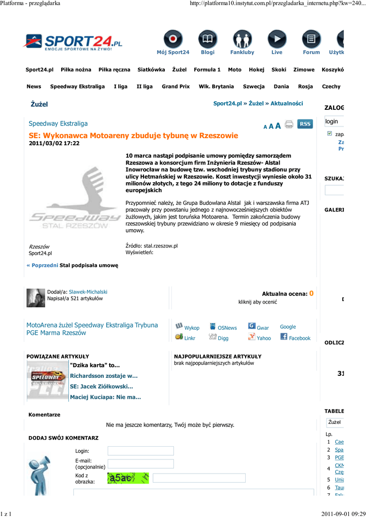 Platforma - przeglądarka 1z1 http://platforma10.instytut.com.pl/przegladarka_internetu.php?kw=240... Mój Sport24 Sport24.pl News Piłka nożna Piłka ręczna Speedway Ekstraliga I liga Siatkówka II liga Żużel Blogi Fankluby Formuła 1 Grand Prix Moto Wlk. Brytania Live Hokej Skoki Szwecja Forum Zimowe Dania Rosja Sport24.pl » Żużel » Aktualności Żużel Speedway Ekstraliga A Użytkownicy Koszykówka Czechy ZALOGUJ SIĘ login AA zapamiętaj m SE: Wykonawca Motoareny zbuduje tybunę w Rzeszowie Zarejestruj Przypomni 2011/03/02 17:22 10 marca nastąpi podpisanie umowy pomiędzy samorządem Rzeszowa a konsorcjum firm Inżynieria Rzeszów- Alstal Inowrocław na budowę tzw. wschodniej trybuny stadionu przy ulicy Hetmańskiej w Rzeszowie. Koszt inwestycji wyniesie około 31 milionów złotych, z tego 24 miliony to dotacje z funduszy europejskich Przypomnieć należy, że Grupa Budowlana Alstal jak i warszawska firma ATJ pracowały przy powstaniu jednego z najnowocześniejszych obiektów żużlowych, jakim jest toruńska Motoarena. Termin zakończenia budowy rzeszowskiej trybuny przewidziano w okresie 9 miesięcy od podpisania umowy. SZUKAJ W PORT GALERIE Źródło: stal.rzeszow.pl Wyświetleń: Rzeszów Sport24.pl « Poprzedni Stal podpisała umowę Dodał/a: Slawek-Michalski Napisał/a 521 artykułów MotoArena żużel Speedway Ekstraliga Trybuna PGE Marma Rzeszów POWIĄZANE ARTYKUŁY "Dzika karta" to... Aktualna ocena: 0 Drużynow kliknij aby ocenić Wykop OSNews Gwar Linkr Digg Yahoo Google Facebook ODLICZANIE NAJPOPULARNIEJSZE ARTYKUŁY brak najpopularniejszych artykułów 31 Richardsson zostaje w... SE: Jacek Ziółkowski... Maciej Kuciapa: Nie ma... TABELE Komentarze Nie ma jeszcze komentarzy, Twój może być pierwszy. DODAJ SWÓJ KOMENTARZ Login: E-mail: (opcjonalnie) Kod z obrazka: Żużel Lp. 1 Caelum Stal G 2 Sparta WTS W 3 PGE Marma R 4 CKM Włókniar Częstochowa 5 Unia Leszno 6 Tauron Azoty 7 Falubaz Zielon 2011-09-01 09:29