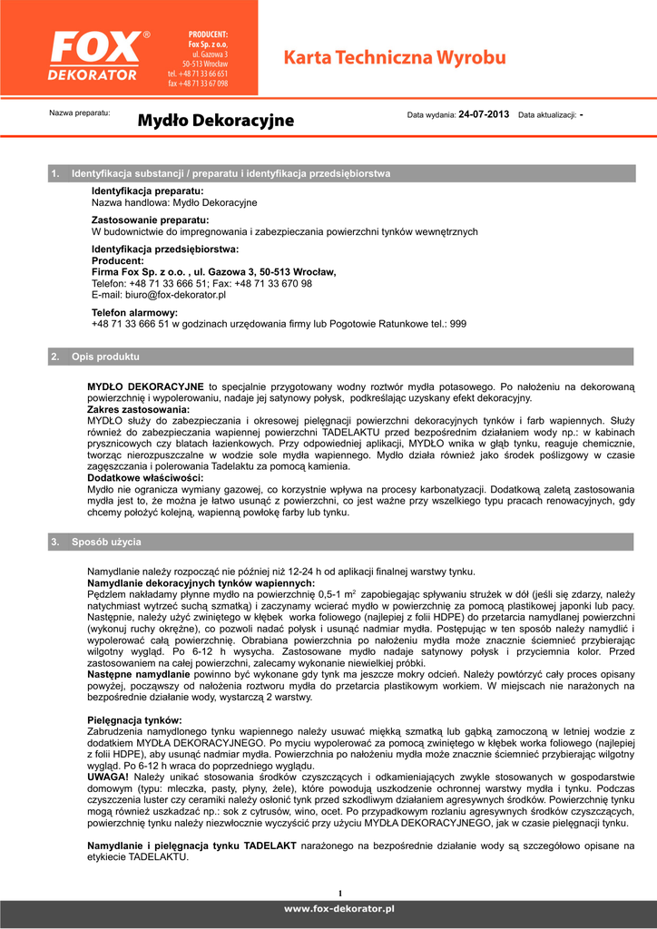 Nazwa preparatu: 1. Mydło Dekoracyjne Data wydania: 24-07-2013 Data aktualizacji: - Identyfikacja substancji / preparatu i identyfikacja przedsiębiorstwa Identyfikacja preparatu: Nazwa handlowa: Mydło Dekoracyjne Zastosowanie preparatu: W budownictwie do impregnowania i zabezpieczania powierzchni tynków wewnętrznych Identyfikacja przedsiębiorstwa: Producent: Firma Fox Sp. z o.o. , ul. Gazowa 3, 50-513 Wrocław, Telefon: +48 71 33 666 51; Fax: +48 71 33 670 98 E-mail: [email protected] Telefon alarmowy: +48 71 33 666 51 w godzinach urzędowania firmy lub Pogotowie Ratunkowe tel.: 999 2. Opis produktu MYDŁO DEKORACYJNE to specjalnie przygotowany wodny roztwór mydła potasowego. Po nałożeniu na dekorowaną powierzchnię i wypolerowaniu, nadaje jej satynowy połysk, podkreślając uzyskany efekt dekoracyjny. Zakres zastosowania: MYDŁO służy do zabezpieczania i okresowej pielęgnacji powierzchni dekoracyjnych tynków i farb wapiennych. Służy również do zabezpieczania wapiennej powierzchni TADELAKTU przed bezpośrednim działaniem wody np.: w kabinach prysznicowych czy blatach łazienkowych. Przy odpowiedniej aplikacji, MYDŁO wnika w głąb tynku, reaguje chemicznie, tworząc nierozpuszczalne w wodzie sole mydła wapiennego. Mydło działa również jako środek poślizgowy w czasie zagęszczania i polerowania Tadelaktu za pomocą kamienia. Dodatkowe właściwości: Mydło nie ogranicza wymiany gazowej, co korzystnie wpływa na procesy karbonatyzacji. Dodatkową zaletą zastosowania mydła jest to, że można je łatwo usunąć z powierzchni, co jest ważne przy wszelkiego typu pracach renowacyjnych, gdy chcemy położyć kolejną, wapienną powłokę farby lub tynku. 3. Sposób użycia Namydlanie należy rozpocząć nie później niż 12-24 h od aplikacji finalnej warstwy tynku. Namydlanie dekoracyjnych tynków wapiennych: Pędzlem nakładamy płynne mydło na powierzchnię 0,5-1 m2 zapobiegając spływaniu strużek w dół (jeśli się zdarzy, należy natychmiast wytrzeć suchą szmatką) i zaczynamy wcierać mydło w powierzchnię za pomocą plastikowej japonki lub pacy. Następnie, należy użyć zwiniętego w kłębek worka foliowego (najlepiej z folii HDPE) do przetarcia namydlanej powierzchni (wykonuj ruchy okrężne), co pozwoli nadać połysk i usunąć nadmiar mydła. Postępując w ten sposób należy namydlić i wypolerować całą powierzchnię. Obrabiana powierzchnia po nałożeniu mydła może znacznie ściemnieć przybierając wilgotny wygląd. Po 6-12 h wysycha. Zastosowane mydło nadaje satynowy połysk i przyciemnia kolor. Przed zastosowaniem na całej powierzchni, zalecamy wykonanie niewielkiej próbki. Następne namydlanie powinno być wykonane gdy tynk ma jeszcze mokry odcień. Należy powtórzyć cały proces opisany powyżej, począwszy od nałożenia roztworu mydła do przetarcia plastikowym workiem. W miejscach nie narażonych na bezpośrednie działanie wody, wystarczą 2 warstwy. Pielęgnacja tynków: Zabrudzenia namydlonego tynku wapiennego należy usuwać miękką szmatką lub gąbką zamoczoną w letniej wodzie z dodatkiem MYDŁA DEKORACYJNEGO. Po myciu wypolerować za pomocą zwiniętego w kłębek worka foliowego (najlepiej z folii HDPE), aby usunąć nadmiar mydła. Powierzchnia po nałożeniu mydła może znacznie ściemnieć przybierając wilgotny wygląd. Po 6-12 h wraca do poprzedniego wyglądu. UWAGA! Należy unikać stosowania środków czyszczących i odkamieniających zwykle stosowanych w gospodarstwie domowym (typu: mleczka, pasty, płyny, żele), które powodują uszkodzenie ochronnej warstwy mydła i tynku. Podczas czyszczenia luster czy ceramiki należy osłonić tynk przed szkodliwym działaniem agresywnych środków. Powierzchnię tynku mogą również uszkadzać np.: sok z cytrusów, wino, ocet. Po przypadkowym rozlaniu agresywnych środków czyszczących, powierzchnię tynku należy niezwłocznie wyczyścić przy użyciu MYDŁA DEKORACYJNEGO, jak w czasie pielęgnacji tynku. Namydlanie i pielęgnacja tynku TADELAKT narażonego na bezpośrednie działanie wody są szczegółowo opisane na etykiecie TADELAKTU. 1 MYDŁO DEKORACYJNE dzięki zawartości mydła potasowego działa bakteriobójczo, zapobiegając rozwojowi flory bakteryjnej i pleśni. Składniki produktu są pochodzenia naturalnego. Narzędzia: Miękka gąbka, miękki pędzel lub aplikator flokowy, szmatka lub tampon bawełniany, plastikowa japonka lub paca, worki plastikowe (z szeleszczącej folii HDPE). Po skończonej pracy narzędzia umyć w ciepłej wodzie. 4. Dane techniczne Wydajność 0,01-0,05 kg/m² średnio na 1 warstwę. Wydajność zależy od zastosowanego rozcieńczenia oraz od chłonności i porowatości podłoża, od ilości warstw, od wybranej metody aplikacji. Ilość warstw 2-5 Czas schnięcia Suchość dotykowa po ok. 2h Nanoszenie kolejnej warstwy Po upływie 4 h, w zależności od chłonności podłoża, ilości nałożonych warstw. Mieszanie Dokładnie wymieszać przed użyciem Rozcieńczalnik Woda . w razie potrzeby rozcieńczyć czystą wodą w ilości 5-10% Przechowywanie i użytkowanie Przechowywać i malować w temperaturze od +5oC do +30oC. Przy niskiej temperaturze i/lub podwyższonej wilgotności czas schnięcia wydłuża się Mrozoodporność Produkt chronić przed przemrożeniem Atest PZH HK/B/0360/01/2013 Ważność Data przydatności i numer partii na opakowaniu Uwaga: Chronić przed dziećmi. Pomieszczenie wietrzyć do zaniku zapachu. Unikać zanieczyszczenia skóry i oczu. W razie połknięcia niezwłocznie zasięgnij porady lekarza – pokaż opakowanie lub etykietę. 5. Konsultacje techniczne W karcie informacyjnej niemożliwe jest opisanie wszystkich rodzajów podłoży oraz sposobu ich przygotowania. W przypadku prac z podłożem nie opisanym w niniejszej karcie konieczna jest konsultacja z naszym serwisem technicznym. Chętnie udzielimy wszelkich niezbędnych informacji. Porady i inspiracje są także dostępne na stronie intern