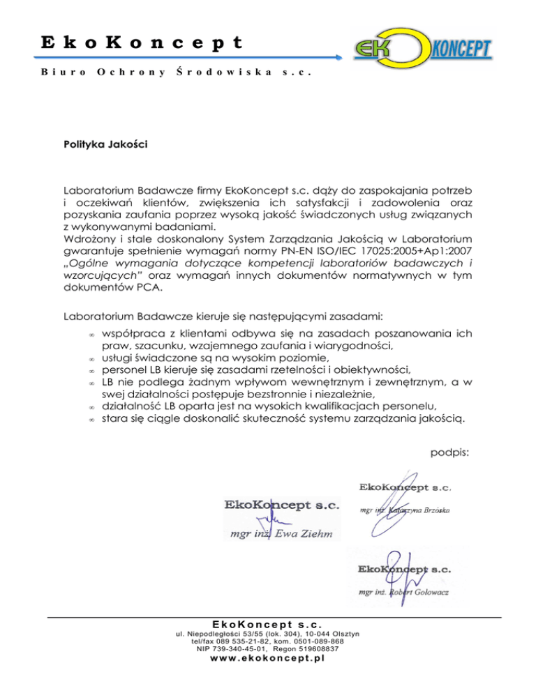 E k o K o n c e p t B i u r o O c h r o n y Ś r o d o w i s k a s . c . Polityka Jakości Laboratorium Badawcze firmy EkoKoncept s.c. dąŜy do zaspokajania potrzeb i oczekiwań klientów, zwiększenia ich satysfakcji i zadowolenia oraz pozyskania zaufania poprzez wysoką jakość świadczonych usług związanych z wykonywanymi badaniami. WdroŜony i stale doskonalony System Zarządzania Jakością w Laboratorium gwarantuje spełnienie wymagań normy PN-EN ISO/IEC 17025:2005+Ap1:2007 „Ogólne wymagania dotyczące kompetencji laboratoriów badawczych i wzorcujących” oraz wymagań innych dokumentów normatywnych w tym dokumentów PCA. Laboratorium Badawcze kieruje się następującymi zasadami: • • • • • • współpraca z klientami odbywa się na zasadach poszanowania ich praw, szacunku, wzajemnego zaufania i wiarygodności, usługi świadczone są na wysokim poziomie, personel LB kieruje się zasadami rzetelności i obiektywności, LB nie podlega Ŝadnym wpływom wewnętrznym i zewnętrznym, a w swej działalności postępuje bezstronnie i niezaleŜnie, działalność LB oparta jest na wysokich kwalifikacjach personelu, stara się ciągle doskonalić skuteczność systemu zarządzania jakością. podpis: EkoKoncept s.c. ul. Niepodległości 53/55 (lok. 304), 10-044 Olsztyn tel/fax 089 535-21-82, kom. 0501-089-868 NIP 739-340-45-01, Regon 519608837 www.ekokoncept.pl