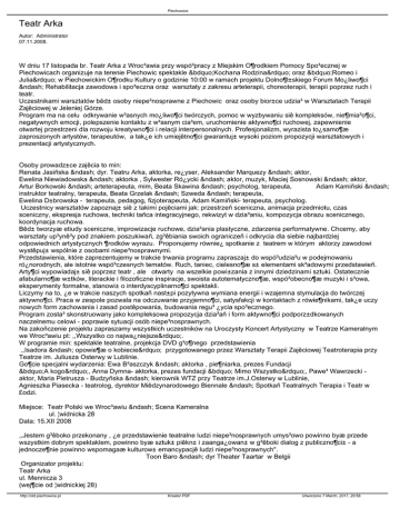 Piechowice Teatr Arka Autor: Administrator 07.11.2008. W dniu 17 listopada br. Teatr Arka z Wroc³awia przy wspó³pracy z Miejskim O¶rodkiem Pomocy Spo³ecznej w Piechowicach organizuje na terenie Piechowic spektakle „Kochana Rodzina” oraz „Romeo i Julia” w Piechowickim O¶rodku Kultury o godzinie 10:00 w ramach projektu Dolno¶l±skiego Forum Mo¿liwo¶ci – Rehabilitacja zawodowa i spo³eczna oraz warsztaty z zakresu arteterapii, choreoterapii, terapii poprzez ruch i teatr. Uczestnikami warsztatów bêd± osoby niepe³nosprawne z Piechowic oraz osoby bior±ce udzia³ w Warsztatach Terapii Zajêciowej w Jeleniej Górze. Program ma na celu odkrywanie w³asnych mo¿liwo¶ci twórczych, pomoc w wyzbywaniu siê kompleksów, nie¶mia³o¶ci, negatywnych emocji, polepszenie kontaktu z w³asnym cia³em, uruchomienie aktywno¶ci ruchowej, zapewnienie otwartej przestrzeni dla rozwoju kreatywno¶ci i relacji interpersonalnych. Profesjonalizm, wyrazista to¿samo¶æ zaproszonych artystów, terapeutów, a tak¿e ich umiejêtno¶ci gwarantuj± wysoki poziom propozycji warsztatowych i prezentacji artystycznych. Osoby prowadz±ce zajêcia to min: Renata Jasiñska – dyr. Teatru Arka, aktorka, re¿yser, Aleksander Marquezy – aktor, Ewelina Niewiadowska – aktorka , Sylwester Ró¿ycki – aktor, muzyk, Maciej Sosnowski – aktor, Artur Borkowski – arteterapeuta, mim, Beata Skawina – psycholog, terapeuta, Adam Kamiñski – instruktor teatralny, terapeuta, Beata Grzelak – Szweda – terapeuta, Ewelina D±browska - terapeuta, pedagog, fizjoterapeuta, Adam Kamiñski- terapeuta, psycholog. Uczestnicy warsztatów zapoznaj± siê z takimi pojêciami jak: przestrzeñ sceniczna, animacja przedmiotu, czas sceniczny, ekspresja ruchowa, techniki tañca integracyjnego, rekwizyt w dzia³aniu, kompozycja obrazu scenicznego, koordynacja ruchowa. Bêd± tworzyæ etiudy sceniczne, improwizacje ruchowe, dzia³ania plastyczne, zdarzenia performatywne. Chcemy, aby warsztaty up³ynê³y pod znakiem poszukiwañ, zg³êbiania swoich ograniczeñ i odkrycia dla siebie najbardziej odpowiednich artystycznych ¶rodków wyrazu. Proponujemy równie¿ spotkanie z teatrem w którym aktorzy zawodowi wystêpuj± wspólnie z osobami niepe³nosprawnymi. Przedstawienia, które zaprezentujemy w trakcie trwania programu zapraszaj± do wspó³udzia³u w podejmowaniu ró¿norodnych, ale istotnie wspó³czesnych tematów. Ruch, taniec, cielesno¶æ s± elementami sk³adowymi przedstawieñ. Arty¶ci wypowiadaj± siê poprzez teatr , ale otwarty na wszelkie powi±zania z innymi dziedzinami sztuki. Ostatecznie afabularno¶æ w±tków, literackie i filozoficzne inspiracje, swoista autotematyczno¶æ, wspó³obecno¶æ muzyki i s³owa, eksperymenty formalne, stanowi± o interdyscyplinarno¶ci spektakli. Liczymy na to, ¿e w trakcie naszych spotkañ nast±pi pozytywna wymiana energii i wzajemna stymulacja do twórczej aktywno¶ci. Praca w zespole pozwala na odczuwanie przyjemno¶ci, satysfakcji w kontaktach z rówie¶nikami, tak¿e uczy nowych form zachowania i zasad postêpowania, budowania regu³ ¿ycia spo³ecznego. Program zosta³ skonstruowany jako kompleksowa propozycja dzia³añ i form aktywno¶ci podporz±dkowanych naczelnemu celowi - poprawie sytuacji osób niepe³nosprawnych. Na zakoñczenie projektu zapraszamy wszystkich uczestników na Uroczysty Koncert Artystyczny w Teatrze Kameralnym we Wroc³awiu pt: ,,Wszystko co najwa¿niejsze”. W programie min: spektakle teatralne, projekcja DVD g³o¶nego przedstawienia ,,Isadora – opowie¶æ o kobiecie” przygotowanego przez Warsztaty Terapii Zajêciowej Teatroterapia przy Teatrze im. Juliusza Osterwy w Lublinie. Go¶cie specjalni wydarzenia: Ewa B³aszczyk – aktorka , pie¶niarka, prezes Fundacji „A kogo”, Anna Dymna- aktorka, prezes fundacji „ Mimo Wszystko”, Pawe³ Wawrzecki aktor, Maria Pietrusza - Budzyñska – kierownik WTZ przy Teatrze im.J.Osterwy w Lublinie, Agnieszka Piasecka - teatrolog, dyrektor Miêdzynarodowego Biennale – Spotkañ Teatralnych Terapia i Teatr w £odzi. Miejsce: Teatr Polski we Wroc³awiu – Scena Kameralna ul. ¦widnicka 28 Data: 15.XII 2008 ,,Jestem g³êboko przekonany , ¿e przedstawienie teatralne ludzi niepe³nosprawnych umys³owo powinno byæ przede wszystkim dobrym spektaklem, powinno byæ sztuk± piêkn± i zaanga¿owan± w g³êboki dialog z publiczno¶ci± - a jednocze¶nie powinno wspomagaæ kulturow± emancypacjê ludzi niepe³nosprawnych". Toon Baro – dyr Theater Taartar w Belgii Organizator projektu: Teatr Arka ul. Mennicza 3 (wej¶cie od ¦widnickiej 28) http://old.piechowice.pl Kreator PDF Utworzono 7 March, 2017, 20:58 Piechowice 50-057 Wroc³aw tel. 071 344 38 06 kom. 694 219 313 e-mail: [email protected] Projekt dofinansowywany przez Urz±d Marsza³kowski Województwa Dolno¶l±skiego w ramach konkursu na realizacjê zadañ publicznych z zakresu rehabilitacji zawodowej i spo³ecznej osób niepe³nosprawnych ze ¶rodków Pañstwowego Funduszu Rehabilitacji Osób Niepe³nosprawnych w 2008 roku. http://old.piechowice.pl Kreator PDF Utworzono 7 March, 2017, 20:58