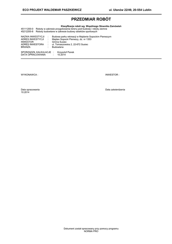 ECO PROJEKT WALDEMAR PASZKIEWICZ ul. Ułanów 22/49, 20-554 Lublin PRZEDMIAR ROBÓT 45111200-0 45212200-8 Klasyfikacja robót wg. Wspólnego Słownika Zamówień Roboty w zakresie przygotowania terenu pod budowę i roboty ziemne Roboty budowlane w zakresie budowy obiektów sportowych NAZWA INWESTYCJI ADRES INWESTYCJI INWESTOR ADRES INWESTORA BRANŻA : : : : : Budowa parku rekreacji w Majdanie Sopockim Pierwszym Majdan Sopocki Pierwszy, dz. nr 1353 Gmina Susiec ul. Tomaszowska 2, 22-672 Susiec Budowlana SPORZĄDZIŁ KALKULACJE : DATA OPRACOWANIA : Krzysztof Panek 10.2014 WYKONAWCA : INWESTOR : Data opracowania 10.2014 Data zatwierdzenia Dokument został opracowany przy pomocy programu NORMA PRO OGÓLNA CHARAKTERYSTYKA OBIEKTU Zakres inwestycji obejmuje obszar działki nr 1353 w miejscowości Majdan Sopocki Pierwszy. Przedmiotem niniejszego opracowania jest budowa parku rekreacji obejmująca: " Montaż zestawu urządzeń rekreacyjnych takich jak - krzesełko do ściągania + krzesełko do wyciskania na dwa stanowiska, zjazd linowy, ławka treningowa " Montaż skałki bulderowej wraz z podbudowa z piasku Teren objęty opracowaniem znajduje się w miejscowości Majdan Sopocki Pierwszy. Stanowi go działka o numerze ewidencyjnym 1353. W miejscu lokalizacji projektowanego parku rekreacji zlokalizowany jest budynek szkoły i przedszkola wraz z utwardzonymi nawierzchniami oraz zieleń towarzysząca: niska i wysoka. Teren, na którym usytuowany będzie park rekreacji położony jest od zachodniej strony działki. Projekt przewiduje montaż urządzeń. Teren inwestycji od strony północnej graniczy z terenem zielonym, od zachodniej z terenami zalewu, od południowej z drogą publiczną, od wschodniej graniczy z zabudowa jednorodzinną. Nawierzchnia naturalna-piasek: - 79,3mkw Nawierzchnia naturalna-trawa: - 191,70mkw Przedmiotem niniejszego opracowania są wymagania dotyczące wykonania i odbioru robót związanych z wykonaniem nawierzchni oraz z montażem urządzeń w parku rekreacji. W zakresie robót przygotowujących działkę nr 1353 w mc. Majdan Sopocki Pierwszy należy oczyścić oraz przygotować teren. Następnie zamontować urządzenia i wykonać nawierzchnie i zamontować skałkę. " Zjazd linowy - urządzenie wykonane z drewna rdzeniowego impregnowanego ciśnieniowo, połączone z fundamentem za pomocą kotew stalowych. Wszystkie elementy stalowe urządzenia malowane proszkowo lub ocynkowane. Połączenia śrubowe zabezpieczone plastikowymi kapslami. Zabezpieczania wykonane ze sklejki wodoodpornej laminowanej lub z tworzywa sztucznego HDPE " Ławka treningowa - urządzenie wykonane z drewna rdzeniowego impregnowanego ciśnieniowo, połączone z fundamentem za pomocą kotew stalowych. Wszystkie elementy stalowe urządzenia malowane proszkowo lub ocynkowane. Połączenia śrubowe zabezpieczone plastikowymi kapslami. " Skałka do bulderingu – skałka zewnętrzna, sztucznie formująca skałę o wysokość minimum 3 metry, wolnostojąca. Technologia wykonania zgodna z obowiązującą normą dotycząca budowy ścian wspinaczkowych oraz spełnia normy. Poszycie skałki poliestrowo – szklane lub na bazie laminatu imitujące naturalną skałę. Skałka bezobsługowa – nie wymagająca asekuracji linowej, a formę zabezpieczenia pełni nawierzchnia amortyzująca upadek (piasek). Wspinaczka odbywa są tylko przy użyciu chwytów wbudowanych w panel. Montaż w podłożu zgodnie z wytycznymi producenta skałki. Powierzchnia wynikająca z ukształtowania skałki min. 24mkw. " Krzesełko do ściągania + krzesełko do wyciskania na dwa stanowiska - urządzenie do ćwiczeń jako element siłowni zewnętrznej, zestaw zbudowany z elementów stalowych takich jak: - rama nośna z rury stalowej śr. min. 140mm - wsporniki ruchowe z rury stalowej śr. 40 -60mm - pokrywy zabezpieczające elementy mocujące z aluminium - siedziska i oparcia ze stali - uchwyty i rączki z polichlorku winylu - elementy stalowe ocynkowane ogniowo i malowane podwójnie proszkowo farbami poliestrowymi - urządzenie spełnia wymagania bezpieczeństwa -2- Norma PRO Wersja 4.38 Nr seryjny: 28808 Użytkownik: Pan Kosztorys Krzysztof Panek 14-043 Susiec.PRD Lp. Podstawa 1 1 d.1 kalk. własna 2 d.1 kalk. własna PRZEDMIAR Opis i wyliczenia MAŁA ARCHITEKTURA Zestaw urządzeń rekreacyjnych - zakup, transport i montaż kpl 1 kpl Zakup, transport i montaż - skałka do burderingu szt. 1 szt. -3- Norma PRO Wersja 4.38 Nr seryjny: 28808 Użytkownik: Pan Kosztorys Krzysztof Panek j.m. Poszcz Razem 1.000 RAZEM 1.000 1.000 RAZEM 1.000