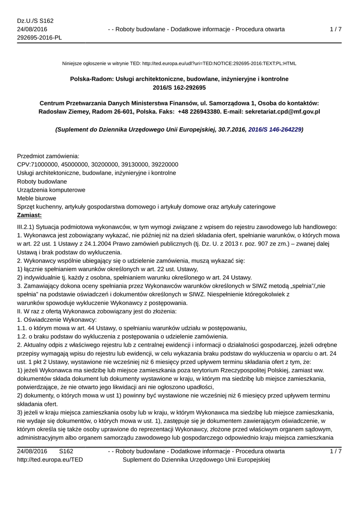 Dz.U./S S162 24/08/2016 292695-2016-PL - - Roboty budowlane - Dodatkowe informacje - Procedura otwarta 1/7 Niniejsze ogłoszenie w witrynie TED: http://ted.europa.eu/udl?uri=TED:NOTICE:292695-2016:TEXT:PL:HTML Polska-Radom: Usługi architektoniczne, budowlane, inżynieryjne i kontrolne 2016/S 162-292695 Centrum Przetwarzania Danych Ministerstwa Finansów, ul. Samorządowa 1, Osoba do kontaktów: Radosław Ziemey, Radom 26-601, Polska. Faks: +48 226943380. E-mail: [email protected] (Suplement do Dziennika Urzędowego Unii Europejskiej, 30.7.2016, 2016/S 146-264229) Przedmiot zamówienia: CPV:71000000, 45000000, 30200000, 39130000, 39220000 Usługi architektoniczne, budowlane, inżynieryjne i kontrolne Roboty budowlane Urządzenia komputerowe Meble biurowe Sprzęt kuchenny, artykuły gospodarstwa domowego i artykuły domowe oraz artykuły cateringowe Zamiast: III.2.1) Sytuacja podmiotowa wykonawców, w tym wymogi związane z wpisem do rejestru zawodowego lub handlowego: 1. Wykonawca jest zobowiązany wykazać, nie później niż na dzień składania ofert, spełnianie warunków, o których mowa w art. 22 ust. 1 Ustawy z 24.1.2004 Prawo zamówień publicznych (tj. Dz. U. z 2013 r. poz. 907 ze zm.) – zwanej dalej Ustawą i brak podstaw do wykluczenia. 2. Wykonawcy wspólnie ubiegający się o udzielenie zamówienia, muszą wykazać się: 1) łącznie spełnianiem warunków określonych w art. 22 ust. Ustawy, 2) indywidualnie tj. każdy z osobna, spełnianiem warunku określonego w art. 24 Ustawy. 3. Zamawiający dokona oceny spełniania przez Wykonawców warunków określonych w SIWZ metodą „spełnia”/„nie spełnia” na podstawie oświadczeń i dokumentów określonych w SIWZ. Niespełnienie któregokolwiek z warunków spowoduje wykluczenie Wykonawcy z postępowania. II. W raz z ofertą Wykonawca zobowiązany jest do złożenia: 1. Oświadczenie Wykonawcy: 1.1. o którym mowa w art. 44 Ustawy, o spełnianiu warunków udziału w postępowaniu, 1.2. o braku podstaw do wykluczenia z postępowania o udzielenie zamówienia. 2. Aktualny odpis z właściwego rejestru lub z centralnej ewidencji i informacji o działalności gospodarczej, jeżeli odrębne przepisy wymagają wpisu do rejestru lub ewidencji, w celu wykazania braku podstaw do wykluczenia w oparciu o art. 24 ust. 1 pkt 2 Ustawy, wystawione nie wcześniej niż 6 miesięcy przed upływem terminu składania ofert z tym, że: 1) jeżeli Wykonawca ma siedzibę lub miejsce zamieszkania poza terytorium Rzeczypospolitej Polskiej, zamiast ww. dokumentów składa dokument lub dokumenty wystawione w kraju, w którym ma siedzibę lub miejsce zamieszkania, potwierdzające, że nie otwarto jego likwidacji ani nie ogłoszono upadłości, 2) dokumenty, o których mowa w ust 1) powinny być wystawione nie wcześniej niż 6 miesięcy przed upływem terminu składania ofert. 3) jeżeli w kraju miejsca zamieszkania osoby lub w kraju, w którym Wykonawca ma siedzibę lub miejsce zamieszkania, nie wydaje się dokumentów, o których mowa w ust. 1), zastępuje się je dokumentem zawierającym oświadczenie, w którym określa się także osoby uprawione do reprezentacji Wykonawcy, złożone przed właściwym organem sądowym, administracyjnym albo organem samorządu zawodowego lub gospodarczego odpowiednio kraju miejsca zamieszkania 24/08/2016 S162 http://ted.europa.eu/TED - - Roboty budowlane - Dodatkowe informacje - Procedura otwarta Suplement do Dziennika Urzędowego Unii Europejskiej 1/7 Dz.U./S S162 24/08/2016 292695-2016-PL - - Roboty budowlane - Dodatkowe informacje - Procedura otwarta 2/7 osoby lub kraju, w którym Wykonawca ma siedzibę lub miejsce zamieszkania, lub przed notariuszem. Postanowienie ust. 2). stosuje się odpowiednio. 3. Aktualne zaświadczenie właściwego naczelnika urzędu skarbowego potwierdzające, że Wykonawca nie zalega z opłacaniem podatków, lub zaświadczenia, że uzyskał przewidziane prawem zwolnienie, odroczenie lub rozłożenie na raty zaległych płatności lub wstrzymanie w całości wykonania decyzji właściwego organu – wystawione nie wcześniej niż 3 miesiące przed upływem terminu składania ofert – z tym, że: 1) jeżeli Wykonawca ma siedzibę lub miejsce zamieszkania poza terytorium Rzeczypospolitej Polskiej, zamiast ww. dokumentów składa dokument lub dokumenty wystawione w kraju, w którym ma siedzibę lub miejsce zamieszkania, potwierdzające, że nie zalega z uiszczaniem podatków, albo że uzyskał przewidziane prawem zwolnienie, odroczenie lub rozłożenie na raty zaległych płatności lub wstrzymanie w całości wykonania decyzji właściwego organu, 2) dokumenty, o których mowa w ust 1) powinny być wystawione nie wcześniej niż 3 miesięcy przed upływem terminu składania ofert, 3) jeżeli w kraju miejsca zamieszkania osoby lub w kraju, w którym Wykonawca ma siedzibę lub miejsce zamieszkania, nie wydaje się dokumentów, o których mowa w ust. 1), zastępuje się je dokumentem zawierającym oświadczenie, w którym określa się także osoby uprawione do reprezentacji Wykonawcy, złożone przed właściwym organem sądowym, administracyjnym albo organem samorządu zawodowego lub gospodarczego odpowiednio kraju miejsca zamieszkania osoby lub kraju, w którym Wykonawca ma siedzibę lub miejsce zamieszkania, lub przed notariuszem. Postanowienie ust. 2). stosuje się odpowiednio. 4. Aktualne zaświadczenie właściwego oddziału Zakładu Ubezpieczeń Społecznych lub Kasy Rolniczego Ubezpieczenia Społecznego potwierdzające, że Wykonawca nie zalega z opłacaniem składek na ubezpieczenia zdrowotne i społeczne, lub potwierdzenie, że uzyskał przewidziane prawem zwolnienie, odroczenie lub rozłożenie na raty zaległych płatności lub wstrzymanie w całości wykonania decyzji właściwego organu – wystawione nie wcześniej niż 3 miesiące przed upływem terminu składania ofert – z tym, że: 1) jeżeli Wykonawca ma siedzibę lub miejsce zamieszkania poza terytorium Rzeczypospo