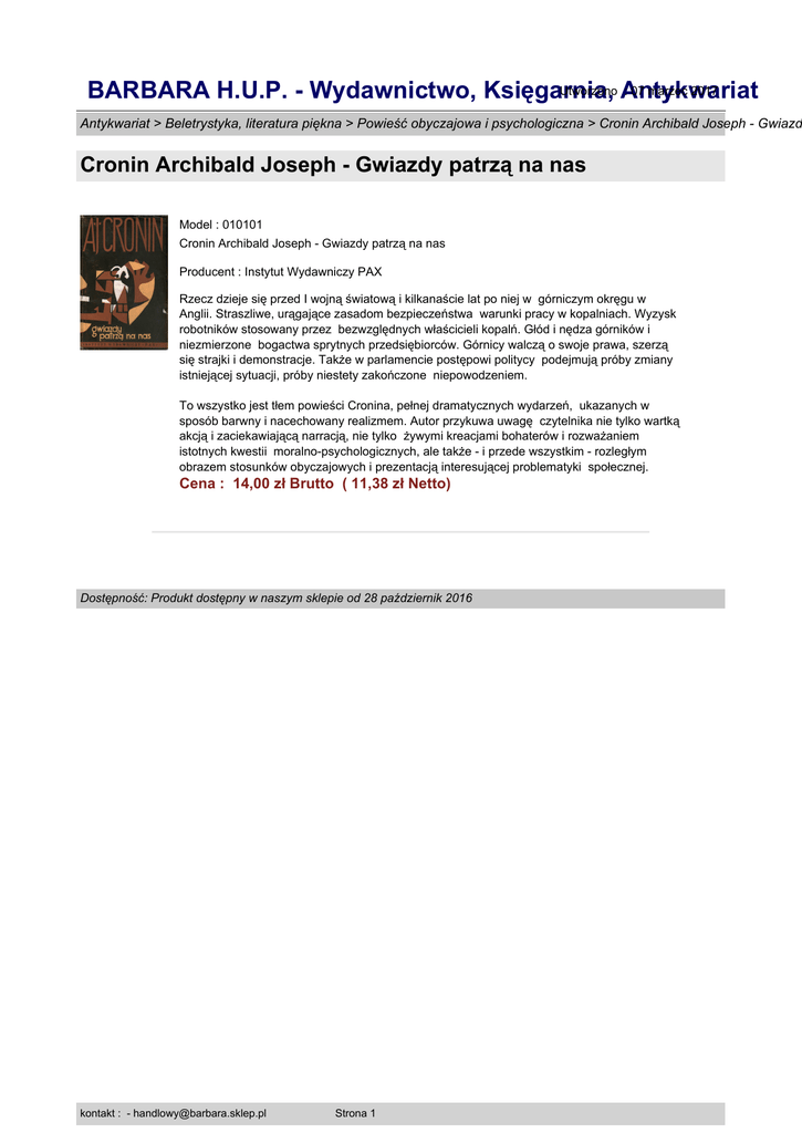 Utworzono Antykwariat : 07 marzec 2017 BARBARA H.U.P. - Wydawnictwo, Księgarnia, Antykwariat > Beletrystyka, literatura piękna > Powieść obyczajowa i psychologiczna > Cronin Archibald Joseph - Gwiazd Cronin Archibald Joseph - Gwiazdy patrzą na nas Model : 010101 Cronin Archibald Joseph - Gwiazdy patrzą na nas Producent : Instytut Wydawniczy PAX Rzecz dzieje się przed I wojną światową i kilkanaście lat po niej w górniczym okręgu w Anglii. Straszliwe, urągające zasadom bezpieczeństwa warunki pracy w kopalniach. Wyzysk robotników stosowany przez bezwzględnych właścicieli kopalń. Głód i nędza górników i niezmierzone bogactwa sprytnych przedsiębiorców. Górnicy walczą o swoje prawa, szerzą się strajki i demonstracje. Także w parlamencie postępowi politycy podejmują próby zmiany istniejącej sytuacji, próby niestety zakończone niepowodzeniem. To wszystko jest tłem powieści Cronina, pełnej dramatycznych wydarzeń, ukazanych w sposób barwny i nacechowany realizmem. Autor przykuwa uwagę czytelnika nie tylko wartką akcją i zaciekawiającą narracją, nie tylko żywymi kreacjami bohaterów i rozważaniem istotnych kwestii moralno-psychologicznych, ale także - i przede wszystkim - rozległym obrazem stosunków obyczajowych i prezentacją interesującej problematyki społecznej. Cena : 14,00 zł Brutto ( 11,38 zł Netto) Dostępność: Produkt dostępny w naszym sklepie od 28 październik 2016 kontakt : - [email protected] Strona 1