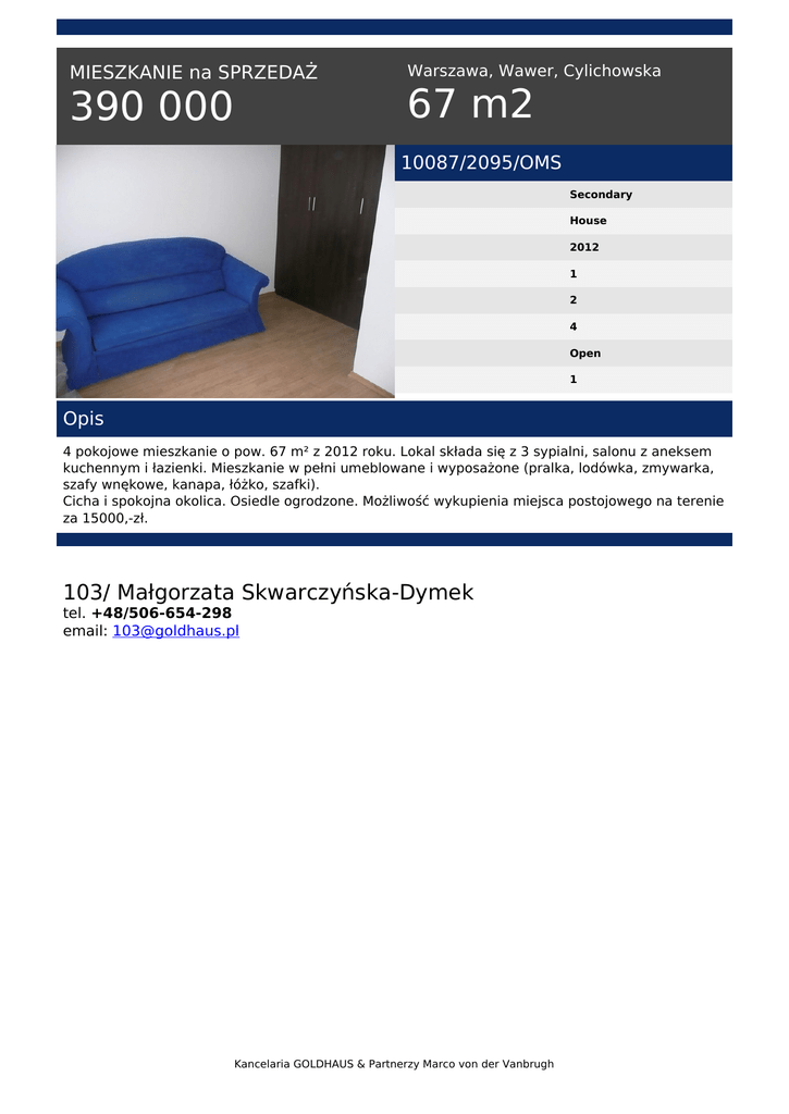 MIESZKANIE na SPRZEDAŻ 390 000 Warszawa, Wawer, Cylichowska 67 m2 10087/2095/OMS Secondary House 2012 1 2 4 Open 1 Opis 4 pokojowe mieszkanie o pow. 67 m² z 2012 roku. Lokal składa się z 3 sypialni, salonu z aneksem kuchennym i łazienki. Mieszkanie w pełni umeblowane i wyposażone (pralka, lodówka, zmywarka, szafy wnękowe, kanapa, łóżko, szafki). Cicha i spokojna okolica. Osiedle ogrodzone. Możliwość wykupienia miejsca postojowego na terenie za 15000,-zł. 103/ Małgorzata Skwarczyńska-Dymek tel. +48/506-654-298 email: [email protected] Kancelaria GOLDHAUS & Partnerzy Marco von der Vanbrugh Powered by TCPDF (www.tcpdf.org)