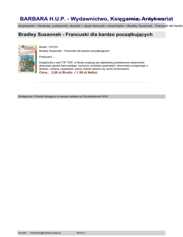 Utworzono Antykwariat : 07 marzec 2017 BARBARA H.U.P. - Wydawnictwo, Księgarnia, Antykwariat > Naukowe, podręczniki, słowniki > Język francuski i romanistyka > Bradley Susannah - Francuski dla bardzo Bradley Susannah - Francuski dla bardzo początkujących Model : 010101 Bradley Susannah - Francuski dla bardzo początkujących Producent : Książeczka z serii TIP TOP, w której znajdują się najbardziej podstawowe wiadomości dotyczące języka francuskiego: wymowa, podstawy gramatyki i słownictwa związanego z domem, rodziną, wyjazdami, pracą. Każde słówko czy zwrot zilustrowane. Cena : 2,00 zł Brutto ( 1,90 zł Netto) Dostępność: Produkt dostępny w naszym sklepie od 26 październik 2016 kontakt : - [email protected] Strona 1