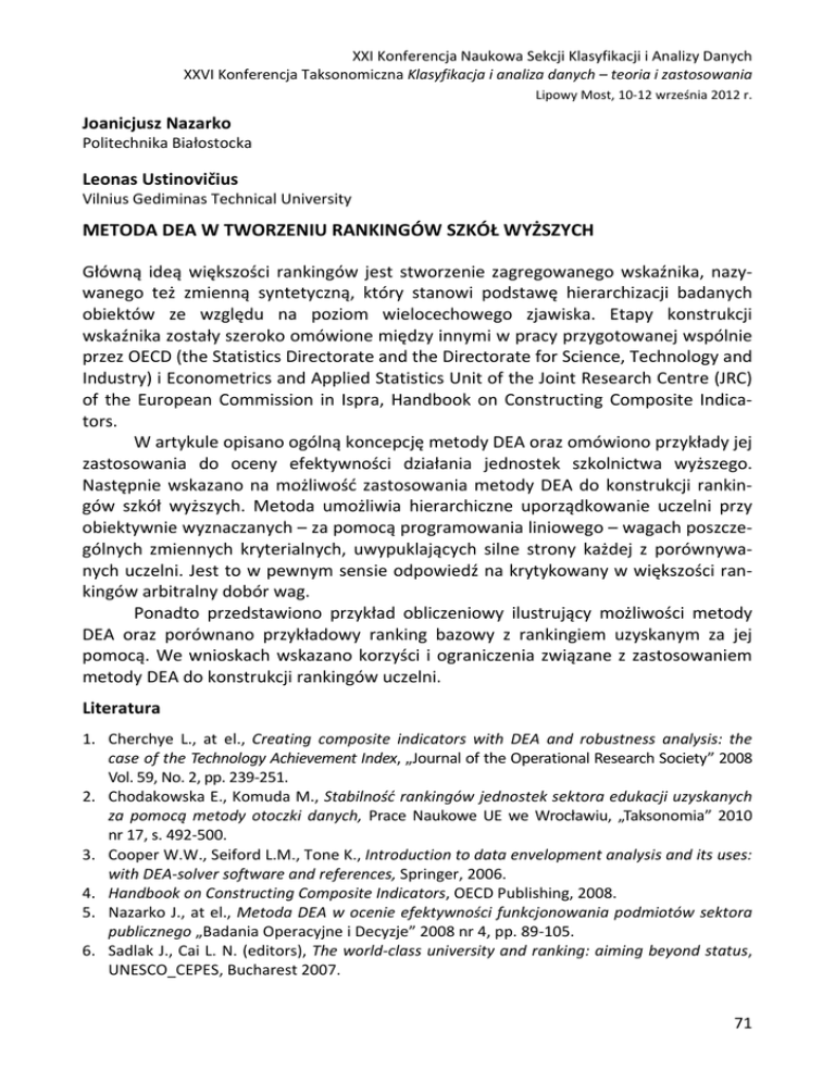 XXI Konferencja Naukowa Sekcji Klasyfikacji i Analizy Danych XXVI Konferencja Taksonomiczna Klasyfikacja i analiza danych – teoria i zastosowania Lipowy Most, 10-12 września 2012 r. Joanicjusz Nazarko Politechnika Białostocka Leonas Ustinovičius Vilnius Gediminas Technical University METODA DEA W TWORZENIU RANKINGÓW SZKÓŁ WYŻSZYCH Główną ideą większości rankingów jest stworzenie zagregowanego wskaźnika, nazywanego też zmienną syntetyczną, który stanowi podstawę hierarchizacji badanych obiektów ze względu na poziom wielocechowego zjawiska. Etapy konstrukcji wskaźnika zostały szeroko omówione między innymi w pracy przygotowanej wspólnie przez OECD (the Statistics Directorate and the Directorate for Science, Technology and Industry) i Econometrics and Applied Statistics Unit of the Joint Research Centre (JRC) of the European Commission in Ispra, Handbook on Constructing Composite Indicators. W artykule opisano ogólną koncepcję metody DEA oraz omówiono przykłady jej zastosowania do oceny efektywności działania jednostek szkolnictwa wyższego. Następnie wskazano na możliwość zastosowania metody DEA do konstrukcji rankingów szkół wyższych. Metoda umożliwia hierarchiczne uporządkowanie uczelni przy obiektywnie wyznaczanych – za pomocą programowania liniowego – wagach poszczególnych zmiennych kryterialnych, uwypuklających silne strony każdej z porównywanych uczelni. Jest to w pewnym sensie odpowiedź na krytykowany w większości rankingów arbitralny dobór wag. Ponadto przedstawiono przykład obliczeniowy ilustrujący możliwości metody DEA oraz porównano przykładowy ranking bazowy z rankingiem uzyskanym za jej pomocą. We wnioskach wskazano korzyści i ograniczenia związane z zastosowaniem metody DEA do konstrukcji rankingów uczelni. Literatura 1. Cherchye L., at el., Creating composite indicators with DEA and robustness analysis: the case of the Technology Achievement Index, „Journal of the Operational Research Society” 2008 Vol. 59, No. 2, pp. 239-251. 2. Chodakowska E., Komuda M., Stabilność rankingów jednostek sektora edukacji uzyskanych za pomocą metody otoczki danych, Prace Naukowe UE we Wrocławiu, „Taksonomia” 2010 nr 17, s. 492-500. 3. Cooper W.W., Seiford L.M., Tone K., Introduction to data envelopment analysis and its uses: with DEA-solver software and references, Springer, 2006. 4. Handbook on Constructing Composite Indicators, OECD Publishing, 2008. 5. Nazarko J., at el., Metoda DEA w ocenie efektywności funkcjonowania podmiotów sektora publicznego „Badania Operacyjne i Decyzje” 2008 nr 4, pp. 89-105. 6. Sadlak J., Cai L. N. (editors), The world-class university and ranking: aiming beyond status, UNESCO_CEPES, Bucharest 2007. 71