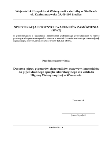 Wojewódzki Inspektorat Weterynarii z siedzibą w Siedlcach ul. Kazimierzowska 29, 08-110 Siedlce. _____________________________________________________________________________ SPECYFIKACJA ISTOTNYCH WARUNKÓW ZAMÓWIENIA (SIWZ) w postępowaniu o udzielenie zamówienia publicznego prowadzonym w trybie przetargu nieograniczonego dla dostaw o wartości zamówienia nie przekraczającej, wyrażonej w złotych, równowartość kwoty 125.000 EURO. Przedmiot zamówienia: Dostawa pipet, pipetorów, dozowników, statywów i materiałów do pipet; drobnego sprzętu laboratoryjnego dla Zakładu Higieny Weterynaryjnej w Warszawie. Zatwierdził: ______________________________ (pieczęć i podpis) _____________________________________________________________________________ Siedlce 2011 r. 1 ROZDZIAŁ I – POSTANOWIENIA OGÓLNE. 1. Nazwa oraz adres Zamawiającego: Wojewódzki Inspektorat Weterynarii z siedzibą w Siedlcach 08-110 Siedlce ul. Kazimierzowska 29 NIP: 821-20-68-188 telefon: + 48 (025) 63 264 59, Faks: + 48 (025) 63 255 84 adres strony internetowej: www.wiw.mazowsze.pl 2. Oznaczenie postępowania. Postępowanie, którego dotyczy niniejsza SIWZ oznaczone jest znakiem: WIW.AD.I.272.47.2011. Wykonawcy zobowiązani są do powoływania się na wyżej podane oznaczenie we wszelkich kontaktach z Zamawiającym. 3. Tryb udzielenia zamówienia. 3.1. Postępowanie o udzielenie zamówienia prowadzone jest w trybie przetargu nieograniczonego o wartości szacunkowej poniżej 125.000 EURO na podstawie ustawy z dnia 29 stycznia 2004 r. Prawo zamówień publicznych (Dz. U. z 2010 r. Nr 113, poz. 759 z późn. zm.). 3.2. Ilekroć w niniejszej SIWZ zastosowane jest pojęcie „ustawa”, „ustawa Pzp” lub „Pzp”, należy przez to rozumieć ustawę Prawo zamówień publicznych, o której mowa w pkt. 3.1. 3.3. Zamawiający nie przewiduje wyboru najkorzystniejszej oferty z zastosowaniem aukcji elektronicznej, o której mowa w art. 91a - 91c ustawy Pzp. Opis przedmiotu zamówienia. 4. Przedmiotem zamówienia jest dostawa pipet, pipetorów, dozowników, statywów i materiałów do pipet.; drobnego sprzętu laboratoryjnego dla Zakładu Higieny Weterynaryjnej w Warszawie tj.: 4.1.1. Pakiet 1 - dostawa pipet, pipetorów, dozowników, statywów i materiałów do pipet, 4.1.2. Pakiet 2 – dostawa drobnego sprzętu laboratoryjnego. 4.2. Szczegółowe określenie zakresu przedmiotu zamówienia zawarte jest w Rozdziale XVII SIWZ: „Szczegółowy opis przedmiotu zamówienia” oraz w Załączniku nr 5 do SIWZ: „Wzór Umowy”. 4.3. Klasyfikacja wg Wspólnego Słownika Zamówień – 38000000-5 Sprzęt laboratoryjny, optyczny i precyzyjny. 4.4. Zamawiający nie przewiduje zawarcia umowy ramowej. 4.5. Zamawiający nie dopuszcza składania ofert wariantowych w rozumieniu art. 2 pkt 7 ustawy Pzp. 4.6. Zamawiający nie przewiduje zamówień uzupełniających. 4.7. Zamawiający nie przewiduje rozliczenia w walucie obcej. 4.8. Zamawiający nie przewiduje zmian cen wynikających ze zmiany kursów walut. 4.1. 2 5. Termin wykonania i miejsce realizacji zamówienia. 5.1. 5.2. Termin realizacji zamówienia: Zamawiający wymaga dostawę przedmiotu zamówienia zgodnie z harmonogramem dostaw stanowiącym Załącznik Nr 8 do SIWZ. Miejsce realizacji zamówienia: Zakład Higieny Weterynaryjnej w Warszawie, ul. Lechicka 21; 02-156 Warszawa; Oddział Terenowy w Ostrołęce, ul. Składowa 8A, 07–410 Ostrołęka oraz Oddział Terenowy w Siedlcach, ul. Kazimierzowska 29, 08-110 Siedlce. ROZDZIAŁ II - WARUNKI UDZIAŁU W POSTĘPOWANIU ORAZ OPIS SPOSOBU DOKONYWANIA OCENY SPEŁNIANIA TYCH WARUNKÓW. 1. 2. O udzielenie zamówienia ubiegać się mogą Wykonawcy, którzy spełniają warunki dotyczące: − posiadania uprawnień do wykonywania określonej działalności lub czynności, jeżeli przepisy prawa nakładają obowiązek ich posiadania; − posiadania wiedzy i doświadczenia; − dysponowania odpowiednim potencjałem technicznym oraz osobami zdolnymi do wykonania zamówienia; − sytuacji ekonomicznej i finansowej. Opis sposobu dokonania oceny spełniania warunków: 2.1. Zamawiający oceni, czy Wykonawca spełnia warunki udziału w postępowaniu na podstawie oświadczeń i dokumentów wymienionych w rozdziale III pkt. 1.1 SIWZ, a ocena zostanie dokonana na zasadzie „spełnia/niespełnia”. 2.2. Jeżeli Wykonawca nie dołączy do oferty wymaganych oświadczeń i dokumentów lub z ich treści nie będzie wynikać, że zostały spełnione warunki udziału w postępowaniu - z zastrzeżeniem art. 26 ust. 3 ustawy Pzp, to Zamawiający wykluczy Wykonawcę na podstawie art. 24 ust. 2 pkt 4 ustawy Pzp. 2.3. Wykonawcy, którzy ubiegają się wspólnie o udzielenie zamówienia warunek wiedzy i doświadczenia mogą spełniać łącznie. ROZDZIAŁ III - WYKAZ OŚWIADCZEŃ LUB DOKUMENTÓW, JAKIE MAJĄ DOSTARCZYĆ WYKONAWCY W CELU POTWIERDZENIA SPEŁNIANIA WARUNKÓW UDZIAŁU W POSTĘPOWANIU. 1. 2. W celu potwierdzenia spełniania przez wykonawcę warunków, o których mowa w art. 22 ust. 1 ustawy Pzp, Zamawiający żąda dołączenia do oferty następujących dokumentów: 1.1. Oświadczenia o spełnianiu warunków udziału w postępowaniu – wg wzoru stanowiącego Załącznik nr 1 do SIWZ; Wykonawca powołujący się przy wykazywaniu spełniania warunków udziału w postępowaniu na potencjał innych podmiotów, które będą brały udział w 3 3. realizacji części zamówienia, przedkłada także dokumenty dotyczące tego podmiotu w zakresie wymaganym dla wykonawcy, określonym w rozdziale IV pkt od 1.1 do 1.3 SIWZ. Ponadto Zamawiający żąda od wykonawcy złożenia wraz z ofertą pełnomocnictwa udzielanego osobom podpisującym ofertę, o ile prawo do reprezentowania Wykonawcy w powyższym zakresie nie wynika wprost z dokumentu rejestrowego. Treść pełnomocnictwa musi jednoznacznie określać czynności, co do wykonywania, których pełnomocnik jest upoważniony. Pełnomocnictwo musi być przedstawione w formie oryginału, poświadc