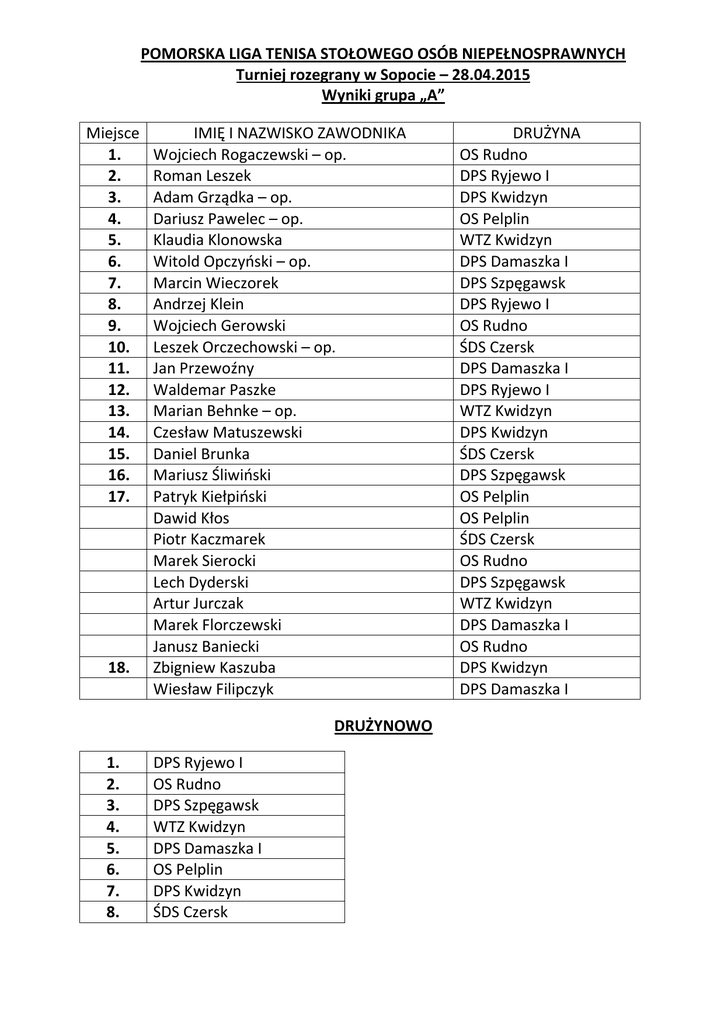 POMORSKA LIGA TENISA STOŁOWEGO OSÓB NIEPEŁNOSPRAWNYCH Turniej rozegrany w Sopocie – 28.04.2015 Wyniki grupa „A” Miejsce 1. 2. 3. 4. 5. 6. 7. 8. 9. 10. 11. 12. 13. 14. 15. 16. 17. 18. IMIĘ I NAZWISKO ZAWODNIKA Wojciech Rogaczewski – op. Roman Leszek Adam Grządka – op. Dariusz Pawelec – op. Klaudia Klonowska Witold Opczyński – op. Marcin Wieczorek Andrzej Klein Wojciech Gerowski Leszek Orczechowski – op. Jan Przewoźny Waldemar Paszke Marian Behnke – op. Czesław Matuszewski Daniel Brunka Mariusz Śliwiński Patryk Kiełpiński Dawid Kłos Piotr Kaczmarek Marek Sierocki Lech Dyderski Artur Jurczak Marek Florczewski Janusz Baniecki Zbigniew Kaszuba Wiesław Filipczyk DRUŻYNOWO 1. 2. 3. 4. 5. 6. 7. 8. DPS Ryjewo I OS Rudno DPS Szpęgawsk WTZ Kwidzyn DPS Damaszka I OS Pelplin DPS Kwidzyn ŚDS Czersk DRUŻYNA OS Rudno DPS Ryjewo I DPS Kwidzyn OS Pelplin WTZ Kwidzyn DPS Damaszka I DPS Szpęgawsk DPS Ryjewo I OS Rudno ŚDS Czersk DPS Damaszka I DPS Ryjewo I WTZ Kwidzyn DPS Kwidzyn ŚDS Czersk DPS Szpęgawsk OS Pelplin OS Pelplin ŚDS Czersk OS Rudno DPS Szpęgawsk WTZ Kwidzyn DPS Damaszka I OS Rudno DPS Kwidzyn DPS Damaszka I