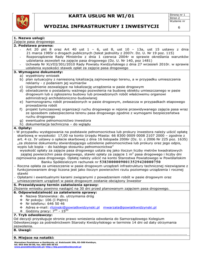 Zajęcie pasa drogowego - Starostwo Powiatowe w Kwidzynie