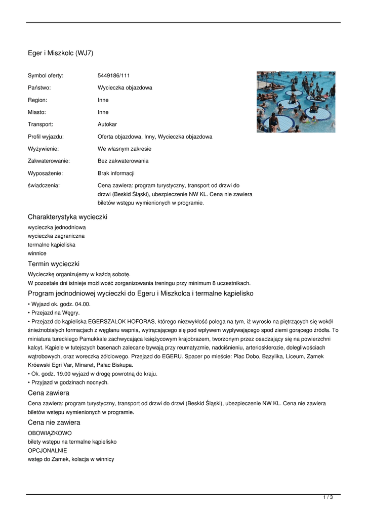 Eger i Miszkolc (WJ7) Symbol oferty: 5449186/111 Państwo: Wycieczka objazdowa Region: Inne Miasto: Inne Transport: Autokar Profil wyjazdu: Oferta objazdowa, Inny, Wycieczka objazdowa Wyżywienie: We własnym zakresie Zakwaterowanie: Bez zakwaterowania Wyposażenie: Brak informacji świadczenia: Cena zawiera: program turystyczny, transport od drzwi do drzwi (Beskid Śląski), ubezpieczenie NW KL. Cena nie zawiera biletów wstępu wymienionych w programie. Charakterystyka wycieczki wycieczka jednodniowa wycieczka zagraniczna termalne kąpieliska winnice Termin wycieczki Wycieczkę organizujemy w każdą sobotę. W pozostałe dni istnieje możliwość zorganizowania treningu przy minimum 8 uczestnikach. Program jednodniowej wycieczki do Egeru i Miszkolca i termalne kąpielisko • Wyjazd ok. godz. 04.00. • Przejazd na Węgry. • Przejazd do kąpieliska EGERSZALOK HOFORAS, którego niezwykłość polega na tym, iż wyrosło na piętrzących się wokół śnieżnobiałych formacjach z węglanu wapnia, wytrącającego się pod wpływem wypływającego spod ziemi gorącego źródła. To miniatura tureckiego Pamukkale zachwycająca księżycowym krajobrazem, tworzonym przez osadzający się na powierzchni kalcyt. Kąpiele w tutejszych basenach zalecane bywają przy reumatyzmie, nadciśnieniu, arteriosklerozie, dolegliwościach wątrobowych, oraz woreczka żółciowego. Przejazd do EGERU. Spacer po mieście: Plac Dobo, Bazylika, Liceum, Zamek Króewski Egri Var, Minaret, Pałac Biskupa. • Ok. godz. 19.00 wyjazd w drogę powrotną do kraju. • Przyjazd w godzinach nocnych. Cena zawiera Cena zawiera: program turystyczny, transport od drzwi do drzwi (Beskid Śląski), ubezpieczenie NW KL. Cena nie zawiera biletów wstępu wymienionych w programie. Cena nie zawiera OBOWIĄZKOWO bilety wstępu na termalne kąpielisko OPCJONALNIE wstęp do Zamek, kolacja w winnicy 1/3 Cena w zależności od ilości uczestników cena dla grupy VIP 156 zł cena dla grupy autokarowej > 45 osób 142 zł Atrakcje: zwiedzanie termalnych kąpielisk stare miasto zamek kościoły winnice TERMINY: od: 2017-03-11 do: 2017-03-11 (1 dni), miejsca: sprawdź miejsca cena od: 156 PLN od: 2017-03-18 do: 2017-03-18 (1 dni), miejsca: sprawdź miejsca cena od: 156 PLN od: 2017-03-25 do: 2017-03-25 (1 dni), miejsca: sprawdź miejsca cena od: 156 PLN od: 2017-04-01 do: 2017-04-01 (1 dni), miejsca: sprawdź miejsca cena od: 156 PLN od: 2017-04-08 do: 2017-04-08 (1 dni), miejsca: sprawdź miejsca cena od: 156 PLN od: 2017-04-15 do: 2017-04-15 (1 dni), miejsca: sprawdź miejsca cena od: 156 PLN od: 2017-04-22 do: 2017-04-22 (1 dni), miejsca: sprawdź miejsca cena od: 156 PLN od: 2017-04-29 do: 2017-04-29 (1 dni), miejsca: sprawdź miejsca cena od: 156 PLN od: 2017-05-06 do: 2017-05-06 (1 dni), miejsca: sprawdź miejsca cena od: 156 PLN od: 2017-05-13 do: 2017-05-13 (1 dni), miejsca: sprawdź miejsca cena od: 156 PLN od: 2017-05-20 do: 2017-05-20 (1 dni), miejsca: sprawdź miejsca cena od: 156 PLN od: 2017-05-27 do: 2017-05-27 (1 dni), miejsca: sprawdź miejsca cena od: 156 PLN od: 2017-06-03 do: 2017-06-03 (1 dni), miejsca: sprawdź miejsca cena od: 156 PLN od: 2017-06-10 do: 2017-06-10 (1 dni), miejsca: sprawdź miejsca cena od: 156 PLN od: 2017-06-17 do: 2017-06-17 (1 dni), miejsca: sprawdź miejsca cena od: 156 PLN od: 2017-06-24 do: 2017-06-24 (1 dni), miejsca: sprawdź miejsca cena od: 156 PLN od: 2017-07-01 do: 2017-07-01 (1 dni), miejsca: sprawdź miejsca cena od: 156 PLN od: 2017-07-08 do: 2017-07-08 (1 dni), miejsca: sprawdź miejsca cena od: 156 PLN od: 2017-07-15 do: 2017-07-15 (1 dni), miejsca: sprawdź miejsca cena od: 156 PLN od: 2017-07-22 do: 2017-07-22 (1 dni), miejsca: sprawdź miejsca cena od: 156 PLN od: 2017-07-29 do: 2017-07-29 (1 dni), miejsca: sprawdź miejsca cena od: 156 PLN od: 2017-08-05 do: 2017-08-05 (1 dni), miejsca: sprawdź miejsca cena od: 156 PLN od: 2017-08-12 do: 2017-08-12 (1 dni), miejsca: sprawdź miejsca cena od: 156 PLN od: 2017-08-19 do: 2017-08-19 (1 dni), miejsca: sprawdź miejsca cena od: 156 PLN od: 2017-08-26 do: 2017-08-26 (1 dni), miejsca: sprawdź miejsca cena od: 156 PLN od: 2017-09-02 do: 2017-09-02 (1 dni), miejsca: sprawdź miejsca cena od: 156 PLN od: 2017-09-09 do: 2017-09-09 (1 dni), miejsca: sprawdź miejsca cena od: 156 PLN od: 2017-09-16 do: 2017-09-16 (1 dni), miejsca: sprawdź miejsca cena od: 156 PLN od: 2017-09-23 do: 2017-09-23 (1 dni), miejsca: sprawdź miejsca cena od: 156 PLN od: 2017-09-30 do: 2017-09-30 (1 dni), miejsca: sprawdź miejsca cena od: 156 PLN od: 2017-10-07 do: 2017-10-07 (1 dni), miejsca: sprawdź miejsca cena od: 156 PLN CENNIK: Długość pobytu: 1 dni Grupa cenowa: A Rodzaj osoby (do wyboru) (*) uczestnik 156 2/3 Transport - wyjazd (do wyboru) Ustroń Rynek 2 Informacja Turystyczna Bielsko-Biała ul. Bystrzańska 48 hotel Vienna Brenna ul.Wyzwolenia 77 Informacja Turystyczna Tresna ul.Nad Jeziorem 99 hotel Odys (-) (-) (-) (-) Wisła ul.Lipowa 4 Dworzec PKS (-) Szczyrk ul.Skośna 9 hotel Olimpia Lux Ustroń ul.Sanatoryjna 7 Informacja Turystyczna Bielsko-Biała ul. Warszawska stacja BP Bielsko-Biała pl.Ratuszowy Informacja Turystyczna Szczyrk ul. Beskidzka 41 Informacja Turystyczna (-) (-) (-) (-) (-) Waluta: PLN Aktualne ceny z systemu S.A.R.T. (-) - cena usługi, podatku kalkulowana przy osobie lub gratis (*) - kwota wliczona w cenę standardową 3/3