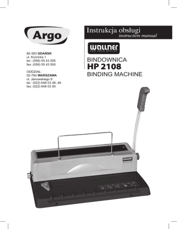 Instrukcja obsługi 80-393 GDAŃSK ul. Krynicka 1 tel.: (058) 55 43 555 fax: (058) 55 43 500 ODDZIAŁ: 02-784 WARSZAWA ul. Janowskiego 9 tel.: (022) 648 03 48..49 fax: (022) 648 03 50 instruction manual Bindownica HP 2108 BINDING MACHINE PL Wallner HP 2108 Bindownica do grzbietów metalowych 1. 2. 3. 4. 5. 6. 7. Ramka podtrzymująca oprawiany dokument Pokrętło do regulacji siły docisku grzbietu 1 Ogranicznik papieru Grzebień / zaczep do zakładania metalowych grzbietów Szczelina dociskowa Dźwignia dziurkująca / dociskowa Szczelina dziurkująca 5 6 2 3 4 7 Instrukcja obsługi Przed użytkowaniem umieść bindownicę w stabilnym i bezpiecznym miejscu Dziurkowanie i bindowanie 1. 2. 3. 4. 5. 6. Użyj ogranicznika rozmiaru papieru (3) aby odpowiednio umieścić papier w formacie A4 lub mniejszym. Pokrętło do regulacji siły docisku grzbietu (2), w momencie dziurkowania, powinno być ustawione w pozycji wyjściowej. Włóż dokument do szczeliny dziurkującej (7), naciśnij dźwignię (5) aby przedziurkować kartki, a następnie zwolnij ją. Wybierz odpowiedni rozmiar metalowego grzbietu i umieść go na grzebieniu (4) otwarciem do góry. Nałóż na grzbiet przedziurkowane okładki i kartki. Włóż dokument razem z grzbietem do szczeliny dociskowej (5). Ustaw pokrętło regulacji docisku grzbietu (2) w pozycji odpowiadającej średnicy grzbietu. Naciśnij dźwignię dociskową (5) w celu dociśnięcia grzbietu i zwolnij ją. Wyjmij oprawiony dokument. © ARGO S.A. www.argo.pl 2 PL Czyszczenie pojemnika na ścinki 1. 2. Wyciągnij pojemnik na ścinki znajdujący się w dole urządzenia, usuń ścinki i wsuń z powrotem. Pojemnik na ścinki opróżniaj regularnie. Uwaga 1. 2. 3. 4. 5. 6. 7. Przed użyciem przeczytaj dokładnie instrukcję obsługi. Trzymaj urządzenie z dala od dzieci. Trzymaj urządzenie z dala od ognia i płynów. Umieść bindownicę w stabilnym i bezpiecznym miejscu w celu zabezpieczenia przed upadkiem lub spowodowaniem uszkodzenia urządzenia lub osoby je obsługującej. Przed standardowym użytkowaniem, przetestuj urządzenie w celu sprawdzenia prawidłowego ułożenia papieru. Przy dziurkowaniu plastikowych okładek sugerujemy umieszczenie ich pomiędzy dwoma kartkami papieru. Urządzenie zostało zaprojektowane do oprawy przy użyciu metalowych grzbietów i plastikowych okładek. Dane techniczne: Model HP 2108 Format oprawianego dokumentu A4 (21 oczek) Maksymalna ilość jednorazowo dziurkowanych kartek A4 12 Maksymalna ilość oprawianych kartek 125 Pojemnik na ścinki tak Tabela doboru wielkości grzbietów drutowych – skok 3:1'' Ilość kartek (80 gr/m2) Średnica (mm) Średnica (cale) 4,8 2/16'' 1 - 15 6,4 1/4'' 16 - 40 8 5/16'' 41 - 55 9,52 3/8'' 56 - 65 11 7/16'' 66 - 80 12,7 1/2'' 81 - 100 14,3 9/16'' 101 - 115 © ARGO S.A. www.argo.pl 3 EN Zalecenia 1. 2. 3. Dziurkowanie maksymalnych ilości kartek dopuszczalnych dla danego modelu nie jest właściwym sposobem użytkowania bindownic. Eksploatacja każdego urządzenia z maksymalnymi wartościami obciążeń prowadzi do zmniejszenia jego żywotności. Nie należy wkładać większych ilości kartek niż maksymalna. Może to bowiem spowodować zablokowanie układów mechanicznych, znacznie zmniejszających trwałość, a nawet prowadzić do jego uszkodzenia. Należy regularnie opróżniać pojemnik na ścinki. USTERKI W przypadku wystąpienia usterki, urządzenie wraz z kartą gwarancyjną i opisem uszkodzenia należy przekazać sprzedawcy, lub do najbliższego autoryzowanego serwisu. Urządzenie może być przekazane do naprawy dalej, dlatego też użytkownik powinien zachować oryginalne i kompletne opakowanie. W przypadku przekazania urządzenia do naprawy w nieoryginalnym lub niekompletnym opakowaniu ryzyko uszkodzenia urządzenia podczas transportu ponosi nabywca. Dlatego też w przypadku braku oryginalnego opakowania w interesie nabywcy leży wykonanie jak najlepszego opakowania zastępczego. © ARGO S.A. www.argo.pl 4 EN Wallner HP 2108 Wire binding machine 1. 2. 3. 4. 5. 6. 7. Paper supporter Apothem Margin control Hooks Handle Wire pressing groove Paper entry 5 1 6 2 3 4 7 Operation guide Place the machine on a stable and safe place before using. Punching and binding operationS 1. 2. 3. 4. 5. 6. Adjust the margin control (3) according to the text's size. The apothem (2) arrowhead should be deed against the place of “punch” when it is punching. Insert the text, then press the handle (5) to punch. Put it up to take out the text. Put the wire comb to the hook (4), ring placket should move forward. Insert the wire ring to the text with covers. Put the text which is hung with wire comb to the wire pressing groove (6), adjust the apothem (2) to the corresponding position comparable with the wire comb's size, press the handle (5) to make the wire comb close, then take out the text, the binding is over. © ARGO S.A. www.argo.pl 5 EN Clean up the shred tray 1. 2. PuIl out the shred tray from the bottom of the machine, clean it and insert it back again. Please clean up the shred tray regularly. Attention 1. 2. 3. 4. 5. 6. 7. Read this operation manual carefully before using. Keep the machine away from children. Keep the machine away from fire and liquid. Put the machine on a stable and safe place in order to prevent it from falling or causing any injury to people or the machine itself. Test the machine with some scrap paper before the actual punching and binding, to make sure that the settings are correct. When punching plastic covers, we suggest that the covers should be clipped between two pieces of paper. This machine is only designed to be used wire comb rings and plastic covers. Specifications Model HP 2108 Binding length A4 (21 holes) Punches up to 12 Binding up to 125 Wastepaper tray yes BINDING CAPACI TY Determine the correct comb diameter (size) for your document: Comb's diameter (mm) Comb's diameter (inches) Amount of sheets (80 gr/m2) 4,8 2/16'' 1 - 15 6,4 1/4'' 16 - 40 8 5/16'' 41 - 55 9