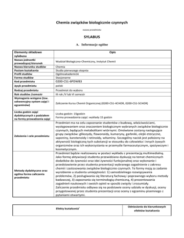 Chemia związków biologicznie czynnych nazwa przedmiotu SYLABUS A. Informacje ogólne Elementy składowe sylabusu Nazwa jednostki prowadzącej kierunek Nazwa kierunku studiów Poziom kształcenia Profil studiów Forma studiów Kod przedmiotu Opis Wydział Biologiczno-Chemiczny, Instytut Chemii Chemia Studia pierwszego stopnia Ogólnoakademicki Stacjonarne 0200-CS1-6PDWB3 Język przedmiotu polski Rodzaj przedmiotu Rok studiów /semestr Wymagania wstępne (tzw. sekwencyjny system zajęć i egzaminów) Przedmiot do wyboru III rok /V lub VI semestr Liczba godzin zajęć dydaktycznych z podziałem na formy prowadzenia zajęć Założenia i cele przedmiotu Metody dydaktyczne oraz ogólna forma zaliczenia przedmiotu Zaliczenie Kursu Chemii Organicznej (0200-CS1-4CHOR, 0200-CS1-5CHOR) Liczba godzin: 15godzin Forma prowadzenia zajęć: wykłady 15 godzin Przedmiot ma na celu zapoznanie studentów z budową, właściwościami, występowaniem oraz znaczeniem biologicznym wybranych związków biologicznie czynnych, będących metabolitami wtórnymi. Omówione zostaną następujące grupy związków: glikozydy, flawonoidy, kumaryny, garbniki, olejki eteryczne, saponiny, karotenoidy i retinoidy, witaminy. Szczególny nacisk jest położony na aktywność biologiczną tych substancji w stosunku do człowieka i innych żywych organizmów oraz ich wykorzystania w przemyśle farmaceutycznym, spożywczym i kosmetycznym. Przedmiot będzie realizowany w postaci wykładu z prezentacją multimedialną. Jako formę aktywizacji studenta przewidziano dyskusję na temat chemicznych dodatków do żywności oraz idei żywności funkcjonalnej oraz wykonanie i przedstawienie przez studenta prezentacji wybranego zagadnienie z zakresu chemii i zastosowania związków biologicznie czynnych. Te formy mają za zadanie wyrobienie u studenta umiejętności: 1) samodzielnego rozwiązywania problemów, 2) posługiwania się literaturą fachową i poprawnego wyboru metody badawczej, 3) zapoznania się terminologią chemiczną, 4) prezentowania zagadnień naukowych i swoich opinii w sposób zwięzły i zrozumiały. Zaliczenie przedmiotu odbywa się na podstawie oceny udziału w dyskusji, oceny przygotowanej przez studenta prezentacji oraz oceny z egzaminu pisemnego z pytaniami otwartymi. Efekty kształceniai Odniesienie do kierunkowych efektów kształcenia 1. 2. 3. 4. Posiada podstawową wiedze z zakresu budowy, właściwości fizykochemicznych, występowania oraz znaczenia związków biologicznie aktywnych. Zna rolę jaką związki biologicznie czynne odgrywają w przemyśle spożywczym, kosmetycznym, farmaceutycznym, rolnictwie. Rozumie znaczenie związków biologicznie czynnych w przemyśle spożywczym, kosmetycznym, farmaceutycznym, rolnictwie oraz dostrzega zagrożenia związane z zanieczyszczeniem środowiska tymi substancjami. Potrafi ocenić wartość odżywczą i prozdrowotną produktów żywnościowych na podstawie ich składu chemicznego. Rozumie potrzebę wzbogacania swojej wiedzy dotyczącej składników aktywnych w kosmetykach, lekach, ziołach, racjonalnego odżywiania i suplementacji żywności Krytycznie podchodzi do informacji rozpowszechnianych w mediach, szczególnie z zakresu chemii żywności, chemii kosmetycznej. K_W03, K_W04, K_U07 K_K02, K_K07 K_K01 K_K07 Punkty ECTS 2 Bilans nakładu pracy ii studenta Ogólny nakład pracy studenta: 50 godz. w tym: udział w zajęciach: 15 godz.; przygotowanie się do zajęć, zaliczeń i egzaminu: 33,1 godz.; udział w konsultacjach, zaliczeniach, egzaminie: 1,9 godz. iii Wskaźniki ilościowe Nakład pracy studenta związany z zajęciami : Liczba godzin Punkty ECTS wymagającymi bezpośredniego udziału nauczyciela 16,9 0,7 o charakterze praktycznym 35 1,4 2013-09-02 Koordynator przedmiotu: Data opracowania: Dr Agnieszka Wojtkielewicz SYLABUS B. Informacje szczegółowe Elementy składowe sylabusu Opis Nazwa przedmiotu Kod przedmiotu Nazwa kierunku Nazwa jednostki prowadzącej kierunek Język przedmiotu Chemia związków biologicznie czynnych Rok studiów/ semestr III rok/ V lub VI semestr Liczba godzin zajęć dydaktycznych oraz forma prowadzenia zajęć Prowadzący Liczba godzin: 15 godz. Forma prowadzenia zajęć: wykłady 0200-CS1-6PDWB3 Chemia Wydział Biologiczno-Chemiczny, Instytut Chemii polski Dr Agnieszka Wojtkielewicz Treści merytoryczne przedmiotu Efekty kształcenia wraz ze sposobem ich weryfikacji Forma i warunki zaliczenia przedmiotu Wykaz literatury podstawowej i uzupełniającej Wprowadzenie - Substancje pochodzenia natutralnego – metabolity pierwotne i wtórne, mechanizm działania biologicznego 2. Glikozydy - budowa, podział, występowanie, znaczenie biologiczne i zastosowanie 3. Alkaloidy – podział, budowa, rola biologiczna, zastosowanie 4. Flawonoidy - budowa, występowanie, rola biologiczna i zastosowanie, 5. Kumaryna i jej pochodne - budowa, znaczenie biologiczne i zastosowanie, 6. Olejki eteryczne - budowa, znaczenie biologiczne i zastosowanie, 7. Karotenoidy i retinoidy - budowa, znaczenie biologiczne i zastosowanie, 8. Witaminy – podział, budowa, znaczenie biologiczne 9. Steroidy 10. Dyskusja na temat chemicznych dodatków do żywności oraz idei żywności funkcjonalnej 11. Przedstawienie wykonanych przez studentów prezentacji dotyczących wybranego zagadnienie z zakresu chemii i zastosowania związków biologicznie czynnych. Posiada podstawową wiedze z zakresu budowy, właściwości, występowania oraz znaczenia związków biologicznie aktywnych. Zna i rozumie rolę jaką związki biologicznie czynne odgrywają w przemyśle spożywczym, kosmetycznym, farmaceutycznym, rolnictwie. Potrafi ocenić wartość odżywczą i prozdrowotną produktów żywnościowych na podstawie ich składu chemicznego. Rozumie potrzebę wzbogacania swojej wiedzy dotyczącej składników aktywnych w kosmetykach, lekach, ziołach, racjonalnego odżywiania i suplementacji żywność. Efekty kształcenia będą sprawdzane na podstawie oceny udziału w dys