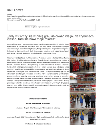KMP Łomża Źródło: http://www.lomza.policja.gov.pl/po4/aktualnosci/4927,Gdy-w-Lomzy-sie-w-pilke-gra-kibicowac-ide-Ja-Na-trybunach-ciasno-ta m-sie-bawi-mo.html Wygenerowano: Wtorek, 7 marca 2017, 21:50 Strona znajduje się w archiwum. „Gdy w Łomży się w piłkę gra, kibicować idę Ja. Na trybunach ciasno, tam się bawi moje miasto” Czternaście drużyn z trzynastu łomżyńskich szkół ponadgimnazjalnych zgłosiło się do rywalizacji w Halowym Turnieju Piłki Nożnej Szkół Ponadgimnazjalnych zorganizowanym przez Komendę Miejską Policji w Łomży oraz Miejski Ośrodek Sportu i Rekreacji w Łomży. Zawody były inauguracją realizowanej przez łomżyńskich policjantów kampanii społecznej „Łomżyńscy Kibice – Wzorowi Kibice”. Wczoraj w Hali Sportowej im. Olimpijczyków Polskich w Łomży odbył się Halowy Turniej Piłki Nożnej Szkół Ponadgimnazjalnych. Zawody futsalu zorganizowane zostały w ramach realizowanej przez łomżyńskich policjantów kampanii społecznej „Łomżyńscy Kibice – Wzorowi Kibice”. Do rywalizacji stanęło czternaście drużyn z trzynastu łomżyńskich szkół ponadgimnazjalnych. Ideą i celem turnieju było wdrożenie wśród młodzieży prawidłowej postawy kibica, propagowanie partnerskiego zachowania się na imprezach masowych oraz doskonalenie zasad i przepisów obowiązujących na obiektach sportowych. Podczas zawodów wśród zgromadzonej publiczności przeprowadzone zostały konkursy sportowe oraz quizy wiedzy o sporcie i bezpieczeństwie. Takie sportowe zmagania są też ciekawym sposobem na spędzanie wolnego czasu przez młodzież, która potrzebuje alternatywy dla „zabicia nudy”. Turniej przebiegał w bardzo sportowej atmosferze i w myśl zasady „Fair Play”. Zwycięskie drużyny oraz kibice biorący udział w zorganizowanych konkursach otrzymali od organizatorów puchary, medale i nagrody. ZWYCIĘSKIE DRUŻYNY Puchar za I miejsce w turnieju: drużyna z Zespołu Szkół Drzewnych i Gimnazjalnych w Łomży Puchar za II miejsce w turnieju: drużyna z Zespołu Szkół Mechanicznych i Ogólnokształcących Nr 5 im. Marszałka Józefa Piłsudskiego w Łomży Puchar za III miejsce w turnieju: drużyna z Zespołu Szkół Ekonomicznych i Ogólnokształcących Nr 6 w Łomży Wyróżnieni zawodnicy Najlepszy Zawodnik –Tomasz Wąsowicz z „Mechanika” Najlepszy Bramkarz –Grzegorz Staniórski z „Mechanika” Najlepszy Strzelec –Arkadiusz Szpada z „Ekonomika” WYRÓŻNIENI ZA NAJLEPSZE HASŁO KAMPANII SPOŁECZNEJ „ŁOMŻYŃSCY KIBICE – WZOROWI KIBICE” I nagroda za hasło: Marlena Wykowska z „Mechanika” „Gdy w Łomży się w piłkę gra, kibicować idę Ja. Na trybunach ciasno, tam się bawi moje miasto.” II nagroda za hasło: Mirek Sznejder „Dwunasty zawodnik tak dumnie to brzmi, więc wspieraj swą drużynę bez przelewu krwi.” III nagroda za hasło: Paula Eryng z „Mechanika” „Łomżyńscy kibice ekipa zgrana, kibicują swoim od samego rana.” ZAŁĄCZNIKI DO STRONY Halowy Turniej Piłki Nożnej Szkól Ponadgimnazjalnych 5.51 MB Ocena: 0/5 (0) Tweetnij