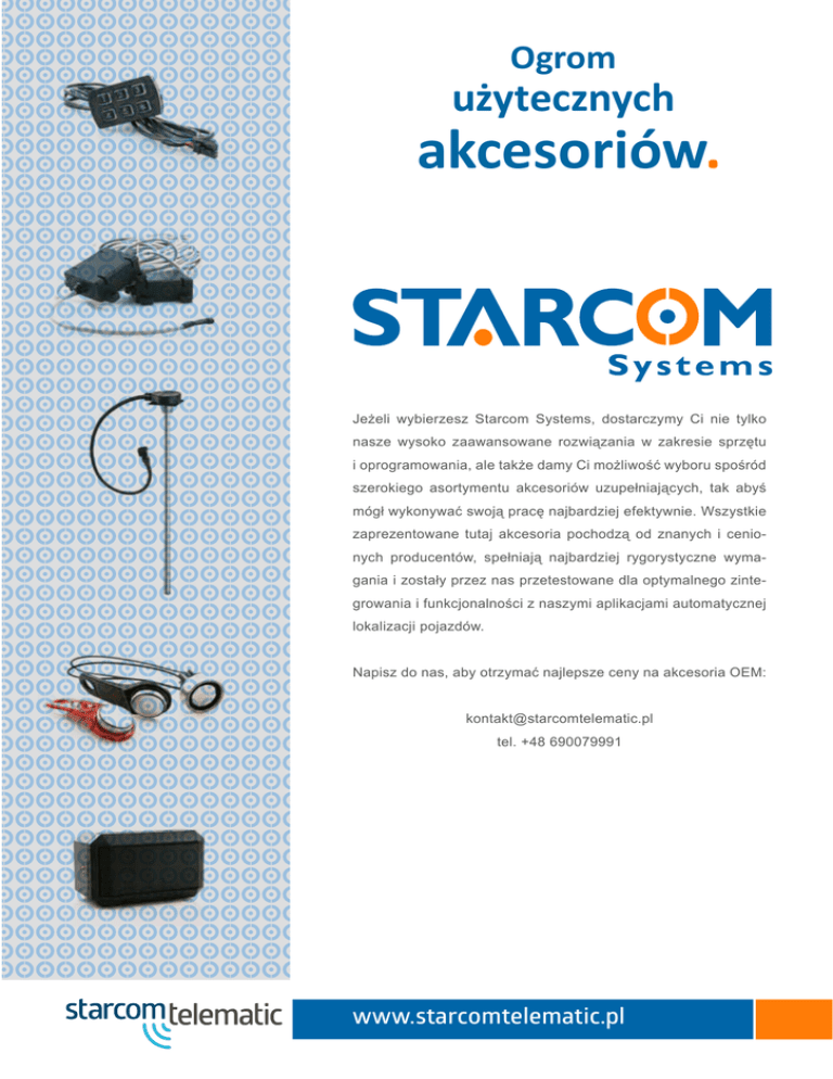Ogrom użytecznych akcesoriów. Jeżeli wybierzesz Starcom Systems, dostarczymy Ci nie tylko nasze wysoko zaawansowane rozwiązania w zakresie sprzętu i oprogramowania, ale także damy Ci możliwość wyboru spośród szerokiego asortymentu akcesoriów uzupełniających, tak abyś mógł wykonywać swoją pracę najbardziej efektywnie. Wszystkie zaprezentowane tutaj akcesoria pochodzą od znanych i cenionych producentów, spełniają najbardziej rygorystyczne wymagania i zostały przez nas przetestowane dla optymalnego zintegrowania i funkcjonalności z naszymi aplikacjami automatycznej lokalizacji pojazdów. Napisz do nas, aby otrzymać najlepsze ceny na akcesoria OEM: [email protected] tel. +48 690079991 www.starcomtelematic.pl Zarządzanie flotą, bezpieczeństwem i sytuacjami nadzwyczajnymi System głośnomówiący System Automatycznej Lokalizacji Pojazdów Helios wspiera kanał komunikacji głosowej, integrując zestaw głośnomówiący stworzony przez Starcom Systems z dodatkową klawiaturą kierowcy lub przyciskiem SOS. Rozmowę przychodzącą odbiera się poprzez wciśnięcie przycisku SOS lub poprzez wprowadzenie kodu na klawiaturze. Domyślnie wybierane numery mogą być zmieniane zdalnie poprzez serwer. Zestaw głośnomówiący Starcom Systems jest doskonałym rozwiązaniem, które umożliwia kontakt głosowy pomiędzy dyspozytorem a kierowcą. Sprawdza się nie tylko w przypadku zarządzania flotą pojazdów, ale także służy zapewnieniu bezpieczeństwa (np. w przypadku porwania, nawiązanie połączenia pozwala nasłuchiwać co się dzieje w pojeździe). Czujnik temperatury Czujnik temperatury jest urządzeniem montowanym fabrycznie, zawierającym filtr podłączony do kabla ekranowanego. Filtr redukuje dźwięki otoczenia i mierzy temperaturę w przedziale od – 20ºC do 40ºC. Specyfikacja: Zakres pomiarowy: -40ºC ~ 110ºC Rodzaj wyjścia: napięciowe Napięcie – zasilanie: 4V~30V Dokładność: ±0,4ºC www.starcomtelematic.pl Klawiatura numeryczna – identyfikacja kierowcy i immobilizer Korzystanie z systemu identyfikacji kierowcy jest możliwe pod warunkiem zintegrowania z klawiaturą numeryczną. Kierowca jest zobowiązany do wprowadzenia swojego numeru identyfikacyjnego zanim uruchomi silnik. Identyfikacja przy pomocy klawiatury jest oparta na tym samej koncepcji, która została zastosowana w systemie Dallas (przycisk zawierający opcję uniemożliwiającą uruchomienie samochodu przez nieupoważnionego kierowcę – wymaga dodatkowego przekaźnika). Klawiatura numeryczna może być również używana do kontroli wykonywanych kursów – kierowca musi wprowadzić kod danego kursu lub dyspozycji przed rozpoczęciem jazdy). Specyfikacja: Napięcie: 12 V Temperatura pracy: od -10ºC do 105ºC Pobór prądu (tryb uśpienia): 15 mAh< @ 12Vdc Pobór prądu (tryb działania): 40mA< @12Vdc Przycisk Dallas – identyfikacja kierowcy i immobilizer System Automatycznej Lokalizacji Pojazdów Helios wspiera przycisk identyfikacji kierowcy Dallas. Komunikuje się on z zainstalowanym kluczem Dallas, o ile dane kierowcy zostały aktywowane. Wspierany przez Helios system identyfikacji kierowcy ma dwa zastosowania: 1. systematycznie śledzi identyfikator kierowcy, 2. blokuje silnik w przypadku próby zalogowania nieupoważnionej osoby (wymaga dodatkowego przekaźnika). Klucz Dallas umożliwia zaprogramowanie numerów. Helios umożliwia wybór trzech opcji: 1. użycie oryginalnego identyfikatora jako identyfikatora kierowcy w systemie, 2. użycie zaprogramowanego numeru, 3. użycie części zaprogramowanych numerów dla wsparcia grupy. www.starcomtelematic.pl Specyfikacja: Zakres napięć: 2,8V-6V Temperatura: -40ºC do 85ºC 64 bit ROM Czujnik poziomu paliwa Dokładny cyfrowy czujnik poziomu paliwa zapewnia nieprzerwaną kontrolę ilości paliwa w baku. Współpracuje głównie z aplikacjami do zarządzania flotą oraz pozostałymi aplikacjami telematycznymi. Informacja o poziomie paliwa jest wysyłana do przetwarzającego dane w formie kodu cyfrowego. Standardowe długości: 700 mm, 1000 mm, 1500 mm. Specyfikacja: Napięcie (VDC): 7,0 – 50,0 Moc znamionowa (W): max 0,4 Złącza wyjścia: · Sygnał fizyczny – RS-232, RS485 · Prędkość transmisji danych (bit/sec) – 1200 – 115,200 Współpraca z Garmin Przenośne urządzenie nawigacyjne Garmin – osobiste urządzenia nawigacyjne zintegrowane z linią produktów Starcom Systems do automatycznej lokalizacji pojazdów są tanim rozwiązaniem umożliwiającym wyświetlanie wiadomości tekstowych i nawigację. Starcom Systems wybrał Garmin, ponieważ jest on liderem i odgrywa kluczową rolę na rynku systemów monitorowania, dostarczając najbardziej użyteczne, wszechstronne i opłacalne rozwiązania. Pełny wykaz funkcji, które są wspierane i mogą być stosowane w osobistych urządzeniach nawigacyjnych Garmin oraz listę modeli tych urządzeń znajdziesz pod poniższymi linkami: Wykaz funkcji: http://www8.garmin.com/solutions/pnd/index.jsp Wykaz modeli: http://www8.garmin.com/solutions/pnd/supportedproducts.jsp www.starcomtelematic.pl