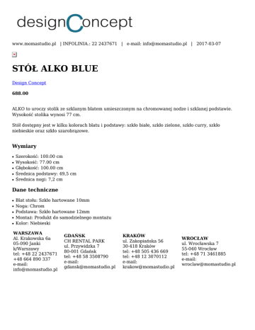www.momastudio.pl | INFOLINIA.: 22 2437671 | e-mail: [email protected] | 2017-03-07 STÓŁ ALKO BLUE Design Concept 688.00 ALKO to uroczy stolik ze szklanym blatem umieszczonym na chromowanej nodze i szklanej podstawie. Wysokość stolika wynosi 77 cm. Stół dostępny jest w kilku kolorach blatu i podstawy: szkło białe, szkło zielone, szkło curry, szkło niebieskie oraz szkło szarobrązowe. Wymiary ● ● ● ● ● Szerokość: 100.00 cm Wysokość: 77.00 cm Głębokość: 100.00 cm Średnica podstawy: 49,5 cm Średnica nogi: 7,2 cm Dane techniczne ● ● ● ● ● Blat stołu: Szkło hartowane 10mm Noga: Chrom Podstawa: Szkło hartowane 12mm Montaż: Produkt do samodzielnego montażu Kolor: Niebieski WARSZAWA Al. Krakowska 6a 05-090 Janki k/Warszawy tel: +48 22 2437671 +48 664 890 337 e-mail: [email protected] GDAŃSK CH RENTAL PARK ul. Przywidzka 7 80-001 Gdańsk tel: +48 58 3508790 e-mail: [email protected] KRAKÓW ul. Zakopiańska 56 30-418 Kraków tel: +48 505 436 669 tel: +48 12 3070112 e-mail: [email protected] WROCŁAW ul. Wrocławska 7 55-040 Wrocław tel: +48 71 3461885 e-mail: [email protected]