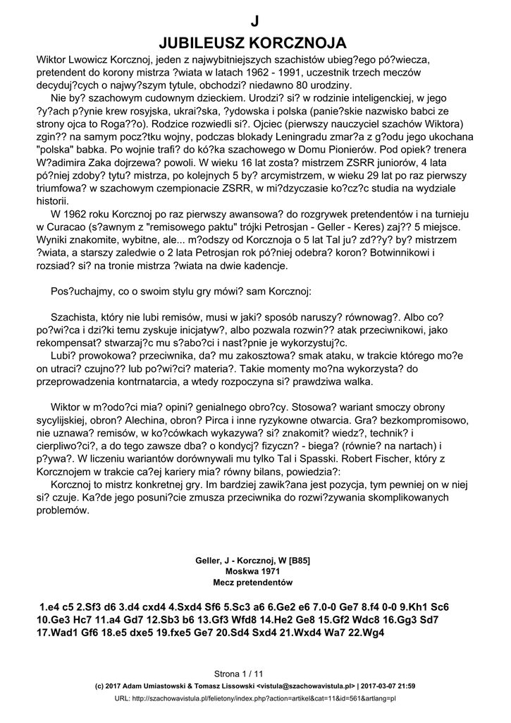 J JUBILEUSZ KORCZNOJA Wiktor Lwowicz Korcznoj, jeden z najwybitniejszych szachistów ubieg?ego pó?wiecza, pretendent do korony mistrza ?wiata w latach 1962 - 1991, uczestnik trzech meczów decyduj?cych o najwy?szym tytule, obchodzi? niedawno 80 urodziny. Nie by? szachowym cudownym dzieckiem. Urodzi? si? w rodzinie inteligenckiej, w jego ?y?ach p?ynie krew rosyjska, ukrai?ska, ?ydowska i polska (panie?skie nazwisko babci ze strony ojca to Roga??o). Rodzice rozwiedli si?. Ojciec (pierwszy nauczyciel szachów Wiktora) zgin?? na samym pocz?tku wojny, podczas blokady Leningradu zmar?a z g?odu jego ukochana "polska" babka. Po wojnie trafi? do kó?ka szachowego w Domu Pionierów. Pod opiek? trenera W?adimira Zaka dojrzewa? powoli. W wieku 16 lat zosta? mistrzem ZSRR juniorów, 4 lata pó?niej zdoby? tytu? mistrza, po kolejnych 5 by? arcymistrzem, w wieku 29 lat po raz pierwszy triumfowa? w szachowym czempionacie ZSRR, w mi?dzyczasie ko?cz?c studia na wydziale historii. W 1962 roku Korcznoj po raz pierwszy awansowa? do rozgrywek pretendentów i na turnieju w Curacao (s?awnym z "remisowego paktu" trójki Petrosjan - Geller - Keres) zaj?? 5 miejsce. Wyniki znakomite, wybitne, ale... m?odszy od Korcznoja o 5 lat Tal ju? zd??y? by? mistrzem ?wiata, a starszy zaledwie o 2 lata Petrosjan rok pó?niej odebra? koron? Botwinnikowi i rozsiad? si? na tronie mistrza ?wiata na dwie kadencje. Pos?uchajmy, co o swoim stylu gry mówi? sam Korcznoj: Szachista, który nie lubi remisów, musi w jaki? sposób naruszy? równowag?. Albo co? po?wi?ca i dzi?ki temu zyskuje inicjatyw?, albo pozwala rozwin?? atak przeciwnikowi, jako rekompensat? stwarzaj?c mu s?abo?ci i nast?pnie je wykorzystuj?c. Lubi? prowokowa? przeciwnika, da? mu zakosztowa? smak ataku, w trakcie którego mo?e on utraci? czujno?? lub po?wi?ci? materia?. Takie momenty mo?na wykorzysta? do przeprowadzenia kontrnatarcia, a wtedy rozpoczyna si? prawdziwa walka. Wiktor w m?odo?ci mia? opini? genialnego obro?cy. Stosowa? wariant smoczy obrony sycylijskiej, obron? Alechina, obron? Pirca i inne ryzykowne otwarcia. Gra? bezkompromisowo, nie uznawa? remisów, w ko?cówkach wykazywa? si? znakomit? wiedz?, technik? i cierpliwo?ci?, a do tego zawsze dba? o kondycj? fizyczn? - biega? (równie? na nartach) i p?ywa?. W liczeniu wariantów dorównywali mu tylko Tal i Spasski. Robert Fischer, który z Korcznojem w trakcie ca?ej kariery mia? równy bilans, powiedzia?: Korcznoj to mistrz konkretnej gry. Im bardziej zawik?ana jest pozycja, tym pewniej on w niej si? czuje. Ka?de jego posuni?cie zmusza przeciwnika do rozwi?zywania skomplikowanych problemów. Geller, J - Korcznoj, W [B85] Moskwa 1971 Mecz pretendentów 1.e4 c5 2.Sf3 d6 3.d4 cxd4 4.Sxd4 Sf6 5.Sc3 a6 6.Ge2 e6 7.0-0 Ge7 8.f4 0-0 9.Kh1 Sc6 10.Ge3 Hc7 11.a4 Gd7 12.Sb3 b6 13.Gf3 Wfd8 14.He2 Ge8 15.Gf2 Wdc8 16.Gg3 Sd7 17.Wad1 Gf6 18.e5 dxe5 19.fxe5 Ge7 20.Sd4 Sxd4 21.Wxd4 Wa7 22.Wg4 Strona 1 / 11 (c) 2017 Adam Umiastowski & Tomasz Lissowski <[email protected]> | 2017-03-07 21:59 URL: http://szachowavistula.pl/felietony/index.php?action=artikel&cat=11&id=561&artlang=pl J 22...h5! W najwy?szym stopniu oryginalne. 23.We4 g6 24.h3 Komentatorzy polecali tu 24.Gxh5 gxh5 25.Wf6 "z bardzo silnym atakiem"; nie od dzi? wiadomo, ?e po?wi?canie cudzych figur nie stanowi problemu. Tymczasem po 25...Sf8 (nie wolno 25...Gxf6? 26.exf6 +-) 26.Hxh5 Sg6 wynik walki jest nadzwyczaj niepewny. Na dodatek Geller znajdowa? si? w sporym niedoczasie. 24...Gf8 25.Gh2 Gg7 26.We3 Sc5 27.He1 Wi?cej szans dawa?o 27.Gxh5 gxh5 28.Wg3, np. 28...Sxa4 29.Se4 Gb5 30.Hxh5 Gxf1 31.Hh6 f5 32.Sf6+ Kf8 33.Sh7+ Kg8=. 27...Gc6 28.Gxc6 Hxc6 29.Hh4 Wd7 30.Wef3 b5 31.axb5 axb5 32.b4 Sd3 33.Se4 Hxc2 34.Sf6+ Gxf6 35.exf6 Wd5 36.We3 Hc4 37.Hg3 h4 0-1 (czas). Oczywi?cie Korcznoj to nie tylko defensywa. Jak wszyscy arcymistrzowie nale??cy do elity ?wiatowej w?ada? perfekcyjnie wszystkimi rodzajami szachowego or??a; w razie potrzeby potrafi? po?wi?ca? i konstruowa? atak. Strona 2 / 11 (c) 2017 Adam Umiastowski & Tomasz Lissowski <[email protected]> | 2017-03-07 21:59 URL: http://szachowavistula.pl/felietony/index.php?action=artikel&cat=11&id=561&artlang=pl J Korcznoj, W - Geller, J (2490) [B64] Kijów 1954 1.e4 c5 2.Sf3 d6 3.d4 cxd4 4.Sxd4 Sf6 5.Sc3 Sc6 6.Gg5 e6 7.Hd2 Ge7 8.0-0-0 0-0 9.f4 e5 10.Sf3 Gg4 11.h3 Gxf3 12.gxf3 Sd4 13.fxe5 dxe5 14.Wg1 Sxf3 15.Hf2 Hb6 16.Ge3 Sd4 17.Wxd4! exd4 18.Gxd4 Hd8?! Po 18...He6 19.Sd5 Se8 20.Sc7 Hh6+ 21.Kb1 (21.Ge3? Gc5!) 21...Wd8 22.Sxe8 Wxd4 23.Hxd4 Wxe8 24.Gc4 przewaga bia?ych by?aby nieznaczna. 19.Sd5 Se8 20.Hg3 f6?! Komentatorzy polecali tu 20...Gh4! 21.Hf4 Kh8 jako ostatni? mo?liwo?? unikni?cia katastrofy. 21.Gc4 Wf7 Dla czarnych nie ma ju? ratunku, np. 21...Kh8 22.Sf4! Ha5 23.Gd5+-. 22.Sf4 Gd6 23.Gxf7+ Kxf7 24.Hb3+ Ke7 25.Gxf6+ 1-0. Korcznoj, W - Tal, M [A62] Erewan 1962 Strona 3 / 11 (c) 2017 Adam Umiastowski & Tomasz Lissowski <[email protected]> | 2017-03-07 21:59 URL: http://szachowavistula.pl/felietony/index.php?action=artikel&cat=11&id=561&artlang=pl J 1.d4 Sf6 2.c4 c5 3.d5 e6 4.Sc3 exd5 5.cxd5 d6 6.Sf3 g6 7.g3 Gg7 8.Gg2 0-0 9.0-0 Sa6 10.h3 Sc7 11.e4 Sd7 12.We1 Se8 13.Gg5 Gf6 14.Ge3 Wb8 15.a4 a6 16.Gf1 He7 17.Sd2 Sc7 18.f4 b5 19.e5 dxe5 20.Sde4 Hd8 21.Sxf6+ Sxf6 22.d6 Se6 23.fxe5 b4 24.Sd5 Sxd5 25.Hxd5 Gb7 26.Hd2 Hd7 27.Kh2 b3 28.Wac1 Hxa4 29.Gc4 Gc8 30.Wf1 Wb4 31.Gxe6 Gxe6 32.Gh6 We8 33.Hg5 We4 34.Wf2 f5 35.Hf6 Hd7 36.Wxc5 Wc4 37.Wxc4 Gxc4 38.Wd2 Ge6 39.Wd1 Ha7 40.Wd2 Hd7 41.Wd1 Ha7 42.Wd4 Hd7 43.g4 a5 44.Kg3 Do ataku z decyduj?cym efektem wkracza bia?y król. 44...Wb8 45.Kh4 Hf7 46.Kg5 fxg4 47.hxg4 Gd7 48.Wc4 a4 49.Wc7 a3 50.Wxd7 Hxd7 51.e6 Ha7 52.He5 axb2 53.e7 Kf7 54.d7 1-0. Oddanie hetmana na e3 tylko odwleka mata, ale mu nie zapobiega. W 1968 roku Korcznoj wyra?nie przegra? fina?owy mecz pretendentów ze Spasskim. W 1971 roku w pó?finale okaza? si? minimalnie gorszy (1 przegrana, 9 remisów) od Petrosjana, który dzi?ki temu mia? okazj? do?wiadczy? si?y Fischera znajduj?cego si? u szczytu formy. W 1974 roku Korcz