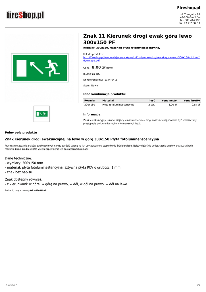 Fireshop.pl ul. Traugutta 9A 49-200 Grodków tel: 888 444 998 fax: 77 415 37 11 Znak 11 Kierunek drogi ewak góra lewo 300x150 PF Rozmiar: 300x150, Materiał: Płyta fotoluminescencyjna, link do produktu: http://fireshop.pl/uzupelniajace-ewak/znak-11-kierunek-drogi-ewak-gora-lewo-300x150-pf.html? download.pdf Cena: 8,00 zł netto 8,00 zł za szt. Nr referencyjny: 1144-04 Z Stan: Nowy Inne kombinacje produktu: Rozmiar Materiał ilość cena netto cena brutto 300x150 Płyta fotoluminescencyjna 2 szt. 8,00 zł 9,84 zł Informacje: Znak ewakuacyjny, uzupełniający wskazuje kierunek drogi ewakuacyjnej powinien być umieszczany prostopadle do kierunku ruchu informowanych ludzi. Pełny opis produktu Znak Kierunek drogi ewakuacyjnej na lewo w górę 300x150 Płyta fotoluminenscencyjna Przy rozmieszczaniu znaków ewakuacyjnych należy zwrócić uwagę na ich usytuowanie w stosunku do źródeł światła. Należy dążyć do umieszczania znaków ewakuacyjnych możliwie blisko źródła światła w celu zapewnienia ich dostatecznej luminacji Dane techniczne: - wymiary: 300x150 mm - materiał: płyta fotoluminestencyjna, sztywna płyta PCV o grubości 1 mm - znak bez napisu Znak dostępny również: - z kierunkami: w górę, w górę na prawo, w dół, w dół na prawo, w dół na lewo Zadzwoń, zapytaj doradcy tel. 888444998 7-03-2017 1/1