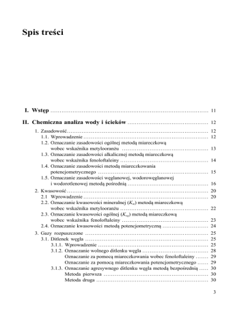 Spis treści I. Wstęp ...................................................................................... 11 II. Chemiczna analiza wody i ścieków ............................................ 12 1. Zasadowość ............................................................................. 1.1. Wprowadzenie .................................................................... 1.2. Oznaczanie zasadowości ogólnej metodą miareczkową wobec wskaźnika metylooranżu ............................................... 1.3. Oznaczanie zasadowości alkalicznej metodą miareczkową wobec wskaźnika fenoloftaleiny ................................................ 1.4. Oznaczanie zasadowości metodą miareczkowania potencjometrycznego ............................................................ 1.5. Oznaczanie zasadowości węglanowej, wodorowęglanowej i wodorotlenowej metodą pośrednią ............................................ 12 12 2. Kwasowość ............................................................................. 2.1 Wprowadzenie .................................................................... 2.2. Oznaczanie kwasowości mineralnej (Km) metodą miareczkową wobec wskaźnika metylooranżu ................................................ 2.3. Oznaczanie kwasowości ogólnej (Kog) metodą miareczkową wobec wskaźnika fenoloftaleiny ............................................... 2.4. Oznaczanie kwasowości metodą potencjometryczną ......................... 20 20 3. Gazy rozpuszczone ................................................................... 3.1. Ditlenek węgla ................................................................... 3.1.1. Wprowadzenie ............................................................ 3.1.2. Oznaczanie wolnego ditlenku węgla .................................... Oznaczanie za pomocą miareczkowania wobec fenoloftaleiny ....... Oznaczanie za pomocą miareczkowania potencjometrycznego ...... 3.1.3. Oznaczanie agresywnego ditlenku węgla metodą bezpośrednią ..... Metoda pierwsza ......................................................... Metoda druga ............................................................. 25 25 25 28 29 29 30 30 30 13 14 15 16 22 23 24 3 4 3.1.4. Oznaczanie zawartości agresywnego ditlenku węgla metodą pośrednią na podstawie wolnego CO2 i zasadowości ...... 3.1.5. Oznaczanie zawartości wolnego, przynależnego i agresywnego ditlenku węgla metodą pośrednią na podstawie wartości pH i zasadowości ............................................................. 3.1.6. Oznaczanie agresywnego ditlenku węgla metodą pośrednią na podstawie nomogramu ............................................... 3.1.7. Ocena stopnia korozyjności wody ...................................... 3.2. Ozon ............................................................................... 3.2.1. Wprowadzenie ............................................................ 3.2.2. Oznaczanie ozonu ........................................................ Przygotowanie próbki do oznaczenia ................................. Sporządzenie skali wzorców ............................................ Oznaczenie zawartości ozonu ........................................... 36 38 39 39 40 41 41 41 4. Związki nieorganiczne i właściwości wody wynikające z ich obecności ........ 4.1. Chlorki ............................................................................ 4.1.1. Wprowadzenie ............................................................ 4.1.2. Oznaczanie chlorków metodą Mohra ................................... Przygotowanie próbki do oznaczenia ................................. Nastawienie miana roztworu AgNO3 ................................... Oznaczanie chlorków .................................................... 4.1.3. Oznaczanie chlorków metodą potencjometryczną .................... Kalibracja miernika ...................................................... Oznaczenie zawartości chlorków ....................................... 4.2. Siarczany(VI) ..................................................................... 4.2.1. Wprowadzenie ............................................................ 4.2.2. Oznaczanie siarczanów(VI) metodą turbidymetryczną ............... Sporządzenie skali wzorców ............................................ Oznaczenie zawartości siarczanów(VI) ................................. 4.2.3. Oznaczanie siarczanów(VI) metodą jonitową [1] ..................... 4.2.4. Oznaczanie siarczanów(VI) metodą miareczkową .................... Nastawienie miana roztworu EDTA ................................... Oznaczenie zawartości siarczanów(VI) ................................ 42 42 42 44 45 45 45 46 47 47 47 47 49 50 50 51 52 53 53 5. Usuwanie niektórych składników z wód (ścieków) i ich oznaczanie ............ 5.1. Magan ............................................................................. 5.1.1. Wprowadzenie ............................................................ 5.1.2. Odmanganianie wody ................................................... Określenie stopnia odmanganiania wody przy zastosowaniu napowietrzania i filtracji ......................... Odmanganowienie wody za pomocą alkalizacji, napowietrzania, sedymentacji i filtracji .............................. 54 54 54 55 31 34 56 56 5.1.3. Zastosowanie aktywowanej masy do jednoczesnego odżelaziania i odmanganiania wody .................................... Filtracja techniką ciągłą .................................................. Filtracja techniką okresową .............................................. 5.1.4. Metody oznaczania manganu ............................................ Oznaczanie manganu metodą manganianową(VII) .................... Oznaczanie manganu zmodyfikowaną metodą kolorymetryczną ........................... Oznaczanie manganu metodą kolorymetryczną formaldoksymową ....................... 5.2. Żelazo ..