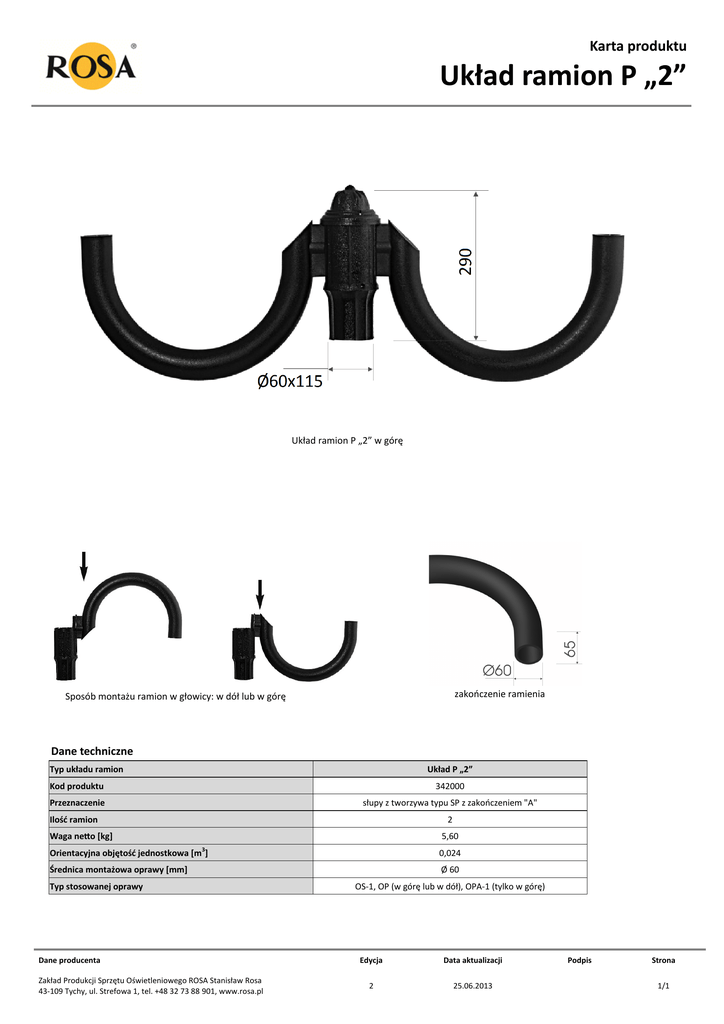 Karta produktu Układ ramion P „2” Układ ramion P „2” w górę zakończenie ramienia Sposób montażu ramion w głowicy: w dół lub w górę Dane techniczne Typ układu ramion Układ P „2” Kod produktu 342000 Przeznaczenie słupy z tworzywa typu SP z zakończeniem "A" Ilość ramion 2 Waga netto [kg] 5,60 3 Orientacyjna objętość jednostkowa [m ] 0,024 Średnica montażowa oprawy [mm] Ø 60 Typ stosowanej oprawy Dane producenta Zakład Produkcji Sprzętu Oświetleniowego ROSA Stanisław Rosa 43-109 Tychy, ul. Strefowa 1, tel. +48 32 73 88 901, www.rosa.pl OS-1, OP (w górę lub w dół), OPA-1 (tylko w górę) Edycja Data aktualizacji 2 25.06.2013 Podpis Strona 1/1
