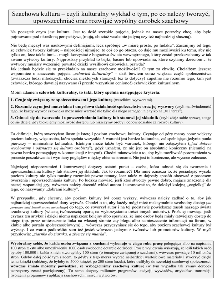 Szachowa kultura – czyli kulturalny wykład o tym, po co należy tworzyć, upowszechniać oraz rozwijać wspólny dorobek szachowy Na początek czym jest kultura. Jest to dość szerokie pojęcie, jednak na nasze potrzeby chcę, aby było pojmowane pod określoną perspektywą (moją, chociaż wcale nie jedyną czy też najbardziej słuszną). Nie będę męczył was naukowymi definicjami, lecz spróbuję „w miarę prosto, po ludzku”. Zacznijmy od tego, że człowiek tworzy kulturę – najprościej ujmując: to coś co go otacza, co daje mu możliwości ku temu, aby nie tylko on, lecz także inni… mogli korzystać z bogactwa świata wewnętrznego, który został przekształcony w tak zwane wytwory kultury. Najprostszy przykład to bajki, baśnie lub opowiadania, które czytamy dzieciom… te wytwory musiały wcześniej powstać dzięki wysiłkowi człowieka, prawda? Jak jednak będzie się to przekładało na nasze szachowe możliwości? O tym za chwilę. Chciałbym jeszcze wspomnieć o znaczeniu pojęcia „człowiek kulturalny” – dziś bowiem coraz większa część społeczeństwa (zwłaszcza ludzi młodszych, chociaż niektórych starszych też to dotyczy) zupełnie nie rozumie tego, kim jest człowiek, którego dawniej nazywano (i przede wszystkim ceniono!) człowiekiem kulturalnym. Moim zdaniem człowiek kulturalny, to taki, który spełnia następujące kryteria: 1. Czuje się związany ze społeczeństwem i jego kulturą (wszelkimi wytworami). 2. Rozumie czym jest materialna i umysłowa działalność społeczeństw oraz jej wytwory (czyli ma świadomość tego, że każdy wytwór człowieka może mieć wartość nie tylko dla niego samego i nie tylko na „tu i teraz”). 3. Odnosi się do tworzenia i upowszechniania kultury lub stanowi jej składnik (czyli zdaje sobie sprawę z tego co się dzieje, gdy blokujemy możliwość dostępu lub niszczymy osoby i odpowiedzialne za rozwój kultury). Ta definicja, którą stworzyłem ilustruje istotę i poziom szachowej kultury. Czytając od góry mamy coraz większy poziom kultury, więc osoba, która spełnia wszystkie 3 warunki jest bardzo kulturalna, zaś spełniająca jedynie punkt pierwszy – minimalnie kulturalna. Istotnym może także być warunek, którego nie załączyłem („jest dobrze wychowany i odznacza się kulturą osobistą”), gdyż uznałem, że nie jest on absolutnie konieczny (niemniej na pewno bardzo pomagający w komunikacji z innymi). Chodzi mianowicie o to, aby była możliwość porozumienia w procesie poszukiwania i wymiany poglądów między obiema stronami. Nie jest to konieczne, ale wysoce zalecane. Najwięcej nieporozumień i kontrowersji dotyczy ostatni punkt – osoba, która odnosi się do tworzenia i upowszechniania kultury lub stanowi jej składnik. Jak to rozumieć? Dla mnie oznacza to, że posiadając wysoki poziom kultury nie tylko musimy rozumieć pewne tematy, lecz także w dojrzały sposób obcować z procesem tworzenia i upowszechniania kultury. Po ludzku mówiąc, jeśli ktoś stworzy pewne dobro, mające znaczenie dla naszej wspaniałej gry, wówczas należy docenić wkład autora i uszanować to, że dołożył kolejną „cegiełkę” do tego, co nazywamy „dobrami kultury”. W przypadku, gdy chcemy, aby poziom kultury był coraz wyższy, wówczas należy zadbać o to, aby jak najbardziej upowszechniać dany wytwór. Chodzi o to, aby każdy mógł mieć maksymalnie swobodny dostęp [nie poruszam tutaj kwestii prawa autorskiego] do tego, co stworzył autor i na tej podstawie powiększać zasób naszego świata szachowej kultury (własną twórczością opartą na wykorzystaniu treści innych autorów). Prościej mówiąc: jeśli czytasz ten artykuł i dzięki niemu napiszesz kolejny albo sprawisz, że inne osoby będą miały łatwiejszy dostęp do niego (np. przez umieszczenie linka na własnej stronie czy blogu albo zamieszczenie informacji na forum, w klubie albo portalu społecznościowym)… wówczas przyczyniasz się do tego, aby poziom szachowej kultury był wyższy. I co warto podkreślić: sam też jesteś wówczas jednym z twórców lub promotorów kultury. W myśl przysłowia: „ziarnko do ziarnka, a zbierze się miarka”. Wyobraźmy sobie, że każda osoba związana z szachami wykonuje w ciągu roku pracę polegającą albo na napisaniu 100 stron tekstu albo umożliwieniu 1000 osób swobodne dotarcie do źródeł. Proste wyliczenia wskazują, że jeśli takich osób byłoby 100.000 i każda z nich stworzyłaby 100 stron (o tematyce związanej z szachami), wówczas powstaje 10 milionów stron. Gdyby dalej pójść tym śladem, to gdyby z tego morza wybrać najbardziej wartościowe materiały i stworzyć dzięki temu książki (załóżmy, że byłoby to 5000 książek po 200 stron każda), które trafiłyby do szerokiej szachowej społeczności, wówczas śmiało możemy powiedzieć, że wzbogaciliśmy szachową kulturę (w tym wypadku tak zwany dorobek teoretyczny został powiększony). To samo dotyczy milionów programów, audycji, wywiadów, artykułów, transmisji, tworzenia programów i aplikacji szachowych i innych wytworów. Z kolei tworzenie i upowszechnianie nie są łatwymi zadaniami – oba wymagają wysiłku, zaangażowania i tak zwanej „siły przebicia”. Cóż z tego, że stworzę genialne dzieło, skoro schowam je do szuflady? I odwrotnie – jaki zysk (jaka korzyść) będzie z tego jeśli stworzone dzieło będzie znakomicie upowszechniane, lecz będzie miało bardzo niską wartość? Dlatego trzeba zadbać o obie strony medalu. Z jednej strony tworzyć coś co będzie miało wartość i sens dla świata (odbiorców) kultury, a z drugiej dążyć do tego, aby każdy zainteresowany mógł dotrzeć do tego czego sam nie jest w stanie stworzyć. Ostatni element, to osoba, która stanowi (istotny) składnik kultury – czyli po prostu autorzy (twórcy), którzy dzielą się swoją wiedzą, doświadczeniem oraz wszelką twórczością. Przykład