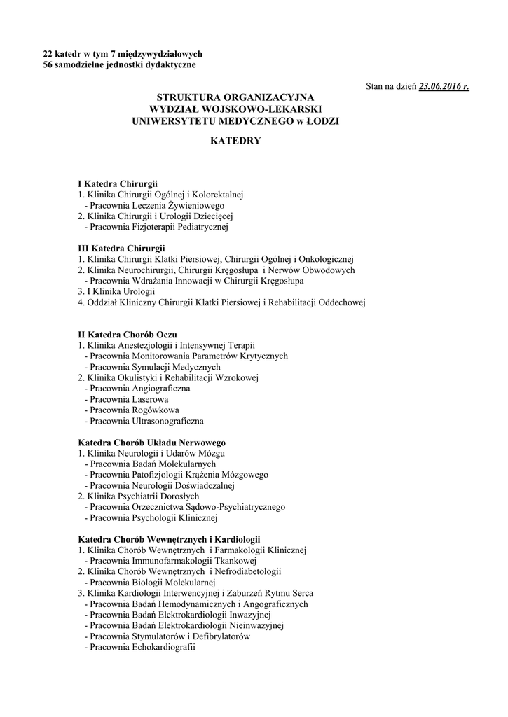 22 katedr w tym 7 międzywydziałowych 56 samodzielne jednostki dydaktyczne Stan na dzień 23.06.2016 r. STRUKTURA ORGANIZACYJNA WYDZIAŁ WOJSKOWO-LEKARSKI UNIWERSYTETU MEDYCZNEGO w ŁODZI KATEDRY I Katedra Chirurgii 1. Klinika Chirurgii Ogólnej i Kolorektalnej - Pracownia Leczenia Żywieniowego 2. Klinika Chirurgii i Urologii Dziecięcej - Pracownia Fizjoterapii Pediatrycznej III Katedra Chirurgii 1. Klinika Chirurgii Klatki Piersiowej, Chirurgii Ogólnej i Onkologicznej 2. Klinika Neurochirurgii, Chirurgii Kręgosłupa i Nerwów Obwodowych - Pracownia Wdrażania Innowacji w Chirurgii Kręgosłupa 3. I Klinika Urologii 4. Oddział Kliniczny Chirurgii Klatki Piersiowej i Rehabilitacji Oddechowej II Katedra Chorób Oczu 1. Klinika Anestezjologii i Intensywnej Terapii - Pracownia Monitorowania Parametrów Krytycznych - Pracownia Symulacji Medycznych 2. Klinika Okulistyki i Rehabilitacji Wzrokowej - Pracownia Angiograficzna - Pracownia Laserowa - Pracownia Rogówkowa - Pracownia Ultrasonograficzna Katedra Chorób Układu Nerwowego 1. Klinika Neurologii i Udarów Mózgu - Pracownia Badań Molekularnych - Pracownia Patofizjologii Krążenia Mózgowego - Pracownia Neurologii Doświadczalnej 2. Klinika Psychiatrii Dorosłych - Pracownia Orzecznictwa Sądowo-Psychiatrycznego - Pracownia Psychologii Klinicznej Katedra Chorób Wewnętrznych i Kardiologii 1. Klinika Chorób Wewnętrznych i Farmakologii Klinicznej - Pracownia Immunofarmakologii Tkankowej 2. Klinika Chorób Wewnętrznych i Nefrodiabetologii - Pracownia Biologii Molekularnej 3. Klinika Kardiologii Interwencyjnej i Zaburzeń Rytmu Serca - Pracownia Badań Hemodynamicznych i Angograficznych - Pracownia Badań Elektrokardiologii Inwazyjnej - Pracownia Badań Elektrokardiologii Nieinwazyjnej - Pracownia Stymulatorów i Defibrylatorów - Pracownia Echokardiografii Katedra Chorób Wewnętrznych i Zakaźnych 1. Klinika Chorób Wewnętrznych i Rehabilitacji Kardiologicznej 2. Klinika Chorób Zakaźnych i Chorób Wątroby 3. Klinika Gastroenterologii - Pracownia Dietetyki Katedra Dermatologii 1. Klinika Dermatologii, Dermatologii Dziecięcej i Onkologicznej Katedra Nauk Podstawowych 1. Zakład Biologii i Genetyki Medycznej 2. Zakład Biologii Środowiskowej 3. Zakład Fizjologii Człowieka 4. Zakład Patofizjologii i Immunologii Klinicznej Katedra Nauk Wojskowo-Medycznych 1. Zakład Edukacji Obronnej i Koordynacji Kształcenia - Pracownia Toksykologii Wojskowej i Ochrony Radiologicznej 2. Zakład Epidemiologii i Zdrowia Publicznego 3. Zakład Historii Medycyny, Farmacji i Medycyny Wojskowej 4. Zakład Chirurgii Wojskowej Katedra Nefrologii i Nadciśnienia Tętniczego 1. Klinika Nefrologii, Nadciśnienia Tętniczego i Medycyny Rodzinnej - Pracownia Endoskopii Przewodu Pokarmowego - Uniwersyteckie Centrum Dializoterapii 2. Klinika Rehabilitacji i Medycyny Fizykalnej 3. Zakład Interny Wojskowej 4. Zakład Nadciśnienia Tętniczego - Pracownia Biologii Molekularnej Katedra Ortopedii, Traumatologii i Rehabilitacji Pourazowej 1. Klinika Artroskopii, Chirurgii Małoinwazyjnej i Traumatologii Sportowej 2. Klinika Chirurgii Ręki 3. Klinika Ortopedii i Traumatologii 4. Zakład Biomechaniki i Zaopatrzenia Protetyczno–Ortopedycznego 5. Klinika Rehabilitacji Ortopedycznej i Pourazowej ( KL114) II Katedra Otolaryngologii 1. Klinika Chirurgii Nowotworów Głowy i Szyi - Pracownia Foniatryczno - Rehabilitacyjna 2. Klinika Chirurgii Szczękowo-Twarzowej 3. Klinika Otolaryngologii, Onkologii Laryngologicznej, Audiologii i Foniatrii -Pracownia Dydaktyki Fizjoterapii -Pracownia Otoneurologiczna 4. Zakład Alergologii i Rehabilitacji Oddechowej Katedra Pediatrii i Immunologii Wieku Rozwojowego 1. Klinika Pediatrii, Kardiologii Prewencyjnej i Immunologii Wieku Rozwojowego - Pracownia Kardiologii Sportowej 2. Zakład Dydaktyki Pediatrycznej Katedra Położnictwa, Ginekologii i Ginekologii Onkologicznej 1. Klinika Ginekologii Operacyjnej i Endoskopowej 2. Klinika Położnictwa i Perinatologii Katedra Rehabilitacji 1. Klinika Chorób Układu Pozapiramidowego 2. Klinika Rehabilitacji Medycznej - Pracownia Ergonomii i Fizjologii Wysiłku Fizycznego 3. Zakład Medycyny Fizykalnej - Pracownia Arteterapii - Pracownia Fizjoterapii 4. Zakład Metodyki Nauczania Ruchu 5. Zakład Rehabilitacji Psychospołecznej Międzywydziałowa Katedra Anatomii i Histologii 1. Zakład Histologii i Embriologii Międzywydziałowa Katedra Badań Obrazowych i Radiologii 1. Zakład Diagnostyki i Terapii Radiologicznej i Izotopowej Międzywydziałowa Katedra Chemii i Biochemii Medycznej 1. Zakład Chemii i Biochemii Klinicznej - Pracownia Genetyki Medycznej - Pracownia Chemii Medycznej Międzywydziałowa Katedra Diagnostyki Laboratoryjnej i Molekularnej 1. Zakład Biochemii Hormonów 2. Zakład Diagnostyki Laboratoryjnej i Biochemii Klinicznej 3. Zakład Neuroendokrynologii - Pracownia Mikroskopii Elektronowej - Pracownia Immunohistochemii - Pracownia Diagnostyki Hormonalnej Międzywydziałowa Katedra Farmakologii Ogólnej i Klinicznej 1. Zakład Farmakologii i Toksykologii Międzywydziałowa Katedra Fizjologii Doświadczalnej, Klinicznej i Toksykologii 1. Zakład Biofizyki Międzywydziałowa Katedra Patomorfologii 1. Zakład Patomorfologii i Cytopatologii Klinicznej ODDZIAŁY 1. Oddział ds. Szkolenia Wojskowo-Lekarskiego