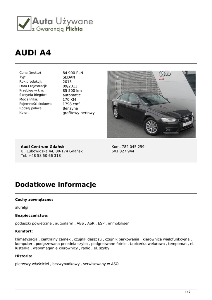 AUDI A4 Cena (brutto) Typ: Rok produkcji: Data I rejestracji: Przebieg w km: Skrzynia biegów: Moc silnika: Pojemność skokowa: Rodzaj paliwa: Kolor: 84 900 PLN SEDAN 2013 09/2013 85 500 km automatic 170 KM 1798 cm3 Benzyna grafitowy perłowy Audi Centrum Gdańsk Ul. Lubowidzka 44, 80-174 Gdańsk Tel. +48 58 50 66 318 Kom. 782 045 259 601 827 944 Dodatkowe informacje Cechy zewnętrzne: alufelgi Bezpieczeństwo: poduszki powietrzne , autoalarm , ABS , ASR , ESP , immobiliser Komfort: klimatyzacja , centralny zamek , czujnik deszczu , czujnik parkowania , kierownica wielofunkcyjna , komputer , podgrzewana przednia szyba , podgrzewane fotele , tapicerka welurowa , tempomat , el. lusterka , wspomaganie kierownicy , radio , el. szyby Historia: pierwszy właściciel , bezwypadkowy , serwisowany w ASO 1/2 Gwarancja Szanowni Państwo, Pragniemy Państwa poinformować, iż firma Plichta – Autoryzowany Dealer Škoda Auto prowadzi skup oraz sprzedaż samochodów używanych wszystkich marek, oferując także samochody używane z gwarancją objęte programem „Auta używane z Gwarancją Plichta”. W ramach programu „Auta Używane z Gwarancją Plichta ” każdy Klient otrzymuje atrakcyjny pakiet zniżek pozwalający zoptymalizować koszty eksploatacji samochodu: -50% na serwis klimatyzacji -50% na ustawienie zbieżności -50% na kosmetykę auta -50% na ścieżkę diagnostyczną -25% na wymiany oleju -25% na zakup opon + 5zł na sezon za hotelowanie opon -15% na części i akcesoria Oferujemy również kompleksową obsługę w zakresie finansowania i ubezpieczenia: - kredyty już od 4,99% - leasingi i kredyty bez zaświadczeń - uproszczone procedury – decyzja już od 30 min. - atrakcyjne pakiety AC/OC/NW/ASS wiodących firm ubezpieczeniowych Możliwość pozostawienia dotychczas użytkowanego auta w rozliczeniu – BEZPŁATNA WYCENA!!! Zapraszamy wszystkich Klientów na jazdę próbną wybranym autem. Numer oferty: G107 Informacja nie stanowi oferty w rozumieniu art. 66 KC. Podane dane mają charakter wyłącznie informacyjny. 2/2 Powered by TCPDF (www.tcpdf.org)