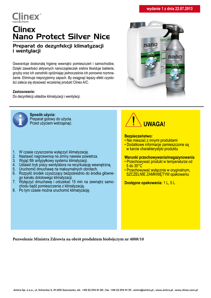 wydanie 1 z dnia 22.07.2013 Clinex Nano Protect Silver Nice Preparat do dezynfekcji klimatyzacji i wentylacji Gwarantuje doskonałą higienę wewnątrz pomieszczeń i samochodów, Dzięki zawartości aktywnych nanocząsteczek srebra likwiduje bakterie, grzyby oraz ich zarodniki opóźniając jednocześnie ich ponowne rozmnażanie. Eliminuje nieprzyjemny zapach. By osiągnąć lepszy efekt czystości zaleca się stosować wcześniej produkt Clinex A/C. Zastosowanie: Do dezynfekcji układów klimatyzacji i wentylacji. Sposób użycia: Preparat gotowy do użycia. Przed użyciem wstrząsnąć. 1. 2. 3. 4. 5. 6. W czasie czyszczenia wyłączyć klimatyzację. Nastawić nagrzewnicę na zimny nawiew powietrza. Wyjąć filtr antypyłkowy systemu klimatyzacji. Ustawić tryb pracy wentylatora na recyrkulację wewnętrzną. Uruchomić dmuchawę na maksymalnych obrotach. Rozpylić środek czyszczący bezpośrednio do środka głównego kanału dolotowego klimatyzacji. 7. Wyłączyć dmuchawę i odczekać 15 min na zewnątrz samochodu bądź pomieszczenia z klimatyzacją. 8. Po tym czasie można uruchomić klimatyzację. UWAGA! Bezpieczeństwo: • Nie mieszać z innymi produktami • Dodatkowe informacje zamieszczone są w karcie charakterystyki produktu Warunki przechowywania/magazynowania • Przechowywać produkt w temperaturze od 5 do 30°C • Przechowywać wyłącznie w oryginalnym, SZCZELNIE ZAMKNIĘTYM opakowaniu Dostępne opakowania: 1 L, 5 L Pozwolenie Ministra Zdrowia na obrót produktem biobójczym nr 4008/10 Amtra Sp. z o.o., ul. Schonów 3, 41-200 Sosnowiec, tel. +48 32 294 41 00 , fax +48 32 294 41 39 , [email protected] , www.amtra.pl , www.clinex.com.pl