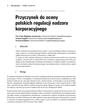 2 | Artykuły | MBA 6/2010 | „Master of Business Administration” 6/2010 (115): s. 2–15, ISSN 1231-0328, Copyright by Akademia Leona Koźmińskiego Przyczynek do oceny polskich regulacji nadzoru korporacyjnego Prof. dr hab. Magdalena Jerzemowska | Uniwersytet Gdański | [email protected] Dr Kevin Campbell | University of Stirling | [email protected] Dr Krzysztof Najman | Uniwersytet Gdański | [email protected] | Abstrakt Celem artykułu jest przedstawienie analizy i oceny polskiego nadzoru korporacyjnego w oparciu o wyniki własnego badania ankietowego rozesłanego do wszystkich spółek notowanych na GPW w Warszawie w 2008 roku. Z uwagi na mały odsetek odesłanych ankiet przedstawiona analiza ma charakter wstępny i nie pozwala na sformułowanie wniosków reprezentatywnych dla polskiego rynku kapitałowego. Wykazała ona jednakże, że badane spółki są zainteresowane rozwojem nadzoru korporacyjnego i prezentują własne, zróżnicowane opinie na temat jego jakości. | Wstęp W ostatnich burzliwych dekadach na świecie następuje eskalacja zainteresowania nadzorem korporacyjnym. Od lat, a szczególnie w momentach pojawiania się kryzysów, podejmuje się wiele działań mających na celu jego reformowanie i doskonalenie, warunkujące sanacje przedsiębiorstw i gospodarek. Jednakże głęboki, globalny kryzys finansowy, który rozpoczął się w 2007 roku, ujawnił poważne słabości nadzoru korporacyjnego. Eksperci uznali, że to właśnie najsłabsze ogniwa corporate governance implikowały ten kryzys (Kirkpatrick 2009). Koniecznością stało się przeprowadzenie reform strukturalnych, ponieważ do kryzysowej, dramatycznej sytuacji doprowadziły interakcje wielu czynników, wśród których prominentną pozycję zajęły zasady wynagradzania menedżerów, zarządzanie ryzykiem, działanie rad korporacji, brak oceny wyników działania rad, słabe egzekwowanie uprawnień przez akcjonariuszy, zmiany w zakresie wymogów kapitałowych, a także wpływ tych czynników na regulacje podatkowe i struktury korporacji (The Financial Crisis, 2009). MBA 6/2010 | Artykuły | 3 Do strategicznych priorytetów w obszarze corporate governance, warunkujących odbudowę publicznego zaufania do rynków finansowych, należy zaliczyć zwiększenie skuteczności regulacji, nacisk na reguły ostrożności prowadzenia działalności i wzmocnienie motywacji do ich wdrażania oraz zwiększenie integralności i przejrzystości rynków finansowych. Priorytetem powinno być również doskonalenie publikacji informacji, zabezpieczenie przed oszustwami i wzmacnianie nadzoru korporacyjnego. Realizacja tego ostatniego obszaru polega na maksymalizacji stopnia przestrzegania przez firmy (szczególnie te, które otrzymały publiczne pieniądze) Zasad nadzoru korporacyjnego OECD (Dobre praktyki spółek notowanych na GPW…, 2007). Rządom zalecano udoskonalenie reguł i wskazówek dotyczących corporate governance. Pierwotnie planowano szybką i głęboką korektę stanowiących wzorzec Zasad nadzoru korporacyjnego OECD, która miała nastąpić jesienią 2009 roku. Jednakże w konsekwencji badań skonstatowano, że to nie słabości zasad nadzoru korporacyjnego, ale ich niewłaściwe implementowanie stało się przyczyną kryzysu. Powstała zatem konieczność wzmocnienia procesów monitorowania ich wdrażania oraz zrewidowania niektórych mechanizmów corporate governance. OECD Steering Group on Corporate Governance w kwietniu 2009 roku dokonała oceny sytuacji w tym zakresie i sformułowała odpowiednie rekomendacje. W tym świetle znaczenia nabiera ocena regulacji nadzoru korporacyjnego i ich implementacji w Polsce, będącej członkiem OECD. Kryzys finansowy w mniejszym stopniu niż w innych rozwiniętych krajach świata wpłynął na polski rynek finansowy. Można się zatem zastanawiać, czy przyczyną tego jest adekwatny system corporate governance, czy też jest to spowodowane innymi czynnikami. Celem niniejszego opracowania jest przedstawienie ocen nadzoru korporacyjnego w Polsce, formułowanych przez menedżerów spółek giełdowych, na podstawie wyników własnego badania ankietowego, rozesłanego do wszystkich spółek notowanych na Giełdzie Papierów Wartościowych (GPW) w Warszawie w 2008 roku. Ankieta została opracowana na podstawie obowiązujących Dobrych praktyk spółek giełdowych 2008. | Zarys rozwoju polskich regulacji nadzoru korporacyjnego i próby ich oceny Historia kodeksów dobrych praktyk w Polsce sięga 2001 roku1. Jednakże dopiero w 2002 roku przyjęto Dobre praktyki w spółkach publicznych, które ujmowały pięć zasad nadzoru korporacyjnego oraz 48 rekomendacji dotyczących funkcjonowania walnego zgromadzenia, rady nadzorczej i zarządu oraz relacji z instytucjami zewnętrznymi (Dobre praktyki w spółkach publicznych w 2002 roku, 2002). Prawie wszystkie spółki giełdowe zadeklarowały przestrzeganie większości zasad dobrych praktyk. Jednocześnie wprowadzono obowiązek publikowania przez nie w rapor1 Komitet Dobrych Praktyk, który powstał przy Giełdzie Papierów Wartościowych w Warszawie, opracował Dobre praktyki w spółkach publicznych 2002, tzw. Kodeks Warszawski. Równolegle Polskie Forum Corporate Governance przy Instytucie Badań nad Gospodarką Rynkową w Gdańsku w tym samym czasie opracowało Kodeks nadzoru korporacyjnego dla spółek publicznych, tzw. Kodeks Gdański (Kodeks nadzoru korporacyjnego dla spółek publicznych. Polskie Forum Corporate Governance, Instytut Badań nad Gospodarką Rynkową, Gdańsk 2002). 4 | Artykuły | MBA 6/2010 cie rocznym (w terminie do końca lipca) oświadczeń o stosowaniu zasad nadzoru korporacyjnego, opracowanych przy zastosowaniu zasady comply or explain (Cadbury Code, 1992). W konsekwencji skandali, które wstrząsnęły gospodarką światową na początku XXI wieku, ujawniły się słabości międzynarodowych i krajowych regulacji nadzoru korporacyjnego. Reakcją na nie stało się powszechne doskonalenie, a w zasa