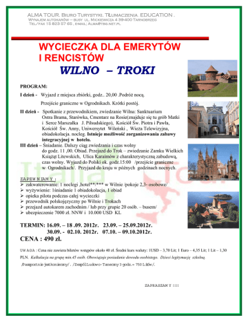 ALMA TOUR. Biuro Turystyki. Tàumaczenia . EDUCATION . Wynajem autokarów – busy ul. Mickiewicza 4 39-400 Tarnobrzeg Tel/fax 15 823 57 65 , e-mail; [email protected] WYCIECZKA DLA EMERYTÓW I RENCISTÓW WILNO – TROKI PROGRAM: I dzieĔ - Wyjazd z miejsca zbiórki, godz.. 20,00 .PodróĪ nocą. PrzejĞcie graniczne w Ogrodnikach. Krótki postój. II dzieĔ - Spotkanie z przewodnikiem, zwiedzanie Wilna: Sanktuarium Ostra Brama, Starówka, Cmentarz na Rosie(znajduje siĊ tu grób Matki i Serce Marszaáka J. Piásudskiego), KoĞcióá ĝw. Piotra i Pawáa, KoĞcióá ĝw. Anny, Uniwersytet WileĔski , WieĪa Telewizyjna, obiadokolacja. nocleg. Istnieje moĪliwoĞü zorganizowania zabawy integracyjnej w hotelu. III dzieĔ – ĝniadanie. Dalszy ciąg zwiedzania i czas wolny do godz. 11 ,00. Obiad. Przejazd do Trok – zwiedzanie Zamku Wielkich KsiąĪąt Litewskich, Ulica Karaimów z charakterystyczną zabudową, czas wolny. Wyjazd do Polski ok. godz.15:00 /przejĞcie graniczne w Ogrodnikach/. Przyjazd do kraju w póĨnych godzinach nocnych. ZAPEW N IAM Y : ¾ zakwaterowanie: 1 noclegi ,hotel**/*** w Wilnie /pokoje 2,3- osobowe/ ¾ wyĪywienie: 1Ğniadanie 1 obiadokolacja, 1 obiad ¾ opieka pilota podczas caáej wycieczki ¾ przewodnik polskojĊzyczny po Wilnie i Trokach ¾ przejazd autokarem zachodnim / lub przy grupie 20 osób. – busem/ ¾ ubezpieczenie 7000 zá. NNW i 10.000 USD KL TERMIN: 16.09. – 18 .09. 2012r. 23.09. – 25.09.2012r. 30.09. - 02.10. 2012r. 07.10. – 09.10.2012r. CENA : 490 zá. U W AG A : Cena nie zawiera biletów wstĊpów okoáo 40 zá. ĝredni kurs waluty: 1USD – 3,70 Lit; 1 Euro – 4,35 Lit; 1 Lit – 1,30 PLN. Kalkulacja na grupĊ min.45 osób. Obowiązuje posiadanie dowodu osobistego. Dzieci legitymacjĊ szkolną. /Paszportnie jestkonieczny/. /ZespólLudowo-Taneczny 3 godz.= 750 Litów/. ZAPRASZAM Y !!!!