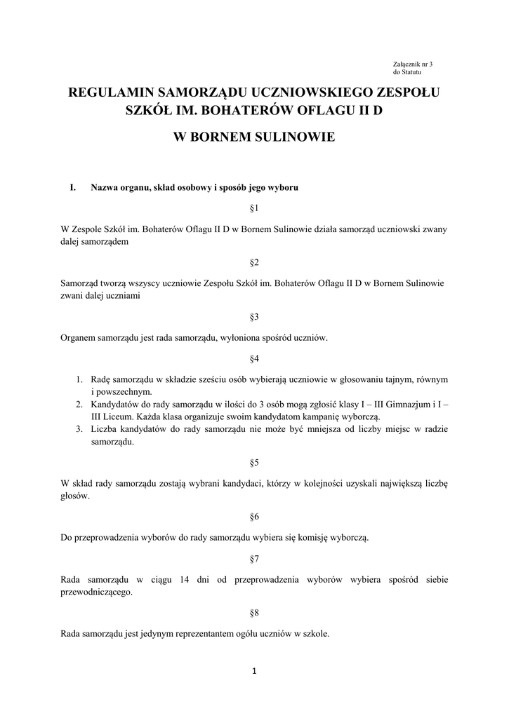 Załącznik nr 3 do Statutu REGULAMIN SAMORZĄDU UCZNIOWSKIEGO ZESPOŁU SZKÓŁ IM. BOHATERÓW OFLAGU II D W BORNEM SULINOWIE I. Nazwa organu, skład osobowy i sposób jego wyboru §1 W Zespole Szkół im. Bohaterów Oflagu II D w Bornem Sulinowie działa samorząd uczniowski zwany dalej samorządem §2 Samorząd tworzą wszyscy uczniowie Zespołu Szkół im. Bohaterów Oflagu II D w Bornem Sulinowie zwani dalej uczniami §3 Organem samorządu jest rada samorządu, wyłoniona spośród uczniów. §4 1. Radę samorządu w składzie sześciu osób wybierają uczniowie w głosowaniu tajnym, równym i powszechnym. 2. Kandydatów do rady samorządu w ilości do 3 osób mogą zgłosić klasy I – III Gimnazjum i I – III Liceum. Każda klasa organizuje swoim kandydatom kampanię wyborczą. 3. Liczba kandydatów do rady samorządu nie może być mniejsza od liczby miejsc w radzie samorządu. §5 W skład rady samorządu zostają wybrani kandydaci, którzy w kolejności uzyskali największą liczbę głosów. §6 Do przeprowadzenia wyborów do rady samorządu wybiera się komisję wyborczą. §7 Rada samorządu w ciągu 14 dni od przeprowadzenia wyborów wybiera spośród siebie przewodniczącego. §8 Rada samorządu jest jedynym reprezentantem ogółu uczniów w szkole. 1 §9 Kadencja rady samorządu trwa jeden rok tj. do czasu wyłonienia nowej rady samorządu w następnym roku szkolnym. §10 Doradcą, koordynatorem rady samorządu jest nauczyciel – opiekun, wybrany przez radę samorządu. II. Cele i zadania oraz kompetencje samorządu §11 Samorząd może przedstawić radzie rodziców, radzie pedagogicznej oraz dyrektorowi Zespołu Szkół wnioski i opinie we wszystkich sprawach Zespołu Szkół, a w szczególności dotyczących realizacji podstawowych spraw uczniów, takich jak: 1) Prawo do zapoznania się z programem nauczania, jego treścią, celem i stawianymi wymaganiami, 2) Prawo do jawnej i umotywowanej oceny postępów w nauce i zachowaniu, 3) Prawo do organizacji życia szkolnego, umożliwiającego zachowanie właściwych proporcji między wysiłkiem szkolnym a możliwością rozwijania i zaspokajania własnych zainteresowań, 4) Prawo do redagowania i wydawania gazetki szkolnej, 5) Prawo do organizowania działalności kulturalnej, oświatowej, sportowej oraz rozrywkowej zgodnie z własnymi potrzebami i możliwościami organizacyjnymi, w porozumieniu z dyrektorem Zespołu Szkół, 6) Prawo wyboru nauczyciela pełniącego rolę opiekuna samorządu. III. Tryb podejmowania uchwał oraz sposób dokumentowania protokołowania działalności rady samorządu §12 1. Uchwały rada samorządu przyjmuje zwykłą większością głosów, przy obecności co najmniej połowy swego składu. Przy równej liczbie głosów, decyduje głos przewodniczącego posiedzenia rady samorządu. IV. Ramowy plan działania rady samorządu §13 1. Rada samorządu opracowuje plan pracy na całą kadencję. 2. Posiedzenia rady samorządu zwołuje przewodniczący rady nie rzadziej niż raz w miesiącu. 3. Posiedzenie rady samorządu może być zwoływane także na wniosek 1/3 składu rady, opiekuna samorządu i dyrektora Zespołu Szkół im. Bohaterów Oflagu II D 2 Zasady gromadzenia i wydatkowania funduszy rady samorządu V. §14 1. Rada samorządu jest uprawniona do gromadzenia funduszy na swoją działalność. 2. Nadzór nad funduszami rady samorządu sprawuje opiekun samorządu i dyrektor Zespołu Szkół im. Bohaterów Oflagu II D. §15 Fundusze rady samorządu przeznaczone są w szczególności na: 1) upominki dla uczniów klas I z okazji ślubowania, 2) Dzień Edukacji Narodowej, 3) Międzynarodowy Dzień Dziecka, 4) działalność charytatywną, 5) dofinansowanie wycieczek, biwaków, rajdów, itp., 6) upominki dla wyróżniających się uczniów, 7) upominki dla absolwentów, 8) wypadki losowe, 9) nagrody konkursów, zawodów, olimpiad, itp., 10) dofinansowanie imprez kulturalnych np. koncerty, teatr, kino. §16 Źródłami dochodów rady samorządu mogą być: 1) 2) 3) 4) dyskoteki szkolne, loterie fantowe, zbiórki i sprzedaż surowców wtórnych, prace zlecone. §17 1. W szkole działa rzecznik praw ucznia. 2. Zakres kompetencji rzecznika praw ucznia, jego wybór określa regulamin stanowiący załącznik nr 5 do Statutu Zespołu Szkół. VI. Postanowienia końcowe §18 Rada samorządu ma prawo odwołania się do dyrektora Zespołu Szkół im. Bohaterów Oflagu II D w sprawie zmiany opiekuna samorządu w trakcie trwania kadencji. §19 Regulamin samorządu uczniowskiego nie może być sprzeczny ze statutem. 3 §20 Regulamin samorządu uczniowskiego jest uchwalany przez ogół uczniów. §21 Zmiany w regulaminie dokonuje się w formie aneksu w trybie przyjętym dla jego uchwalenia. 4