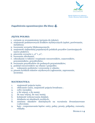 Szkoła Podstawowa Salomon Pawła i Marzeny Zakrzewskich Zagadnienia egzaminacyjne dla klasy 4. JĘZYK POLSKI: 1. czytanie ze zrozumieniem (pytania do tekstu); 2. znajomość podstawowych środków stylistycznych (epitet, porównanie, metafora); 3. tworzenie wyrazów bliskoznacznych; 4. znajomość najbardziej popularnych polskich przysłów (zawierających nazwy ptaków); 5. pisownia wyrazów z „ó” i „u”; 6. tworzenie zdrobnień; 7. odszukanie w tekście i wypisanie rzeczowników, czasowników, przymiotników, przysłówków; 8. tworzenie przysłówków do podanych przymiotników; 9. podział rzeczowników na własne i pospolite; 10. wskazanie podmiotu i orzeczenia w zdaniu; 11. pisanie krótkich tekstów użytkowych (ogłoszenie, zaproszenie, życzenia). MATEMATYKA: 1. 2. 3. 4. 5. 6. 7. 8. 9. znajomość pojęcia tuzin; obliczanie czasu, znajomość pojęcia kwadrans ; cyfry rzymskie; o ile więcej, o ile mniej; ile razy więcej, ile razy mniej; kolejność wykonywania działań; działania na ułamkach zwykłych; zamiana ułamków dziesiętnych na wyrażenia dwumianowane i odwrotnie; kąty - rozpoznawanie kątów: ostry, pełny, prosty, półpełny, rozwarty, wklęsły; Strona 1 z 4 10. 11. 12. 13. 14. koło – środek, promień, cięciwa, średnica; skala - obliczanie rzeczywistej odległości na podstawie skali; obliczanie pola powierzchni całkowitej prostopadłościanu; dzielenie sposobem pisemnym; zadania tekstowe PRZYRODA 1. 2. 3. 4. 5. 6. 7. 8. 9. 10. 11. 12. 13. 14. 15. 16. 17. 18. 19. Na podstawie przedstawionej piramidy żywieniowej opowiedz o zasadach zdrowego odżywiania się. Wymień zmysły którymi komunikujemy się z otaczającym środowiskiem, który jest najważniejszy w procesie poznawania środowiska. Jakie przyrządy służą do prowadzenia obserwacji przyrodniczych. Zanieczyszczenie i ochrona środowiska. Jak można wskazać kierunek północny, jakie przyrządy służą do wskazania kierunku. Co to są znaki topograficzne i do czego służą. Czym rożni się skala liczbowa od mianowanej, co to jest podziałka liniowa? Wymień jakie znasz wklęsłe i wypukłe formy terenu. Co możemy odczytać z mapy poziomicowej? Do czego służą kolory na mapie hipsometrycznej? Jak nazywają się procesy zmian stanów skupienia wody? Wymień daty rozpoczęcia kalendarzowych pór roku. Wymień składniki pogody, jakimi przyrządami dokonujemy pomiarów poszczególnych składników pogody. Omów bieg rzeki w poszczególnych jej odcinkach. Omów cyrkulację wody w jeziorze na przestrzeni roku kalendarzowego. W jaki sposób porosty są wskaźnikiem zanieczyszczenia środowiska? Drzewa iglaste czy liściaste są bardziej odporne na zanieczyszczenia? Dlaczego? Jak nazywa się proces w wyniku którego rośliny z wody i dwutlenku węgla pobieranych ze środowiska, wytwarzają substancje pokarmowe oraz tlen? Podaj przykłady organizmów które są pierwszym ogniwem łańcuchów pokarmowych, czyli producentami? Strona 2 z 4 HISTORIA 1. 2. 3. 4. 5. 6. 7. 8. 9. 10. 11. 12. 13. 14. 15. 16. 17. 18. 19. Czym zajmuje się archeologia? Jakie instytucje zajmują się ochroną zabytków (muzea, skanseny, archiwa, biblioteki)? Jakim kalendarzem obecnie się posługujemy? Podaj przykłady źródeł historycznych. Wymień symbole narodowe. Wyjaśnij pojęcia: rodzina, ród, naród, drzewo genealogiczne. Wymień państwa sąsiadujące z Polską. Jakie znasz legendy dotyczące/ związane z historią powstania naszego państwa? Wymień nazwy krain historyczno-geograficznych Polski. Jakie plemiona zamieszkiwały te krainy? Które rzeki miały wpływ na życie starożytnych Babilończyków, Egipcjan, Sumerów? Wymień przedstawicieli kultury starożytnej Grecji. Jaka legenda jest związana z powstaniem starożytnego Rzymu? Do czego służyły akwedukty, termy i areny? Kiedy miał miejsce chrzest Polski? Kto był pierwszym władcą a kto pierwszym królem Polski? Wymień cechy charakterystyczne budowli romańskich i gotyckich. Jakie wydarzenie, rozpoczęło rozbicie dzielnicowe w Polsce? Kiedy panował król Kazimierz Wielki? Dlaczego ma taki przydomek? Co wydarzyło się w czasie zjazdu w Gnieźnie w roku 1000? INFORMATYKA 1. 2. 3. Wymień urządzenia zestawu komputerowego. Jaki element jest najważniejszy? Co należy zainstalować w pierwszej kolejności, aby komputer działał? Wymień programy graficzne dołączone do systemu operacyjnego Windows. Strona 3 z 4 4. 5. 6. 7. 8. 9. 10. 11. 12. Wymień programy do edycji tekstów dołączone do systemu operacyjnego Windows. Czym różni się ikona programu od ikony skrótu do niego? Wymień urządzenia wejściowe i wyjściowe - czym one się różnią? Do czego służy program MS Paint? Co to jest Netbook i do czego służy? Czym różni się od laptopa i tableta? Wymień rodzaje pamięci trwałej i nietrwałej. Co to jest BIOS RAM i ROM? Jakie znasz programy do przeglądania zasobów Internetu? Wymień rodzaje gniazd komputrowych. Strona 4 z 4