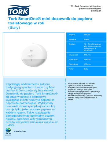 T9 - Tork Smartone Mini system papieru toaletowego w odcinkach Tork SmartOne® mini dozownik do papieru toaletowego w roli (Biały) Zapobiegaj nadmiernemu zużyciu tradycyjnego papieru Jumbo czy Mini Jumbo, który rozwija się bez kontroli. Dozowniki do papieru Tork SmartOne® są łatwe w użyciu a dodatkowo wyciągasz z nich tylko tyle papieru ile naprawdę potrzebujesz. Wytrzymały dozownik, dzięki specjalnej konstrukcji dozuje tylko jeden odcinek papieru za każdym razem. Takie rozwiązanie pomaga utrzymać optymalny poziom higieny, ogranicza akty wandalizmu i przede wszystkim zmniejsza zużycie aż o 40%. www.tork.pl Artykuł 681000 Materiał Plastik System T9 - Tork Smartone Mini system papieru toaletowego w odcinkach Wysokość 219 mm Szerokość 219 mm Głębokość 156 mm Kolor Biały •dozowanie odcinek po odcinku ogranicza zużycie aż do 40% •Higieniczny - osoba dotyka tylko papieru z którego skorzysta •Bardzo duża pojemność, gwarantuje długą dostępność papieru •Bardzo wytrzymały - posiada metalowy zamek, który zabezpiecza wkład w środku T9 - Tork Smartone Mini system papieru toaletowego w odcinkach Informacje o opakowaniu Opakowanie pojedyncze Opakowanie transportowe Paleta EAN 7322540803891 7322540803891 7322540817898 Sztuki 1 1 176 Opakowania pojedyncze - 1 176 Wysokość 228 mm 228 mm 1974 mm Szerokość 165 mm 165 mm 800 mm Długość 233 mm 233 mm 1200 mm Objętość 8.8 dm3 8.8 dm3 1.5 m3 Waga netto 570 g 0.6 kg 100.32 kg Waga brutto 737 g 0.7 kg 129.71 kg Rodzaj opakowania Plastic bag Carton - Alternatywne produkty 680008 556000 Kontakt SCA Hygiene Sp. z o.o. ul. Puławska 435A 02-801 Warszawa, Polska Tel.: +48 22 543 75 00 Faks: +48 22 543 75 01 Tork jest marką grupy SCA, Svenska Cellulosa Aktiebolaget. Grupa SCA oferuje artykuły higieniczne oraz produkty pochodzenia drzewnego w ponad 100 krajach. Więcej informacji można znaleźć pod adresem www.sca.com www.tork.pl 554000