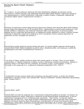 privatebanking.pl Deutsche Bank Polish Masters 05.05.2016. Już 7 maja br. na polu golfowym Kalinowe Pola koło Świebodzina odbędzie się pierwszy turniej eliminacyjny w ramach naszego cyklu golfowego Deutsche Bank Polish Masters. Tegoroczna edycja to cykl najważniejszych w Polsce amatorskich rozgrywek z wielkim finałem w Rajszewie. Nagrodą dla zwycięzców będzie udział w zagranicznym turnieju. Eliminacje na Kalinowych Polach będą pierwszą tegoroczną odsłoną cyklu Deutsche Bank Polish Masters, którego wielki finał odbędzie się 23-25 września 2016 r. jednocześnie na dwóch polach golfowych: First Warsaw Golf&CC w Rajszewie oraz Sobienie Królewskie G&CC pod Warszawą. W ramach projektu odbędzie się aż 9 rozgrywek eliminacyjnych na najlepszych polach golfowych w Polsce. Podczas turnieju finałowego w Rajszewie wyłonionych zostanie aż 18-tu zwycięzców, którzy zostaną zaproszeni na zagraniczny turniej. Szczegóły już wkrótce. Równocześnie projekt obejmuje szereg atrakcji dla gości. W ramach każdej rozgrywki eliminacyjnej Deutsche Bank Polish Masters odbędzie się piknik wraz z Akademią Golfa, czyli nauką gry w golfa dla początkujących pod okiem profesjonalnych trenerów. Po raz drugi w Polsce, golfiści-amatorzy będą mieli szansę zagrać w turnieju, który na żywo będzie transmitowany w Telewizji Publicznej. Finałowy turniej w Warszawie zostanie wyemitowany podczas 3godzinnej relacji w TVP Sport HD live (niedziela, 20 września w godz. 14:00 – 17:00), a informacje o nim ukażą się m.in. w głównych wydaniach wiadomości TVP1, TVP2. W amatorskim turnieju wezmą udział znani sympatycy tej dyscypliny sportu, a wśród nich oficjalni ambasadorzy naszego turnieju: były hokeista NHL, Mariusz Czerkawski i dyrektor piłkarskiej reprezentacji Polski, Tomasz Iwan. Deutsche Bank i golf Deutsche Bank od wielu lat angażuje się w renomowane wydarzenia golfowe w Europie i na świecie. Do niezwykle popularnych należy rozgrywany w Bostonie turniej Deutsche Bank Championship, w którym wielokrotnym zwycięzcą był m.in. światowej klasy sportowiec - Tiger Woods. Turniej jest częścią legendarnego US-PGA-Tour. Przez wiele lat Bank współorganizował także doskonale znany wszystkim golfistom na świecie Deutsche Bank Players’ Championship of Europe oraz Deutsche Bank Ladies’ Swiss Open, prestiżowy turniej dla kobiet odbywający się w ramach cyklu Ladies European http://www.privatebanking.pl Kreator PDF Utworzono 7 March, 2017, 20:01 privatebanking.pl Tour. W Polsce Deutsche Bank od 12 lat patronuje cyklowi turniejów golfowych, opartemu na wspólnej rywalizacji zawodowców z amatorami. Początkowo był on organizowany pod nazwą Deutsche Bank ProAm Tour; w 2012 roku nasz turniej zyskał już międzynarodowy wymiar w oparciu o ligę Pro Golf Tour. W latach 2013-2014 rozgrywki Deutsche Bank Polish Masters były finałowym turniejem europejskiego cyklu i zgromadziły najlepszych zawodników ligi Pro Golf Tour w Europie. Od ubiegłego roku Deutsche Bank powrócił do koncepcji rywalizacji najlepszych polskich Amatorów, którzy walczyć będą o zaproszenie na zagraniczny turniej. Deutsche Bank jest również sponsorem Dr Irena Eris Ladies’ Golf Cup prestiżowego wydarzenia golfowego dla kobiet. Szczegółowe informacje o turniejach Deutsche Bank dostępne są na stronach: www.polishmasters.eu oraz www.deutschebankchampionship.com źródło: Rzecznik Prasowy Grupy Deutsche Bank w Polsce http://www.privatebanking.pl Kreator PDF Utworzono 7 March, 2017, 20:01