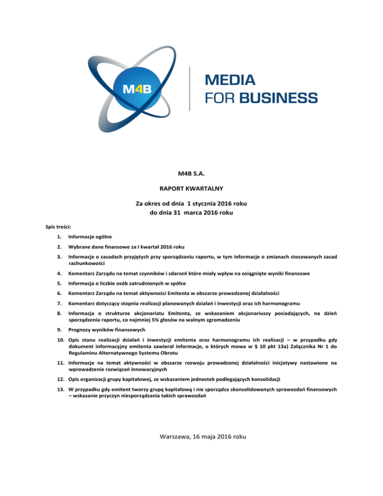 M4B S.A. RAPORT KWARTALNY Za okres od dnia 1 stycznia 2016