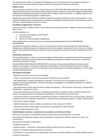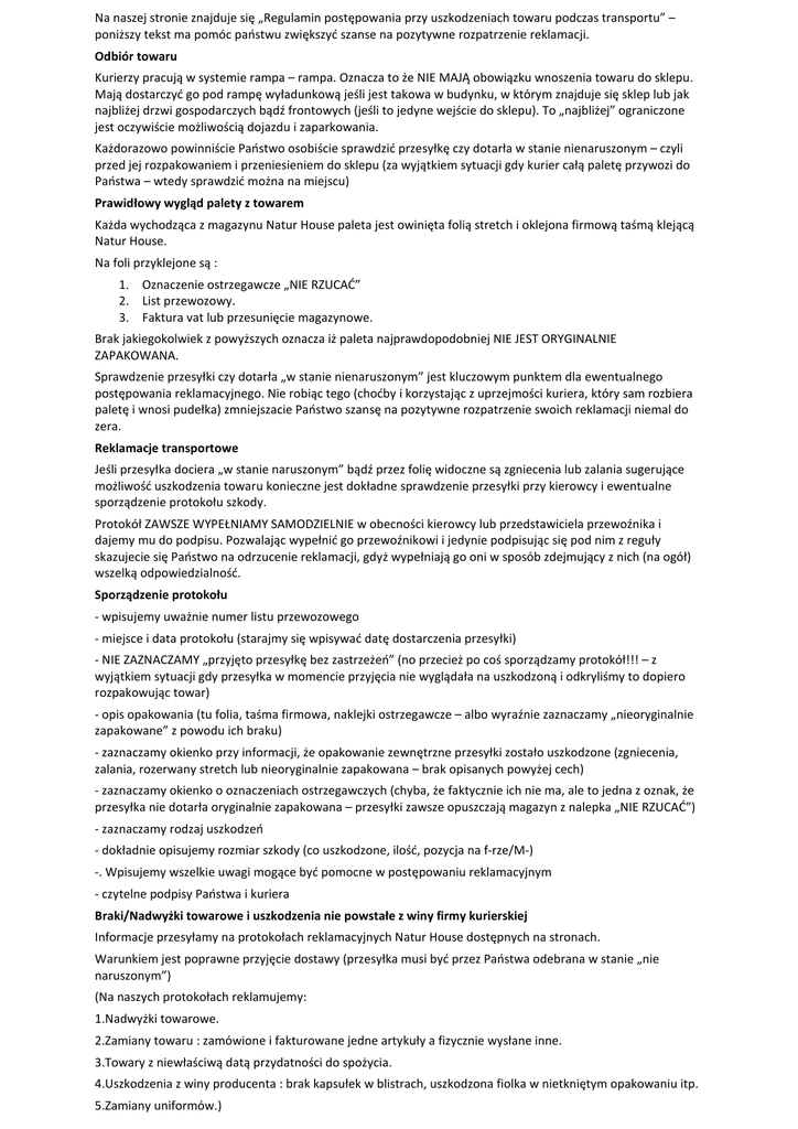 Na naszej stronie znajduje się „Regulamin postępowania przy uszkodzeniach towaru podczas transportu” – poniższy tekst ma pomóc państwu zwiększyć szanse na pozytywne rozpatrzenie reklamacji. Odbiór towaru Kurierzy pracują w systemie rampa – rampa. Oznacza to że NIE MAJĄ obowiązku wnoszenia towaru do sklepu. Mają dostarczyć go pod rampę wyładunkową jeśli jest takowa w budynku, w którym znajduje się sklep lub jak najbliżej drzwi gospodarczych bądź frontowych (jeśli to jedyne wejście do sklepu). To „najbliżej” ograniczone jest oczywiście możliwością dojazdu i zaparkowania. Każdorazowo powinniście Państwo osobiście sprawdzić przesyłkę czy dotarła w stanie nienaruszonym – czyli przed jej rozpakowaniem i przeniesieniem do sklepu (za wyjątkiem sytuacji gdy kurier całą paletę przywozi do Państwa – wtedy sprawdzić można na miejscu) Prawidłowy wygląd palety z towarem Każda wychodząca z magazynu Natur House paleta jest owinięta folią stretch i oklejona firmową taśmą klejącą Natur House. Na foli przyklejone są : 1. Oznaczenie ostrzegawcze „NIE RZUCAĆ” 2. List przewozowy. 3. Faktura vat lub przesunięcie magazynowe. Brak jakiegokolwiek z powyższych oznacza iż paleta najprawdopodobniej NIE JEST ORYGINALNIE ZAPAKOWANA. Sprawdzenie przesyłki czy dotarła „w stanie nienaruszonym” jest kluczowym punktem dla ewentualnego postępowania reklamacyjnego. Nie robiąc tego (choćby i korzystając z uprzejmości kuriera, który sam rozbiera paletę i wnosi pudełka) zmniejszacie Państwo szansę na pozytywne rozpatrzenie swoich reklamacji niemal do zera. Reklamacje transportowe Jeśli przesyłka dociera „w stanie naruszonym” bądź przez folię widoczne są zgniecenia lub zalania sugerujące możliwość uszkodzenia towaru konieczne jest dokładne sprawdzenie przesyłki przy kierowcy i ewentualne sporządzenie protokołu szkody. Protokół ZAWSZE WYPEŁNIAMY SAMODZIELNIE w obecności kierowcy lub przedstawiciela przewoźnika i dajemy mu do podpisu. Pozwalając wypełnić go przewoźnikowi i jedynie podpisując się pod nim z reguły skazujecie się Państwo na odrzucenie reklamacji, gdyż wypełniają go oni w sposób zdejmujący z nich (na ogół) wszelką odpowiedzialność. Sporządzenie protokołu - wpisujemy uważnie numer listu przewozowego - miejsce i data protokołu (starajmy się wpisywać datę dostarczenia przesyłki) - NIE ZAZNACZAMY „przyjęto przesyłkę bez zastrzeżeń” (no przecież po coś sporządzamy protokół!!! – z wyjątkiem sytuacji gdy przesyłka w momencie przyjęcia nie wyglądała na uszkodzoną i odkryliśmy to dopiero rozpakowując towar) - opis opakowania (tu folia, taśma firmowa, naklejki ostrzegawcze – albo wyraźnie zaznaczamy „nieoryginalnie zapakowane” z powodu ich braku) - zaznaczamy okienko przy informacji, że opakowanie zewnętrzne przesyłki zostało uszkodzone (zgniecenia, zalania, rozerwany stretch lub nieoryginalnie zapakowana – brak opisanych powyżej cech) - zaznaczamy okienko o oznaczeniach ostrzegawczych (chyba, że faktycznie ich nie ma, ale to jedna z oznak, że przesyłka nie dotarła oryginalnie zapakowana – przesyłki zawsze opuszczają magazyn z nalepka „NIE RZUCAĆ”) - zaznaczamy rodzaj uszkodzeń - dokładnie opisujemy rozmiar szkody (co uszkodzone, ilość, pozycja na f-rze/M-) -. Wpisujemy wszelkie uwagi mogące być pomocne w postępowaniu reklamacyjnym - czytelne podpisy Państwa i kuriera Braki/Nadwyżki towarowe i uszkodzenia nie powstałe z winy firmy kurierskiej Informacje przesyłamy na protokołach reklamacyjnych Natur House dostępnych na stronach. Warunkiem jest poprawne przyjęcie dostawy (przesyłka musi być przez Państwa odebrana w stanie „nie naruszonym”) (Na naszych protokołach reklamujemy: 1.Nadwyżki towarowe. 2.Zamiany towaru : zamówione i fakturowane jedne artykuły a fizycznie wysłane inne. 3.Towary z niewłaściwą datą przydatności do spożycia. 4.Uszkodzenia z winy producenta : brak kapsułek w blistrach, uszkodzona fiolka w nietkniętym opakowaniu itp. 5.Zamiany uniformów.) Wszystkie reklamacje przyjmowane są jedynie w formie mailowej. Procedura rozpatrywania reklamacji w Naturhouse. 1. Przesyłacie Państwo mailem na adres magazynu protokół reklamacyjny + możliwie najdokładniejszy opis sytuacji. 2. Magazyn odpowiada na zasadność i szansę pozytywnego rozpatrzenia reklamacji. 3. Jeśli Reklamacja zostaje wstępnie zakwalifikowana jako prawidłowa prosimy Państwa o wysłanie informacji do kierownika regionalnego z prośbą o odebranie reklamowanego towaru. 4. W uwagach do najbliższego zamówienia prosimy wpisać informację o towarze jakiego spodziewacie się Państwo od nas w ramach reklamacji. 5. Magazyn wysyła reklamowany towar do Państwa z powyższym zamówieniem.