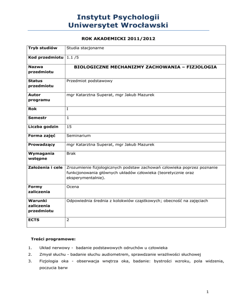 Instytut Psychologii Uniwersytet Wrocławski ROK AKADEMICKI 2011/2012 Tryb studiów Studia stacjonarne Kod przedmiotu 1.1 /5 BIOLOGICZNE MECHANIZMY ZACHOWANIA – FIZJOLOGIA Nazwa przedmiotu Status przedmiotu Przedmiot podstawowy Autor programu mgr Katarztna Superat, mgr Jakub Mazurek Rok I Semestr 1 Liczba godzin 15 Forma zajęć Seminarium Prowadzący mgr Katarztna Superat, mgr Jakub Mazurek Wymagania wstępne Brak Założenia i cele Zrozumienie fizjologicznych podstaw zachowań człowieka poprzez poznanie funkcjonowania głównych układów człowieka (teoretycznie oraz eksperymentalnie). Formy zaliczenia Ocena Warunki zaliczenia przedmiotu Odpowiednia średnia z kolokwiów cząstkowych; obecność na zajęciach ECTS 2 Treści programowe: 1. Układ nerwowy - badanie podstawowych odruchów u człowieka 2. Zmysł słuchu - badanie słuchu audiometrem, sprawdzanie wrażliwości słuchowej 3. Fizjologia oka - obserwacja wnętrza oka, badanie: bystrości wzroku, pola widzenia, poczucia barw 1 4. Fizjologia serca oraz układu tętniczo-żylnego (budowa, zasady funkcjonowania, regulacja) praktyczne określenie czynności serca (mechaniczna, elektryczna, akustyczna) oraz próby wysiłkowe układu krążenia jako test regulacji i wydajności układu krążenia. 5. Fizjologia krwi jako elementu tworzącego homeostazę organizmu – praktyczne określenie składu oraz właściwości krwi ssaków 6. Fizjologia układu oddechowego (budowa, zasady funkcjonowania, regulacja) – praktyczne określenie właściwości oraz zasad działania płuc oraz jednostek regulujących ich działanie. Literatura obowiązkowa Literatura uzupełniająca Traczyk W. Z. (1997). Fizjologia człowieka w zarysie. Warszawa: PZWL, wyd. VI. W. F. Ganong (red.). (2007). Fizjologia lekarska. Warszawa: PZWL. „Biologiczne mechanizmy zachowania” Sadowski i Chmurzyński 2
