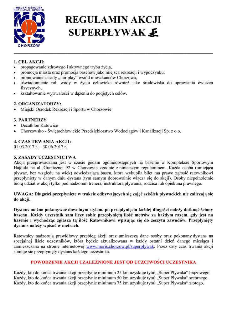 REGULAMIN AKCJI SUPERPŁYWAK 🏊 _______________________________________________________________________________________ 1. CEL AKCJI: propagowanie zdrowego i aktywnego trybu życia, promocja miasta oraz promocja basenów jako miejsca rekreacji i wypoczynku, promowanie zasady „fair play“ wśród mieszkańców Chorzowa, uświadomienie roli wody w życiu człowieka również jako środowiska do uprawiania ćwiczeń fizycznych, kształtowanie wytrwałości w dążeniu do podjętych celów. 2. ORGANIZATORZY: Miejski Ośrodek Rekreacji i Sportu w Chorzowie 3. PARTNERZY Decathlon Katowice Chorzowsko - Świętochłowickie Przedsiębiorstwo Wodociągów i Kanalizacji Sp. z o.o. 4. CZAS TRWANIA AKCJI: 01.03.2017 r. – 30.06.2017 r. 5. ZASADY UCZESTNICTWA Akcja przeprowadzana jest w czasie godzin ogólnodostępnych na basenie w Kompleksie Sportowym Hajduki na ul. Granicznej 92 w Chorzowie zgodnie z niniejszym regulaminem. Każda osoba (umiejąca pływać, bez względu na wiek) odwiedzająca basen, która wykupiła bilet ma prawo zgłosić ratownikowi przepłynięty w danym dniu dystans (tym samym dobrowolnie włącza się do akcji). Osoby niepełnoletnie biorą udział w akcji tylko pod nadzorem trenera, instruktora pływania, rodzica lub opiekuna prawnego. UWAGA: Długości przepłynięte w trakcie odbywających się zajęć szkółek pływackich nie zaliczają się do akcji. Dystans można pokonywać dowolnym stylem, po przepłynięciu każdej długości należy dotknąć ściany basenu. Każdy uczestnik sam liczy sobie przepłyniętą ilość metrów za każdym razem, gdy jest na basenie i wychodząc zgłasza tą ilość Ratownikowi wpisując się do zeszytu zawodów. Przepłynięty dystans należy wpisać w metrach. Ratownicy nadzorują prawidłowy przebieg akcji oraz umieszczą dane osoby oraz pokonany dystans na specjalnej liście uczestników, która będzie aktualizowana w każdy ostatni dzień danego miesiąca i zamieszczana na stronie internetowej www.moris.chorzow.pl/superplywak. Przez cały czas trwania akcji sumuje się przepłynięty dystans każdego uczestnika. POWODZENIE AKCJI UZALEŻNIONE JEST OD UCZCIWOŚCI UCZESTNIKA Każdy, kto do końca trwania akcji przepłynie minimum 25 km uzyskuje tytuł „Super Pływaka“ brązowego. Każdy, kto do końca trwania akcji przepłynie minimum 50 km uzyskuje tytuł „Super Pływaka“ srebrnego. Każdy, kto do końca trwania akcji przepłynie minimum 75 km uzyskuje tytuł „Super Pływaka“ złotego. 6. MIEJSCE: Basen Kompleksu Sportowego „HAJDUKI” ul Graniczna 92 – Chorzów 7. KONTAKT: MORiS Chorzów - Dział Organizacji Imprez, tel. 32 2411 111 8. NAGRODY: Uczestnicy zaproszeni na uroczystość końcową otrzymają pamiątkowe upominki oraz dyplomy. 9. ZAKOŃCZENIE AKCJI: Uczestnicy, którzy w czasie trwania akcji pokonają dystans co najmniej 25 km zostaną zaproszeni na specjalne - uroczyste zakończenie akcji, połączone z wręczeniem wyróżnień, które odbędzie się w lipcu 2017 r. (dokładny termin zostanie podany na stronie www.moris.chorzow/superplywak) 10. POSTANOWIENIA KOŃCOWE: Każdy uczestnik akcji przed wejściem na basen ma obowiązek zapoznania się z regulaminem korzystania z obiektu oraz przestrzegania jego postanowień. Poprzez zgłoszenie do udziału w akcji, uczestnik wyraża zgodę na opublikowanie, przez Organizatorów, na łamach strony internetowej i w informacjach medialnych, wizerunku uczestnika oraz imienia i nazwiska uczestnika. Warunkiem uczestniczenia w akcji jest posiadanie dobrego stanu zdrowia bez przeciwskazań medycznych, Uczestnik akcji bierze w niej udział na własną odpowiedzialność. Przekazanie organizatorowi pokonanego dystansu oznacza, że uczestnik rozważył i ocenił charakter, zakres i stopień ryzyka jakie wiąże się z uczestnictwem w imprezie, w tym zagrożenie wypadkami, możliwości odniesienia obrażeń ciała i urazów fizycznych, dobrowolnie i świadomie zdecydował się podjąć to ryzyko. Organizatorzy w najszerszym zakresie dopuszczonym przez obowiązujące przepisy prawa zwolnieni są z wszelkiej odpowiedzialności za ewentualne szkody, urazy czy uszczerbki na zdrowiu jakie może pociągać za sobą udział w akcji oraz zwolnieni są z obowiązku naprawienia takich szkód. Uczestnik może złożyć protest do dnia zakończenia akcji. Wszystkie protesty muszą być sporządzone w formie pisemnej w języku polskim oraz muszą być dostarczone Organizatorowi lub innej osobie przez niego upoważnionej. Protest musi zawierać dane osobowe Uczestnika zgłaszającego, jego własnoręczny podpis oraz krótki opis zdarzenia. W kwestii rozpatrywania ewentualnych protestów decyzja Organizatorów jest ostateczna. Ostateczna interpretacja niniejszego regulaminu należy do organizatora. Pływanie pod wpływem alkoholu, narkotyków lub innych substancji psychoaktywnych jest surowo zabronione.