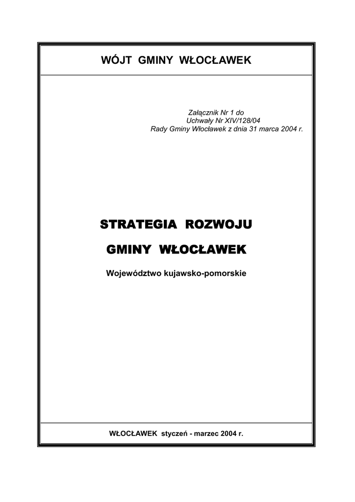 WÓJT GMINY WŁOCŁAWEK Załącznik Nr 1 do Uchwały Nr XIV/128/04 Rady Gminy Włocławek z dnia 31 marca 2004 r. STRATEGIA ROZWOJU GMINY WŁOCŁAWEK Województwo kujawsko-pomorskie WŁOCŁAWEK styczeń - marzec 2004 r. WPROWADZENIE Strategia to generalnie sposób osiągania wyznaczonych celów poprzez sterowanie rozwojem. Sposób ten jest najczęściej ujęty w postaci planu działania określonego podmiotu, na danym terenie lub w danej dziedzinie i w ustalonym wymiarze czasu. W pracach nad strategią gminy Włocławek zastosowano technikę planowania ekspercko-partnerskiego, z wykorzystaniem załoŜeń metodologii planowania ukierunkowanego na cel. Prace nad planem przyszłego rozwoju gminy poprzedzone zostały fazą diagnozowania, tj. rozpoznania stanu obecnego gminy na tle jej dotychczasowego rozwoju, i w kontekście moŜliwości rozwoju przyszłego. W ramach diagnozowania stanu gminy: − zinwentaryzowano liczne dane statystyczne o gminie na tle województwa, powiatu i gmin sąsiadujących, które stanowią załącznik do strategii (opracowanie pn. „Gmina Włocławek w liczbach” – materiał do diagnozy), − dokonano analizy dokumentów planistycznych: Studium uwarunkowań i kierunków zagospodarowania przestrzennego gminy Włocławek, Uchwała nr XXIV/162/2000 Rady Gminy Włocławek, z dnia 27 listopada 2000 r. oraz planów miejscowych, − wykorzystano dokumenty „Plan inwestycyjny na rok 2004” oraz „Limit wydatków na wieloletnie programy inwestycyjne” – stanowiące załączniki do Uchwały Nr XIII/117/04 Rady Gminy Włocławek z dnia 19 lutego 2004 r, − przeanalizowano wnioski złoŜone do strategii przez społeczności sołeckie (14). Informacje i dane zawarte w wyŜej wymienionych opracowaniach oraz inną wiedzę o gminie, wykorzystano dla oceny jej obecnego stanu. Wykonano ją w formie zestawienia aktualnych i potencjalnych atutów gminy dla rozwoju, jej dzisiejszych słabości, zidentyfikowanych szans i zagroŜeń rozwoju. Ocena stanu istniejącego, implikująca zasadnicze przesłanki dla ukierunkowania rozwoju w przyszłości, znajomość potrzeb i aspiracji lokalnej społeczności, były podstawą dla sformułowania propozycji celu nadrzędnego rozwoju gminy, celów szczegółowych strategii oraz konkretnych działań je realizujących. Projekt strategii rozwoju gminy w całym okresie jego budowy był przedmiotem społecznych konsultacji. W dniu 29 stycznia 2004 r. załoŜenia metodologiczne strategii rozwoju gminy Włocławek były przedmiotem dyskusji i odnośnych ustaleń na spotkaniu zorganizowanym przez Wójta Gminy, w którym uczestniczyli zaproszeni specjaliści z zakresu planowania strategicznego rozwoju lokalnego oraz przedstawiciele władz samorządowych gminy. Na spotkaniu tym ustalono m.in.: 10-letni okres planowania tj. opracowanie strategii do roku 2013, ogólny harmonogram prac nad strategią, formy jej społecznej konsultacji. W dniu 2 marca 2004 r. pierwszy projekt planu strategicznego rozwoju gminy Włocławek przygotowany przez zespół specjalistów był przedmiotem konsultacji z zespołem reprezentującym mieszkańców gminy. W jego składzie znalazły się osoby, które przyjęły 2 zaproszenie do uczestniczenia w pracach skierowane do nich przez Wójta Gminy. Skład tego zespołu zawiera załącznik do Strategii. Wnioski z konsultacji społecznych z dnia 2 marca br. zostały uwzględnione w kolejnej wersji projektu dokumentu, który został zaprezentowany Komisji BudŜetu, Finansów, Promocji Wsi i Integracji Europejskiej Rady w dniu 24.03.2004 r. Wnioski Komisji oraz autopoprawka znalazły się w projekcie strategii przedstawionej do uchwalenia na sesji Rady Gminy w dniu 31.03.2004 r. Strategia rozwoju ujęta w formie dokumentu planu przyszłych działań na rzecz rozwoju, nie ma wyraźnie określonego statusu prawnego, tzn. nie ma określonego prawem wymogu jej posiadania i stosowania w praktyce zarządzania. Nie znaczy to, Ŝe nie moŜe ona stać się prawem lokalnym, na mocy uchwały lokalnego samorządu. Ze względu na ogólność ustaleń strategicznych, nieznany stan przyszłych uwarunkowań realizacji planowanych działań, a takŜe moŜliwą zmianę celów i kierunków rozwoju, strategie traktowane są jako plany w znacznej mierze otwarte, jako społecznie uzgodniony „drogowskaz” dla przyszłych działań a nie bezwzględny wykaz takich działań. Powszechną akceptację ustaleń zapisanych w dokumencie strategii uznaje się jako zobowiązanie dla ich przyszłej realizacji. Inicjatorem sporządzenia Strategii rozwoju gminy Włocławek była Rada Gminy – Uchwała Nr XIII/83/99 Rady Gminy Włocławek z dnia 17 września 1999 roku. CHARAKTERYSTYKA OGÓLNA GMINY Gmina Włocławek to gmina podmiejska połoŜona w południowo-wschodniej części województwa kujawsko-pomorskiego, w powiecie włocławskim, na południowy-wschód od 123 tysięcznego miasta Włocławka. Powierzchnia gminy wynosi 21 992 ha (219,9 km2), w tym: - 7049 ha • uŜytki rolne • lasy - 10815 ha • wody - 2519 ha • pozostałe grunty - 1609 ha Gminę zamieszkuje 5867 osób, przy średniej gęstości zaludnienia 27 osób/km2 i 52 osoby na 1 km2 powierzchni bez lasów. Pod względem administracyjnym gmina Włocławek podzielona jest na 26 sołectw i 50 miejscowości. NajbliŜsze sąsiedztwo to: • • • • • • gmina Baruchowo – od południowego wschodu gmina Kowal i gmina Choceń - od południa gmina Lubraniec – od południowego-zachodu (najkrótsza granica) gmina Brześć Kuj – od zachodu miasto Włocławek – od północnego - zachodu rzeka Wisła – od północy 3 • województwo mazowieckie – od wschodu. Sąsiedztwo Wisły tworzy sytuację połoŜenia gminy w Krajowej Sieci Ekologicznej EKONET – POLSKA. Ponadto znaczna jej część połoŜona jest w obszarze GostynińskoWłocławskiego Parku Krajobrazowego – Uchwała Nr XIX/70/79 WRN we Włocławku i Płocku z dnia 05.04.1979 r. (Dz. Urz. Nr 4, poz. 22 z 02.05.1979 r., Dz. U