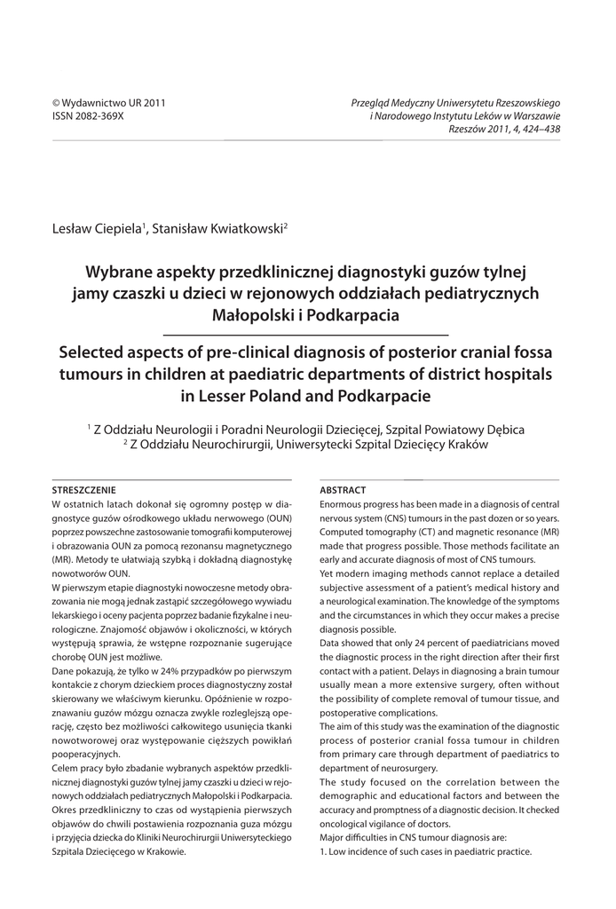 424 Przegląd Medyczny Uniwersytetu Rzeszowskiego i Narodowego Instytutu Leków w Warszawie, 2011, 4, 424–438 © Wydawnictwo UR 2011 ISSN 2082-369X Przegląd Medyczny Uniwersytetu Rzeszowskiego i Narodowego Instytutu Leków w Warszawie Rzeszów 2011, 4, 424–438 Lesław Ciepiela1, Stanisław Kwiatkowski2 Wybrane aspekty przedklinicznej diagnostyki guzów tylnej jamy czaszki u dzieci w rejonowych oddziałach pediatrycznych Małopolski i Podkarpacia Selected aspects of pre-clinical diagnosis of posterior cranial fossa tumours in children at paediatric departments of district hospitals in Lesser Poland and Podkarpacie 1 Z Oddziału Neurologii i Poradni Neurologii Dziecięcej, Szpital Powiatowy Dębica 2 Z Oddziału Neurochirurgii, Uniwersytecki Szpital Dziecięcy Kraków Streszczenie W ostatnich latach dokonał się ogromny postęp w diagnostyce guzów ośrodkowego układu nerwowego (OUN) poprzez powszechne zastosowanie tomografii komputerowej i obrazowania OUN za pomocą rezonansu magnetycznego (MR). Metody te ułatwiają szybką i dokładną diagnostykę nowotworów OUN. W pierwszym etapie diagnostyki nowoczesne metody obrazowania nie mogą jednak zastąpić szczegółowego wywiadu lekarskiego i oceny pacjenta poprzez badanie fizykalne i neurologiczne. Znajomość objawów i okoliczności, w których występują sprawia, że wstępne rozpoznanie sugerujące chorobę OUN jest możliwe. Dane pokazują, że tylko w 24% przypadków po pierwszym kontakcie z chorym dzieckiem proces diagnostyczny został skierowany we właściwym kierunku. Opóźnienie w rozpoznawaniu guzów mózgu oznacza zwykle rozleglejszą operację, często bez możliwości całkowitego usunięcia tkanki nowotworowej oraz występowanie cięższych powikłań pooperacyjnych. Celem pracy było zbadanie wybranych aspektów przedklinicznej diagnostyki guzów tylnej jamy czaszki u dzieci w rejonowych oddziałach pediatrycznych Małopolski i Podkarpacia. Okres przedkliniczny to czas od wystąpienia pierwszych objawów do chwili postawienia rozpoznania guza mózgu i przyjęcia dziecka do Kliniki Neurochirurgii Uniwersyteckiego Szpitala Dziecięcego w Krakowie. Abstract Enormous progress has been made in a diagnosis of central nervous system (CNS) tumours in the past dozen or so years. Computed tomography (CT) and magnetic resonance (MR) made that progress possible. Those methods facilitate an early and accurate diagnosis of most of CNS tumours. Yet modern imaging methods cannot replace a detailed subjective assessment of a patient’s medical history and a neurological examination. The knowledge of the symptoms and the circumstances in which they occur makes a precise diagnosis possible. Data showed that only 24 percent of paediatricians moved the diagnostic process in the right direction after their first contact with a patient. Delays in diagnosing a brain tumour usually mean a more extensive surgery, often without the possibility of complete removal of tumour tissue, and postoperative complications. The aim of this study was the examination of the diagnostic process of posterior cranial fossa tumour in children from primary care through department of paediatrics to department of neurosurgery. The study focused on the correlation between the demographic and educational factors and between the accuracy and promptness of a diagnostic decision. It checked oncological vigilance of doctors. Major difficulties in CNS tumour diagnosis are: 1. Low incidence of such cases in paediatric practice. Ciepiela, Kwiatkowski Wybrane aspekty przedklinicznej diagnostyki guzów tylnej jamy czaszki u dzieci… Badanie dotyczyło korelacji pomiędzy szeregiem czynników demograficznych i edukacyjnych mających wpływ na trafność i szybkość decyzji diagnostycznych lekarzy powiatowych (rejonowych) oddziałów pediatrii (OP). Badanie miało wskazać ponadto, jaka jest czujność onkologiczna pediatrów z OP w stosunku do choroby nowotworowej, jaką jest guz mózgu, dokładniej guz tylnej jamy czaszki. Na podstawie szczegółowej analizy licznych czynników, uzyskanych w oparciu o analizę danych wykazano, że trudności w rozpoznawaniu nowotworów OUN wynikają z następujących przyczyn: 1. niska częstość występowania takich przypadków u dzieci w praktyce pediatrycznej, 2. brak swoistej „czujności” onkologicznej, 3. błędna interpretacja takich objawów jak poranne bóle głowy i wymioty, 4. pomijanie w diagnostyce objawów rzadkich, takich jak ból karku, trudności szkolne, obecność zaburzeń emocjonalnych. Natomiast metody obrazowania (CT i MR) oraz konsultacje neurologa dziecięcego są powszechnie dostępne i nie mają wpływu na długość okresu przedklinicznego nowotworów OUN. Słowa kluczowe: guz mózgu, guz tylnej jamy, objawy, objawy atypowe, czujność onkologiczna. 425 2. Absence of oncological vigilance. 3. Misinterpretation of symptoms such as morning headaches and vomiting. 4. Exclusion of rare symptoms such as neck pain, little educational progress, emotional changes. Imaging methods (CT and MR) are widely available and have no influence on the CNS tumours diagnosis. Key words: brain tumour, posterior cranial fossa tumour, symptoms, atypical symptoms, oncological vigilance