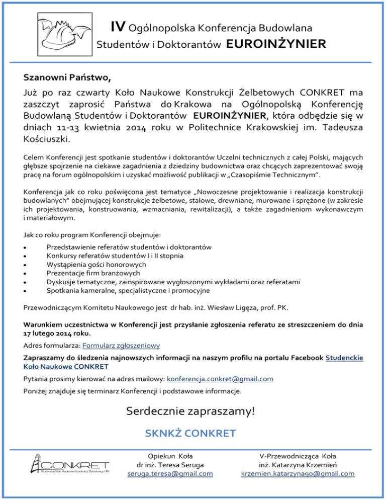 IV Ogólnopolska Konferencja Budowlana Studentów i Doktorantów EUROINŻYNIER Szanowni Państwo, Już po raz czwarty Koło Naukowe Konstrukcji Żelbetowych CONKRET ma zaszczyt zaprosić Państwa do Krakowa na Ogólnopolską Konferencję Budowlaną Studentów i Doktorantów EUROINŻYNIER, która odbędzie się w dniach 11-13 kwietnia 2014 roku w Politechnice Krakowskiej im. Tadeusza Kościuszki. Celem Konferencji jest spotkanie studentów i doktorantów Uczelni technicznych z całej Polski, mających głębsze spojrzenie na ciekawe zagadnienia z dziedziny budownictwa oraz chcących zaprezentować swoją pracę na forum ogólnopolskim i uzyskać możliwość publikacji w „Czasopiśmie Technicznym”. Konferencja jak co roku poświęcona jest tematyce „Nowoczesne projektowanie i realizacja konstrukcji budowlanych” obejmującej konstrukcje żelbetowe, stalowe, drewniane, murowane i sprężone (w zakresie ich projektowania, konstruowania, wzmacniania, rewitalizacji), a także zagadnieniom wykonawczym i materiałowym. Jak co roku program Konferencji obejmuje: Przedstawienie referatów studentów i doktorantów Konkursy referatów studentów I i II stopnia Wystąpienia gości honorowych Prezentacje firm branżowych Dyskusje tematyczne, zainspirowane wygłoszonymi wykładami oraz referatami Spotkania kameralne, specjalistyczne i promocyjne Przewodniczącym Komitetu Naukowego jest dr hab. inż. Wiesław Ligęza, prof. PK. Warunkiem uczestnictwa w Konferencji jest przysłanie zgłoszenia referatu ze streszczeniem do dnia 17 lutego 2014 roku. Adres formularza: Formularz zgłoszeniowy Zapraszamy do śledzenia najnowszych informacji na naszym profilu na portalu Facebook Studenckie Koło Naukowe CONKRET Pytania prosimy kierować na adres mailowy: [email protected] Poniżej znajduje się terminarz Konferencji i podstawowe informacje. Serdecznie zapraszamy! SKNKŻ CONKRET Opiekun Koła dr inż. Teresa Seruga [email protected] V-Przewodnicząca Koła inż. Katarzyna Krzemień [email protected] TERMINARZ KONFERENCJI EUROINŻYNIER IV I PODSTAWOWE INFORMACJE 1. Zakończenie zapisów 2. Przesłanie streszczeń referatów poprzez formularz rejestracyjny 3. Kwalifikacja referatów (na podstawie przesłanych streszczeń) i ogłoszenie listy uczestników 4. Przesłanie pełnych tekstów referatów 5. Dokonanie opłat konferencyjnych 6. Recenzja referatów i przekazanie uwag autorom 7. Odesłanie poprawionych referatów, gotowych do publikacji 8. Konferencja 17.02.2014 17.02.2014 18.02.2014 10.03.2014 10.03.2014 24.03.2014 07.04.2014 11-13.04.2014 Konferencja EUROINŻYNIER odbędzie się pod patronatem J.M. Rektora Politechniki Krakowskiej prof. dr hab. inż. Kazimierza Furtaka oraz Pana Dziekana Wydziału Inżynierii Lądowej PK, prof. dr hab. inż. Tadeusza Tatary. Miejsce obrad - sala konferencyjna SHU - KŁOS, ul. Szlak 65, Kraków. Opłata za udział w konferencji wynosi 150 zł od Uczestnika i obejmuje koszt obiadów i uroczystej kolacji na zakończenie konferencji, udział w spotkaniu integracyjnym, zwiedzanie zabytków (planowane zwiedzenie Kopalni Soli w Wieliczce) oraz materiały konferencyjne. Do przyjazdu na Konferencję zachęcamy również wolnych słuchaczy, którzy nie zgłaszają referatów i nie ponoszą opłat, nie otrzymują również świadczeń ze strony organizatorów. Serdecznie zapraszamy do udziału w IV Konferencji EUROINŻYNIER studentów I i II stopnia, doktorantów, Studenckie Koła Naukowe oraz Opiekunów Kół !