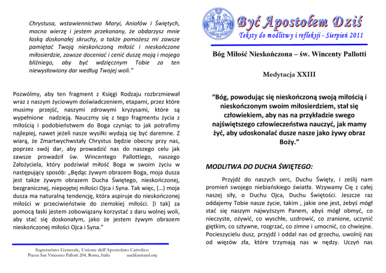 Chrystusa, wstawiennictwo Maryi, Aniołów i Świętych, mocno wierzę i jestem przekonany, że obdarzysz mnie łaską doskonałej skruchy, a także pomożesz mi zawsze pamiętać Twoją nieskończoną miłość i nieskończone miłosierdzie, zawsze doceniać i cenić duszę moją i mojego bliźniego, aby być wdzięcznym Tobie za ten niewysłowiony dar według Twojej woli.” Pozwólmy, aby ten fragment z Księgi Rodzaju rozbrzmiewał wraz z naszym życiowym doświadczeniem, etapami, przez które musimy przejść, naszymi zdrowymi kryzysami, które są wypełnione nadzieją. Nauczmy się z tego fragmentu życia z miłością i podobieństwem do Boga czyniąc to jak potrafimy najlepiej, nawet jeżeli nasze wysiłki wydają się być daremne. Z wiarą, że Zmartwychwstały Chrystus będzie obecny przy nas, poprzez swój dar, aby prowadzić nas do naszego celu jak zawsze prowadził św. Wincentego Pallottiego, naszego Założyciela, który podziwiał miłość Boga w swoim życiu w następujący sposób: „Będąc żywym obrazem Boga, moja dusza jest także żywym obrazem Ducha Świętego, nieskończonej, bezgranicznej, niepojętej miłości Ojca i Syna. Tak więc, (…) moja dusza ma naturalną tendencję, która aspiruje do nieskończonej miłości w przeciwieństwie do ziemskiej miłości. [I tak] za pomocą łaski jestem zobowiązany korzystać z daru wolnej woli, aby stać się doskonałym, jako że jestem żywym obrazem nieskończonej miłości Ojca i Syna.” Segretariato Generale, Unione dell’Apostolato Cattolico Piazza San Vincenzo Pallotti 204, Roma, Italia [email protected] Bóg Miłość Nieskończona – św. Wincenty Pallotti Medytacja XXIII “Bóg, powodując się nieskończoną swoją miłością i nieskończonym swoim miłosierdziem, stał się człowiekiem, aby nas na przykładzie swego najświętszego człowieczeństwa nauczyć, jak mamy żyć, aby udoskonalać dusze nasze jako żywy obraz Boży.” MODLITWA DO DUCHA ŚWIĘTEGO: Przyjdź do naszych serc, Duchu Święty, i ześlij nam promień swojego niebiańskiego światła. Wzywamy Cię z całej naszej siły, o Duchu Ojca, Duchu Świętości. Jeszcze raz oddajemy Tobie nasze życie, takim , jakie one jest, żebyś mógł stać się naszym najwyższym Panem, abyś mógł obmyć, co nieczyste, ożywić, co wyschłe, uzdrowić, co zranione, uczynić giętkim, co sztywne, rozgrzać, co zimne i umocnić, co chwiejne. Pocieszycielu dusz, przyjdź i oddal nas od grzechu, uwolnij nas od więzów zła, które trzymają nas w nędzy. Uczyń nas apostołami Dobrej Nowiny na całym świecie, tak aby czas naszego zbawienia i naszego ostatecznego przyjścia mógł być przyśpieszony. (Rdz 1,27). Według Proroka Izajasza jesteśmy cenni dla Boga jako, że zostaliśmy stworzeni na Jego podobieństwo. Ta darmowa i miłosierna miłość Boga zadziwiała naszego założyciela św. Wincentego Pallottiego. Wypowiadał on słowa pełne podziwu: FRAGMENT PISMA ŚWIĘTEGO: „A wreszcie rzekł Bóg: ‘Uczyńmy człowieka na Nasz obraz, podobnego Nam. Niech panuje nad rybami morskimi, nad ptactwem powietrznym, nad bydłem, nad ziemią I nad wszystkimi zwierzętami pełzającymi po ziemi!’ Stworzył więc Bóg człowieka na swój obraz, na obraz Boży go stworzył: stworzył mężczyznę i niewiastę.” (Rdz 1, 26-27) Co ten fragment mówi do mnie? Tekst ten skłania mnie do myślenia o darmowej miłości Boga w stosunku do człowieka, Jego nieskończonym miłosierdziu, które nie oczekuje niczego w zamian. Czy jesteśmy świadomi tej łaskawej miłości, którą Bóg żywi do nas? To podobieństwo do Boga jest łaską, którą ludzie nie rozpoznają! Zwykle pozostajemy niewdzięcznymi grzesznikami. Z powyższego fragmentu jasne jest, że istoty ludzkie, od samego stworzenia, są istotami społecznymi, które żyją w relacji z samymi sobą, ze swoim Stwórcą, ze sobą nawzajem i z innymi stworzeniami. Jesteśmy wezwani, żeby kochać i być kochanymi. To jest źródło naszego szczególnego miejsca w dziele stworzenia w relacji do innych stworzeń. W tej historii, ludzie otrzymują zadanie rozumienia i przeżywania tego co ich różni między sobą jako coś co ich w tej różnorodności ma uzupełniać „Boże, moja nieskończona miłości, moja niewysłowiona miłości, moja niezrównana miłości. Jest prawdą wiary, że moja dusza została stworzona na Twój obraz. Nie została namalowana na płótnie, wytworzona z drewna, kamienia czy metalu, ale z żywego, rozumnego i duchowego tworzywa. O mój Boże, kto może zrozumieć Twoją nieskończoną miłość i Twoje nieskończone miłosierdzie? Moja ignorancja i moja niewdzięczność, ja, który nie wiedziałem jak cenić moją duszę tak wysoko jak powinienem był? Ale przez Twoje miłosierdzie pomóż mi modlić się do Ciebie w ten sposób: Boże, mój najbardziej kochający i najmiłosierniejszy Ojcze, mój Stwórco, nie jestem w stanie zrozumieć wartości mojej duszy stworzonej na Twój obraz i podobieństwo, jako że nie potrafię poznać Ciebie. Jeszcze trudniej zrozumieć Twoją nieskończoną miłość i Twoje nieskończone miłosierdzie, jako że raczyłeś stworzyć mnie, mimo że w swojej nieskończonej mądrości przewidziałeś jak niewiele zrobię z tym wspaniałym błogosławieństwem, jak niewdzięcznym będę, a także jak niemożliwym będzie dla mnie bycie zdolnym do rozpoznania mojej niegodności. Ale przez zasługi Jezusa