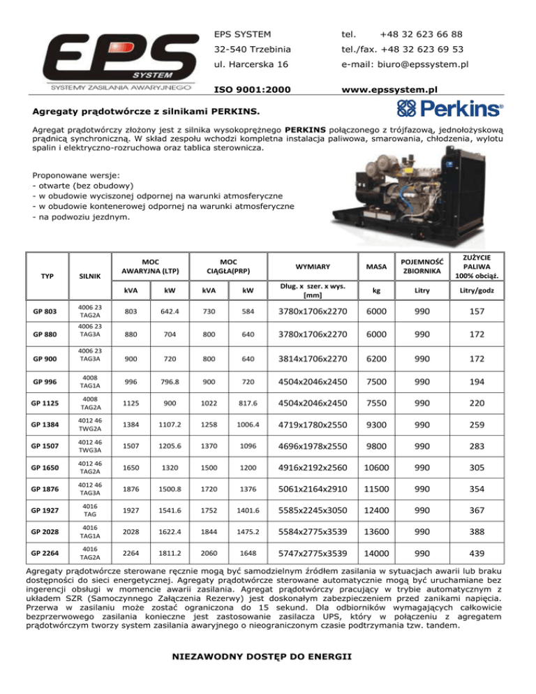 EPS SYSTEM tel. +48 32 623 66 88 32-540 Trzebinia tel./fax. +48 32 623 69 53 ul. Harcerska 16 e-mail: [email protected] ISO 9001:2000 www.epssystem.pl Agregaty prądotwórcze z silnikami PERKINS. Agregat prądotwórczy złożony jest z silnika wysokoprężnego PERKINS połączonego z trójfazową, jednołożyskową prądnicą synchroniczną. W skład zespołu wchodzi kompletna instalacja paliwowa, smarowania, chłodzenia, wylotu spalin i elektryczno-rozruchowa oraz tablica sterownicza. Proponowane wersje: - otwarte (bez obudowy) - w obudowie wyciszonej odpornej na warunki atmosferyczne - w obudowie kontenerowej odpornej na warunki atmosferyczne - na podwoziu jezdnym. TYP GP 803 SILNIK 4006 23 TAG2A MOC AWARYJNA (LTP) MOC CIĄGŁA(PRP) WYMIARY MASA POJEMNOŚĆ ZBIORNIKA ZUŻYCIE PALIWA 100% obciąż. kVA kW kVA kW Dług. x szer. x wys. [mm] kg Litry Litry/godz 803 642.4 730 584 3780x1706x2270 6000 990 157 GP 880 4006 23 TAG3A 880 704 800 640 3780x1706x2270 6000 990 172 GP 900 4006 23 TAG3A 900 720 800 640 3814x1706x2270 6200 990 172 GP 996 4008 TAG1A 996 796.8 900 720 4504x2046x2450 7500 990 194 GP 1125 4008 TAG2A 1125 900 1022 817.6 4504x2046x2450 7550 990 220 GP 1384 4012 46 TWG2A 1384 1107.2 1258 1006.4 4719x1780x2550 9300 990 259 GP 1507 4012 46 TWG3A 1507 1205.6 1370 1096 4696x1978x2550 9800 990 283 GP 1650 4012 46 TAG2A 1650 1320 1500 1200 4916x2192x2560 10600 990 305 GP 1876 4012 46 TAG3A 1876 1500.8 1720 1376 5061x2164x2910 11500 990 354 GP 1927 4016 TAG 1927 1541.6 1752 1401.6 5585x2245x3050 12400 990 367 GP 2028 4016 TAG1A 2028 1622.4 1844 1475.2 5584x2775x3539 13600 990 388 GP 2264 4016 TAG2A 2264 1811.2 2060 1648 5747x2775x3539 14000 990 439 Agregaty prądotwórcze sterowane ręcznie mogą być samodzielnym źródłem zasilania w sytuacjach awarii lub braku dostępności do sieci energetycznej. Agregaty prądotwórcze sterowane automatycznie mogą być uruchamiane bez ingerencji obsługi w momencie awarii zasilania. Agregat prądotwórczy pracujący w trybie automatycznym z układem SZR (Samoczynnego Załączenia Rezerwy) jest doskonałym zabezpieczeniem przed zanikami napięcia. Przerwa w zasilaniu może zostać ograniczona do 15 sekund. Dla odbiorników wymagających całkowicie bezprzerwowego zasilania konieczne jest zastosowanie zasilacza UPS, który w połączeniu z agregatem prądotwórczym tworzy system zasilania awaryjnego o nieograniczonym czasie podtrzymania tzw. tandem. NIEZAWODNY DOSTĘP DO ENERGII EPS SYSTEM tel. +48 32 623 66 88 32-540 Trzebinia tel./fax. +48 32 623 69 53 ul. Harcerska 16 e-mail: [email protected] ISO 9001:2000 www.epssystem.pl Agregaty prądotwórcze z silnikami PERKINS - obudowane. Agregat prądotwórczy złożony jest z silnika wysokoprężnego PERKINS połączonego z trójfazową, jednołożyskową prądnicą synchroniczną. W skład zespołu wchodzi kompletna instalacja paliwowa, smarowania, chłodzenia, wylotu spalin i elektryczno-rozruchowa oraz tablica sterownicza. Proponowane wersje: - otwarte (bez obudowy) - w obudowie wyciszonej odpornej na warunki atmosferyczne - w obudowie kontenerowej odpornej na warunki atmosferyczne - na podwoziu jezdnym. TYP GP 803 S SILNIK 4006 23 TAG2A MOC AWARYJNA (LTP) MOC CIĄGŁA(PRP) WYMIARY MASA POJEMNOŚĆ ZBIORNIKA ZUŻYCIE PALIWA 100% obciąż. kVA kW kVA kW Dług. x szer. x wys. [mm] kg Litry Litry/godz 803 642.4 730 584 6400 x 2300 x 2704 8000 990 157 GP 880 S 4006 23 TAG3A 880 704 800 640 6400 x 2300 x 2704 8000 990 172 GP 900 S 4006 23 TAG3A 900 720 800 640 6400 x 2300 x 2704 8200 990 172 GP 996 S 4008 TAG1A 996 796.8 900 720 6400 x 2300 x 2704 9500 990 194 GP 1125 S 4008 TAG2A 1125 900 1022 817.6 6400 x 2300 x 2704 9550 990 220 GP 1384 S 4012 46 TWG2A 1384 1107.2 1258 1006.4 6400 x 2300 x 2704 11300 990 259 GP 1507 S 4012 46 TWG3A 1507 1205.6 1370 1096 6400 x 2300 x 2704 11800 990 283 Agregaty prądotwórcze sterowane ręcznie mogą być samodzielnym źródłem zasilania w sytuacjach awarii lub braku dostępności do sieci energetycznej. Agregaty prądotwórcze sterowane automatycznie mogą być uruchamiane bez ingerencji obsługi w momencie awarii zasilania. Agregat prądotwórczy pracujący w trybie automatycznym z układem SZR (Samoczynnego Załączenia Rezerwy) jest doskonałym zabezpieczeniem przed zanikami napięcia. Przerwa w zasilaniu może zostać ograniczona do 15 sekund. Dla odbiorników wymagających całkowicie bezprzerwowego zasilania konieczne jest zastosowanie zasilacza UPS, który w połączeniu z agregatem prądotwórczym tworzy system zasilania awaryjnego o nieograniczonym czasie podtrzymania tzw. tandem. NIEZAWODNY DOSTĘP DO ENERGII EPS SYSTEM tel. +48 32 623 66 88 32-540 Trzebinia tel./fax. +48 32 623 69 53 ul. Harcerska 16 e-mail: [email protected] ISO 9001:2000 www.epssystem.pl Agregaty prądotwórcze z silnikami PERKINS - kontenerowe. Agregat prądotwórczy złożony jest z silnika wysokoprężnego PERKINS połączonego z trójfazową, jednołożyskową prądnicą synchroniczną. W skład zespołu wchodzi kompletna instalacja paliwowa, smarowania, chłodzenia, wylotu spalin i elektryczno-rozruchowa oraz tablica sterownicza. Proponowane wersje: - otwarte (bez obudowy) - w obudowie wyciszonej odpornej na warunki atmosferyczne - w obudowie kontenerowej odpornej na warunki atmosferyczne - na podwoziu jezdnym. TYP GP 803 KS SILNIK 4006 23 TAG2A MOC AWARYJNA (LTP) MOC CIĄGŁA(PRP) kVA kW kVA kW 803 642.4 730 584 GP 880 KS 4006 23 TAG3A 880 704 800 640 GP 900 KS 4006 23 TAG3A 900 720 800 640 GP 996 KS 4008 TAG1A 996 796.8 900 720 GP 1125 KS 4008 TAG2A 1125 900 1022 817.6 GP 1384 KS 4012 46 TWG2A 1384 1107.2 1258 1006.4 GP 1507 KS 4012 46 TWG3A 1507 1205.6 1370 1096 GP 1650 KS 4012 46 TAG2A 1650 1320 1500 1200 GP 1876 KS 4012 46 TAG3A 1876 1500.8 1720 1376 GP 1927 KS 4016 TAG 1927 1541.6 1752 1401.6 GP 2028 KS 4016 TAG1A 2028 1622.4 1844 1475.2 GP 2264 KS 4016 TAG2A 2264 1811.2 2060 1648 WYMIARY MASA POJEMNOŚĆ ZBIORNIKA ZUŻYCIE PALIWA 100% obciąż. Dług. x szer. x wys. [mm] 