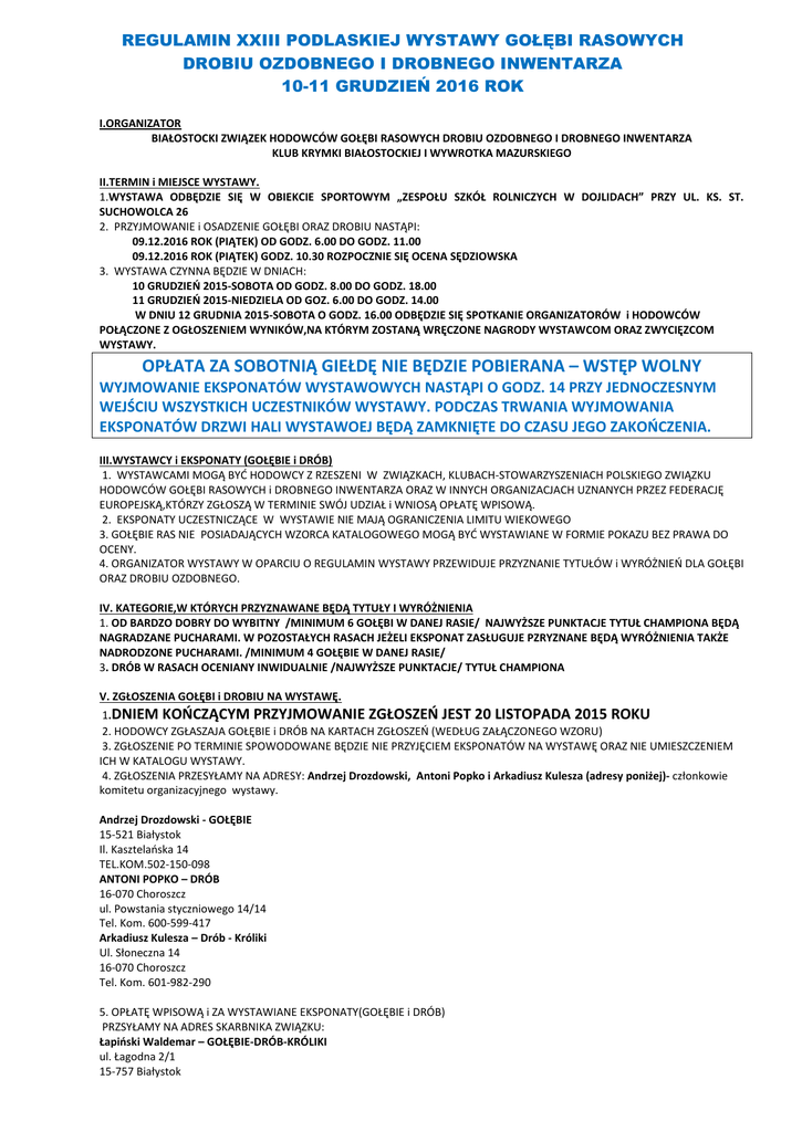 REGULAMIN XXIII PODLASKIEJ WYSTAWY GOŁĘBI RASOWYCH DROBIU OZDOBNEGO I DROBNEGO INWENTARZA 10-11 GRUDZIEŃ 2016 ROK I.ORGANIZATOR BIAŁOSTOCKI ZWIĄZEK HODOWCÓW GOŁĘBI RASOWYCH DROBIU OZDOBNEGO I DROBNEGO INWENTARZA KLUB KRYMKI BIAŁOSTOCKIEJ I WYWROTKA MAZURSKIEGO II.TERMIN i MIEJSCE WYSTAWY. 1.WYSTAWA ODBĘDZIE SIĘ W OBIEKCIE SPORTOWYM „ZESPOŁU SZKÓŁ ROLNICZYCH W DOJLIDACH” PRZY UL. KS. ST. SUCHOWOLCA 26 2. PRZYJMOWANIE i OSADZENIE GOŁĘBI ORAZ DROBIU NASTĄPI: 09.12.2016 ROK (PIĄTEK) OD GODZ. 6.00 DO GODZ. 11.00 09.12.2016 ROK (PIĄTEK) GODZ. 10.30 ROZPOCZNIE SIĘ OCENA SĘDZIOWSKA 3. WYSTAWA CZYNNA BĘDZIE W DNIACH: 10 GRUDZIEŃ 2015-SOBOTA OD GODZ. 8.00 DO GODZ. 18.00 11 GRUDZIEŃ 2015-NIEDZIELA OD GOZ. 6.00 DO GODZ. 14.00 W DNIU 12 GRUDNIA 2015-SOBOTA O GODZ. 16.00 ODBĘDZIE SIĘ SPOTKANIE ORGANIZATORÓW i HODOWCÓW POŁĄCZONE Z OGŁOSZENIEM WYNIKÓW,NA KTÓRYM ZOSTANĄ WRĘCZONE NAGRODY WYSTAWCOM ORAZ ZWYCIĘZCOM WYSTAWY. OPŁATA ZA SOBOTNIĄ GIEŁDĘ NIE BĘDZIE POBIERANA – WSTĘP WOLNY WYJMOWANIE EKSPONATÓW WYSTAWOWYCH NASTĄPI O GODZ. 14 PRZY JEDNOCZESNYM WEJŚCIU WSZYSTKICH UCZESTNIKÓW WYSTAWY. PODCZAS TRWANIA WYJMOWANIA EKSPONATÓW DRZWI HALI WYSTAWOEJ BĘDĄ ZAMKNIĘTE DO CZASU JEGO ZAKOŃCZENIA. III.WYSTAWCY i EKSPONATY (GOŁĘBIE i DRÓB) 1. WYSTAWCAMI MOGĄ BYĆ HODOWCY Z RZESZENI W ZWIĄZKACH, KLUBACH-STOWARZYSZENIACH POLSKIEGO ZWIĄZKU HODOWCÓW GOŁĘBI RASOWYCH i DROBNEGO INWENTARZA ORAZ W INNYCH ORGANIZACJACH UZNANYCH PRZEZ FEDERACJĘ EUROPEJSKĄ,KTÓRZY ZGŁOSZĄ W TERMINIE SWÓJ UDZIAŁ i WNIOSĄ OPŁATĘ WPISOWĄ. 2. EKSPONATY UCZESTNICZĄCE W WYSTAWIE NIE MAJĄ OGRANICZENIA LIMITU WIEKOWEGO 3. GOŁĘBIE RAS NIE POSIADAJĄCYCH WZORCA KATALOGOWEGO MOGĄ BYĆ WYSTAWIANE W FORMIE POKAZU BEZ PRAWA DO OCENY. 4. ORGANIZATOR WYSTAWY W OPARCIU O REGULAMIN WYSTAWY PRZEWIDUJE PRZYZNANIE TYTUŁÓW i WYRÓŻNIEŃ DLA GOŁĘBI ORAZ DROBIU OZDOBNEGO. IV. KATEGORIE,W KTÓRYCH PRZYZNAWANE BĘDĄ TYTUŁY I WYRÓŻNIENIA 1. OD BARDZO DOBRY DO WYBITNY /MINIMUM 6 GOŁĘBI W DANEJ RASIE/ NAJWYŻSZE PUNKTACJE TYTUŁ CHAMPIONA BĘDĄ NAGRADZANE PUCHARAMI. W POZOSTAŁYCH RASACH JEŻELI EKSPONAT ZASŁUGUJE PZRYZNANE BĘDĄ WYRÓŻNIENIA TAKŻE NADRODZONE PUCHARAMI. /MINIMUM 4 GOŁĘBIE W DANEJ RASIE/ 3. DRÓB W RASACH OCENIANY INWIDUALNIE /NAJWYŻSZE PUNKTACJE/ TYTUŁ CHAMPIONA V. ZGŁOSZENIA GOŁĘBI i DROBIU NA WYSTAWĘ. 1.DNIEM KOŃCZĄCYM PRZYJMOWANIE ZGŁOSZEŃ JEST 20 LISTOPADA 2015 ROKU 2. HODOWCY ZGŁASZAJA GOŁĘBIE i DRÓB NA KARTACH ZGŁOSZEŃ (WEDŁUG ZAŁĄCZONEGO WZORU) 3. ZGŁOSZENIE PO TERMINIE SPOWODOWANE BĘDZIE NIE PRZYJĘCIEM EKSPONATÓW NA WYSTAWĘ ORAZ NIE UMIESZCZENIEM ICH W KATALOGU WYSTAWY. 4. ZGŁOSZENIA PRZESYŁAMY NA ADRESY: Andrzej Drozdowski, Antoni Popko i Arkadiusz Kulesza (adresy poniżej)- członkowie komitetu organizacyjnego wystawy. Andrzej Drozdowski - GOŁĘBIE 15-521 Białystok Il. Kasztelańska 14 TEL.KOM.502-150-098 ANTONI POPKO – DRÓB 16-070 Choroszcz ul. Powstania styczniowego 14/14 Tel. Kom. 600-599-417 Arkadiusz Kulesza – Drób - Króliki Ul. Słoneczna 14 16-070 Choroszcz Tel. Kom. 601-982-290 5. OPŁATĘ WPISOWĄ i ZA WYSTAWIANE EKSPONATY(GOŁĘBIE i DRÓB) PRZSYŁAMY NA ADRES SKARBNIKA ZWIĄZKU: Łapiński Waldemar – GOŁĘBIE-DRÓB-KRÓLIKI ul. Łagodna 2/1 15-757 Białystok Tel. Kom. 502-877-487 LUB NA KONTO ZWIĄZKU: BANK OCHRONY ŚRODOWISKA S.A. 15-282 BIAŁYSTOK ul. PIĘKNA 1 NR. KONTA: 81-1540-1216-2054-9106-5494-0001 VI.OPŁATY ZA UDZIAŁ W WYSTAWIE. 1. KOSZT UCZESTNICTWA. OPŁATA WPISOWA – 40zł ZA JEDNĄ SZTUKĘ (GOŁĘBIA ) 10 ZŁ ZA JEDNĄ SZTUKĘ (DROBIU ) 5ZŁ OCZKO NA GIEŁDZIE – 15zł 2. DLA ZAINTERESOWANYCH REKLAMA CZARNO BIAŁA CAŁA STRONA – 100zł POŁOWA STRONY – 50zł 3. WYSTAWCA W RAMACH WPISOWEGO OTRZYMUJE,WSTEP WOLNY,KATALOG WYSTAWY ORAZ WSZYSCY UCZESTNICY NIEZALEŻNIE OD ZWYCIĘZCÓW W RASIE OTRZYMAJĄ UPOMINKI W FORMIE WYRÓŻNIEŃ 4. UCZESTNICZĄCY W WYSTAWIE ZOBOWIĄZANI SĄ DO NOSZENIA W WIDOCZNYM MIEJSCU WIZYTÓWKI INFORMUJĄCEJ O JEGO UCZESTNICTWIE W WYSTAWIE, KTÓRĄ OTRZYMA OD ORGANIZATORA. 5. NA TERENIE WYSTAWY ZOSTANIE ZORGANIZOWANA GIEŁDA NADWYŻEK HODOWLANYCH CZYNNA W GODZINACH OD OTWARCIA DO ZAMKNIĘCIA. SOBOTA OD 8.00 DO 18.00 (OPŁATA ZA GIEŁDĘ NIE BĘDZIE POBIERANA) NIEDZILELA. OD 6.00 DO 14.00 VII.KOMISJA SĘDZIOWSKA. 1.SKŁAD KOMISJI SĘDZIOWSKIEJ WYTYPOWANY JEST WSPÓLNIE PRZEZ KOLEGIUM SĘDZIÓW i ORGANIZATORA. 2.OCENA GOŁĘBI i DROBIU ODBYWA SIĘ W OPARCIU O INSTRUKCJĘ OCENY. 3. W CZSIE TRWANIA OCENY NA SALI MAGĄ BYĆ OBECNI JEDYNIE SĘDZIOWIE,ASYSTENCI i OSOBY NIEZBĘDNE DO FUNKCJONOWANIA WYSTAWY. 4. PO ZAKOŃCZENIU OCENY SĘDZIOWIE STĘPLUJĄ i PODPISUJĄ KARTY OCEN ORAZ NANOSZĄ DANE NA PROTOKOŁY ZBIORCZE,USTALAJĄC LOKATY KONKURSU.KARTA OCENY NIE PODPISANA i PODBITA IMIENNĄ PIECZĄTKĄ SĘDZIEGO JEST NIEWAŻNA. WERDYKT KOMISJI SĘDZIOWSKIEJ JEST OSTATECZNY. VIII.ZASTRZEŻENIA ORGANIZATORA. 1.ORGANIZATOR WYSTAWY ZASTRZEGA SOBIE PRAWO DO NIE PRZYJĘCIA EKSPONATÓW CHORYCH i PO TERMINIE OSADZANIA. 2.. ORGANIZATOR NIE ODPOWIADA ZA PADŁE ESPONATY W CZASIE WYSTAWY NIE Z WINY ORGANIZATORA. 3.. ZA ZAGINIONE EKSPONATY Z WYSTAWY WŁAŚCICIEL OTRZYMA ODSZKODOWANIE W WYSOKOŚCI 100zł./SŁOWNIE STO ZŁOTYCH/ WYDANIE EKSPONATÓW Z WYSTAWY PRZED ZAKOŃCZENIEM JEST MOŻLIWE ZA ODPŁATNOŚCIĄ 20zł.(sobota) 20zł (niedziela) 4. OSOBY ZAKŁÓCAJĄCE PORZĄDEK BĘDĄ USUWANE Z TERENU WYSTAWY. 5. W CZSIE TRWANIA WYSTAWY ORGANIZATOR ZAPEWNIA EKSPONATOM WYŻYWIENIE, ,NADZÓR LEKARSKI ORAZ CAŁODOBOWĄ OCHRONĘ. IX.UPRAWNIENIA i OBOWIĄZKI WYSTAWCÓW. 1.WYSTAWCA MA PRAWO OTRZYMAĆ KARTYĘ OCENY ORAZ WSZYSTKIE INNE NAGRODY i WYRÓŻNIENIA PRZEWIDZIANE REGULAMINEM WYSTAWY. 2.WYSTAWCA NIE MOŻE WSZCZYNAĆ DYSKUSJI Z SĘDZIĄ LUB ORGANIZATOREM W SPRAWIE WERDYKTU.MOŻE NATOMIAST ZŁOŻYĆ PISEMNY LUB USTNY PROTEST U SĘDZIEGO OBSERWATORA BEZPOŚREDNIO LUB ZA POŚREDNICTWEM ORGANIZATORA. 3.WYSTAWCA ZOBOWIĄZANY JEST DO TERMINOWEGO DOSTARCZENIA ESPONATÓW DO OCENY i ICH TERMINO