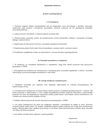 Regulamin konkursu Konkurs epistolograficzny I. Cel konkursu 1. Poznanie poprzez lekturę korespondencji lub jej fragmentów życia prywatnego i dorobku twórczego, naukowego osób znanych i nieznanych, uczestników ważnych wydarzeń, ale też opisujących codzienne, zwyczajne problemy. 2. Lektura utworów literackich, w których pojawia się forma listu. 3. Wykorzystanie uzyskanej wiedzy do przedstawienia swoich przemyśleń, refleksji i nawiązania swoistego dialogu z autorem listów. 4. Inspirowanie do aktywności twórczej i rozwijania umiejętności literackich. 5. Popularyzacja pisania listów jako formy komunikacji, wymiany myśli, wyrażania emocji. 6. Przybliżenie i pogłębienie wiedzy na temat historii i rozwoju literatury epistolograficznej. II. Warunki uczestnictwa w konkursie 1. W konkursie, na warunkach określonych w regulaminie, mogą brać udział uczniowie klas pierwszych gimnazjum w ZSMS. 2. Przystąpienie do konkursu jest równoznaczne z akceptacją przez uczestnika regulaminu w całości i uczestnik zobowiązuje się do przestrzegania określonych w nim zasad. III. Zasady konkursu i tematyka prac 1. Zadaniem uczestnika jest napisanie listu będącego odpowiedzią na wybraną korespondencję lub inspirowanego treścią. 2. Uczestnik może zainspirować się innym listem zamieszczonym w książkach przedstawionych w wykazie lub listem zawartym w innej książce, w tych jednak przypadkach powinien zamieścić informację z jakiej książki pochodzi list, który był inspiracją do wypowiedzi (należy podać autora, tytuł książki, nazwę wydawnictwa, rok wydania oraz stronę na której znajduje się list). 3. Konkurs adresowany jest do uczniów klas pierwszych gimnazjum w ZSMS. 4. List (praca konkursowa) nie może być podpisany imieniem i nazwiskiem na żadnej ze stron. Powinien zawierać jedynie godło autora. W osobnej, zamkniętej kopercie należy dołączyć do swojej pracy konkursowej kartkę z danymi autora listu i godłem (tym samym, co na liście). Dane autora powinny zawierać: imię, nazwisko oraz klasa, do której uczęszcza. 5. Jury będzie oceniało teksty napisane w języku polskim. Organizator: Marzena Wojciechowska
