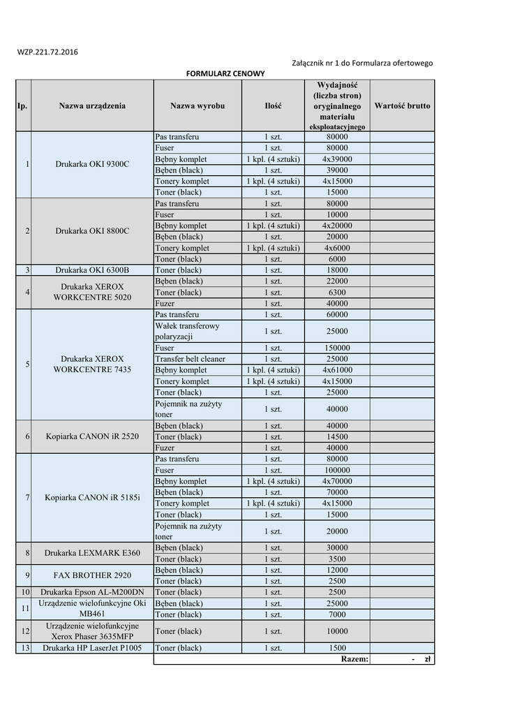WZP.221.72.2016 Załącznik nr 1 do Formularza ofertowego FORMULARZ CENOWY Ip. Nazwa urządzenia Nazwa wyrobu Ilość Wydajność (liczba stron) oryginalnego materiału Wartość brutto eksploatacyjnego 1 Drukarka OKI 9300C 2 Drukarka OKI 8800C 3 Drukarka OKI 6300B 4 Drukarka XEROX WORKCENTRE 5020 5 Drukarka XEROX WORKCENTRE 7435 6 Kopiarka CANON iR 2520 7 Kopiarka CANON iR 5185i 8 Drukarka LEXMARK E360 9 FAX BROTHER 2920 10 Drukarka Epson AL-M200DN Urządzenie wielofunkcyjne Oki MB461 Urządzenie wielofunkcyjne Xerox Phaser 3635MFP Drukarka HP LaserJet P1005 11 12 13 Pas transferu Fuser Bębny komplet Bęben (black) Tonery komplet Toner (black) Pas transferu Fuser Bębny komplet Bęben (black) Tonery komplet Toner (black) Toner (black) Bęben (black) Toner (black) Fuzer Pas transferu Wałek transferowy polaryzacji Fuser Transfer belt cleaner Bębny komplet Tonery komplet Toner (black) Pojemnik na zużyty toner Bęben (black) Toner (black) Fuzer Pas transferu Fuser Bębny komplet Bęben (black) Tonery komplet Toner (black) Pojemnik na zużyty toner Bęben (black) Toner (black) Bęben (black) Toner (black) Toner (black) Bęben (black) Toner (black) 1 szt. 1 szt. 1 kpl. (4 sztuki) 1 szt. 1 kpl. (4 sztuki) 1 szt. 1 szt. 1 szt. 1 kpl. (4 sztuki) 1 szt. 1 kpl. (4 sztuki) 1 szt. 1 szt. 1 szt. 1 szt. 1 szt. 1 szt. 80000 80000 4x39000 39000 4x15000 15000 80000 10000 4x20000 20000 4x6000 6000 18000 22000 6300 40000 60000 1 szt. 25000 1 szt. 1 szt. 1 kpl. (4 sztuki) 1 kpl. (4 sztuki) 1 szt. 150000 25000 4x61000 4x15000 25000 1 szt. 40000 1 szt. 1 szt. 1 szt. 1 szt. 1 szt. 1 kpl. (4 sztuki) 1 szt. 1 kpl. (4 sztuki) 1 szt. 40000 14500 40000 80000 100000 4x70000 70000 4x15000 15000 1 szt. 20000 1 szt. 1 szt. 1 szt. 1 szt. 1 szt. 1 szt. 1 szt. 30000 3500 12000 2500 2500 25000 7000 Toner (black) 1 szt. 10000 Toner (black) 1 szt. 1500 Razem: - zł