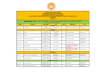 WYŻSZA SZKOŁA ARTYSTYCZNA Harmonogram zajęć - Studia niestacjonarne Rok akademicki 2013/20134- Semestr zimowy Kierunek: Malarstwo, Specjalność:Malarstwo w scenografii /Specjalność: Kostium i Rekwizyt Sceniczny III WSA CH B Semestr V Terminy zjazdów: 4,5,6 X, 11, 12, 13 X, 25,26,27 X, 15, 16, 17 XI, 22, 23, 24 XI, 6,7,8 XII, 13, 14, 15 XII, 10,11,12 I 2014r., 24, 25, 26 I 2014r.- zaliczenia Godziny Przedmiot Rodzaj zajęć Wykładowca Sala ECTS sala wykładowa 2 2 mgr Katarzyna Kosińska - Polańska (suma wykładów =18h) Uwagi PIĄTEK Prawo autorskie Wykład (zaliczenie na ocenę) 8.00 - 11.00 Malarstwo Ćwiczenia (zaliczenia na ocenę) Pracownia rysunku i malarstwa 4 dr hab. Rafał Kochański (suma ćwiczeń =36h) 11.00 - 13.30 Rysunek Ćwiczenia (zaliczenie z oceną) Pracownia rysunku i malarstwa 4 dr hab. Rafał Kochański (suma ćwiczeń = 27h) 13.30 - 15.00 Reżyseria barwy i przestrzeni Wykład/Ćwiczenia (zaliczenie na ocenę) sala wykładowa 2 2 dr hab. Roman Woźniak (suma wykładów = 6h, suma ćwiczeń=12h) 15.30 - 17.00 Scenografia Wykład/Ćwiczenia (zaliczenie na ocenę) sala wykładowa 2 2 dr hab. Roman Woźniak (suma wykładów = 12h, suma ćwiczeń=6h) 17.00 - 18.30 Historia malarstwa Ćwiczenia (zaliczenia na ocenę) sala wykładowa 2 2 mgr Magdalena Kucza - Kuczyńska [ zastępstwo mgr Agnieszka Mazur - Gadzinowska ] (suma wykładów = 18h) 18.30 - 20.00 Wybrane zagadnienia ze sztuki współczesnej Ćwiczenia (zaliczenia na ocenę) sala wykładowa 1 2 mgr Magdalena Kucza - Kuczyńska [ zastępstwo mgr Agnieszka Mazur - Gadzinowska ] (suma ćwiczeń=18h) 17.00 - 18.30 SOBOTA NIEDZIELA 8.00 - 9.30 Malarstwo w technikach scenograficznych Wykład/Ćwiczenia (zaliczenie na ocenę) PRACOWNIA CHARAKTERYZACJI 1 prof. Andrzej Maciej Łubowski / plastyk (suma wykładów = 6h, suma ćwiczeń=12h) Joanna Minkiewicz 9.30 - 14.00 Pracownia dyplomowa Konwersatorium (zaliczenie na ocenę) PRACOWNIA CHARAKTERYZACJI 10 prof. Andrzej Maciej Łubowski / plastyk (suma konwersatorium =54h) Joanna Minkiewicz 15.30 - 17.00 Rozważania o kulturze Wykład/Ćwiczenia (zaliczenie na ocenę ) sala wykładowa 2 2 dr Maria Piątek (suma wykładów = 6h, suma ćwiczeń=12h) 17.00 - 18.30 Geometria wykreślna z perspektywą Wykład/Ćwiczenia (zaliczenie na ocenę ) sala wykładowa 1 2 mgr Roman Trębacz (suma wykładów = 6h, suma ćwiczeń=12h) Przerwa od 14.00 do 15.30