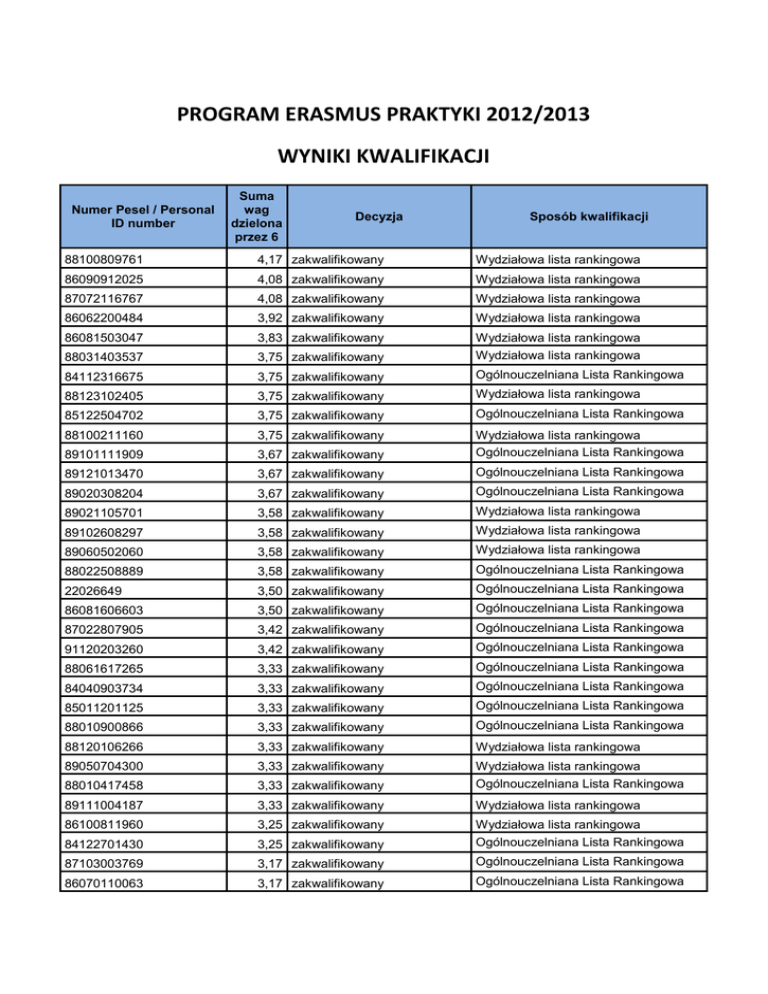 PROGRAM ERASMUS PRAKTYKI 2012/2013 WYNIKI KWALIFIKACJI Numer Pesel / Personal ID number Suma wag dzielona przez 6 Decyzja Sposób kwalifikacji 88100809761 4,17 zakwalifikowany Wydziałowa lista rankingowa 86090912025 4,08 zakwalifikowany Wydziałowa lista rankingowa 87072116767 4,08 zakwalifikowany Wydziałowa lista rankingowa 86062200484 3,92 zakwalifikowany Wydziałowa lista rankingowa 86081503047 3,83 zakwalifikowany 88031403537 3,75 zakwalifikowany Wydziałowa lista rankingowa Wydziałowa lista rankingowa 84112316675 3,75 zakwalifikowany Ogólnouczelniana Lista Rankingowa 88123102405 3,75 zakwalifikowany Wydziałowa lista rankingowa 85122504702 3,75 zakwalifikowany Ogólnouczelniana Lista Rankingowa 88100211160 3,75 zakwalifikowany 89101111909 3,67 zakwalifikowany Wydziałowa lista rankingowa Ogólnouczelniana Lista Rankingowa 89121013470 3,67 zakwalifikowany Ogólnouczelniana Lista Rankingowa 89020308204 3,67 zakwalifikowany Ogólnouczelniana Lista Rankingowa 89021105701 3,58 zakwalifikowany Wydziałowa lista rankingowa 89102608297 3,58 zakwalifikowany Wydziałowa lista rankingowa 89060502060 3,58 zakwalifikowany Wydziałowa lista rankingowa 88022508889 3,58 zakwalifikowany Ogólnouczelniana Lista Rankingowa 22026649 3,50 zakwalifikowany Ogólnouczelniana Lista Rankingowa 86081606603 3,50 zakwalifikowany Ogólnouczelniana Lista Rankingowa 87022807905 3,42 zakwalifikowany Ogólnouczelniana Lista Rankingowa 91120203260 3,42 zakwalifikowany Ogólnouczelniana Lista Rankingowa 88061617265 3,33 zakwalifikowany Ogólnouczelniana Lista Rankingowa 84040903734 3,33 zakwalifikowany Ogólnouczelniana Lista Rankingowa 85011201125 3,33 zakwalifikowany Ogólnouczelniana Lista Rankingowa 88010900866 3,33 zakwalifikowany Ogólnouczelniana Lista Rankingowa 88120106266 3,33 zakwalifikowany Wydziałowa lista rankingowa 89050704300 3,33 zakwalifikowany 88010417458 3,33 zakwalifikowany Wydziałowa lista rankingowa Ogólnouczelniana Lista Rankingowa 89111004187 3,33 zakwalifikowany Wydziałowa lista rankingowa 86100811960 3,25 zakwalifikowany 84122701430 3,25 zakwalifikowany Wydziałowa lista rankingowa Ogólnouczelniana Lista Rankingowa 87103003769 3,17 zakwalifikowany Ogólnouczelniana Lista Rankingowa 86070110063 3,17 zakwalifikowany Ogólnouczelniana Lista Rankingowa 88041504727 3,17 zakwalifikowany Ogólnouczelniana Lista Rankingowa 87011411508 3,17 zakwalifikowany Ogólnouczelniana Lista Rankingowa 86070614581 3,08 zakwalifikowany Ogólnouczelniana Lista Rankingowa 87061101042 3,08 zakwalifikowany Ogólnouczelniana Lista Rankingowa 89021409669 3,00 zakwalifikowany Ogólnouczelniana Lista Rankingowa 88062113487 2,92 zakwalifikowany Ogólnouczelniana Lista Rankingowa 87102107686 2,92 zakwalifikowany Ogólnouczelniana Lista Rankingowa 88042400817 2,92 zakwalifikowany Ogólnouczelniana Lista Rankingowa 88061200000 2,92 zakwalifikowany Ogólnouczelniana Lista Rankingowa 88062909103 2,83 zakwalifikowany Ogólnouczelniana Lista Rankingowa 89121202319 2,75 zakwalifikowany Ogólnouczelniana Lista Rankingowa 85022719428 2,75 zakwalifikowany Ogólnouczelniana Lista Rankingowa 87111203629 2,75 zakwalifikowany Ogólnouczelniana Lista Rankingowa 87072214526 2,67 zakwalifikowany Ogólnouczelniana Lista Rankingowa 91042803344 2,33 zakwalifikowany nie spełnia kryteriów 0,00 formalnych nie spełnia kryteriów 0,00 formalnych nie spełnia kryteriów 0,00 formalnych nie spełnia kryteriów 0,00 formalnych Ogólnouczelniana Lista Rankingowa 89060502060 88052100701 87042100000 88112009306 nie spełnia kryteriów formalnych nie spełnia kryteriów formalnych nie spełnia kryteriów formalnych nie spełnia kryteriów formalnych