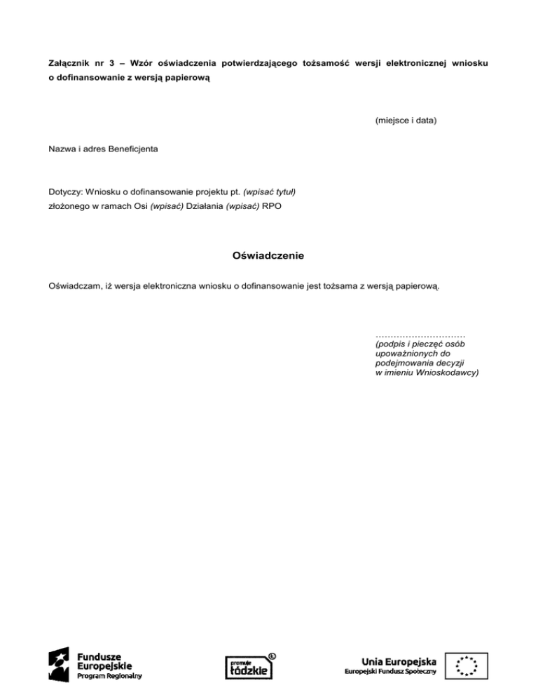 Załącznik nr 3 – Wzór oświadczenia potwierdzającego tożsamość wersji elektronicznej wniosku o dofinansowanie z wersją papierową (miejsce i data) Nazwa i adres Beneficjenta Dotyczy: Wniosku o dofinansowanie projektu pt. (wpisać tytuł) złożonego w ramach Osi (wpisać) Działania (wpisać) RPO Oświadczenie Oświadczam, iż wersja elektroniczna wniosku o dofinansowanie jest tożsama z wersją papierową. ………………………… (podpis i pieczęć osób upoważnionych do podejmowania decyzji w imieniu Wnioskodawcy)