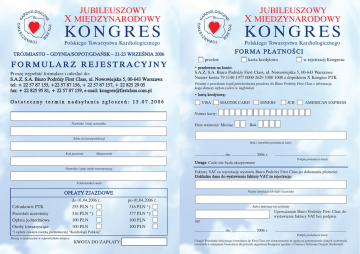 JUBILEUSZOWY X MI¢DZYNARODOWY JUBILEUSZOWY X MI¢DZYNARODOWY KO N G R E S KO N G R E S Polskiego Towarzystwa Kardiologicznego Polskiego Towarzystwa Kardiologicznego FORMA P¸ATNOÂCI TRÓJMIASTO – GDYNIA/SOPOT/GDA¡SK – 21-23 WRZEÂNIA 2006 FORMULARZ REJESTRACYJNY Prosz´ wype∏niç formularz i odes∏aç do: S.A.Z. S.A. Biuro Podró˝y First Class, ul. Nowowiejska 5, 00-643 Warszawa tel: + 22 57 87 155, +22 57 87 156, + 22 57 87 157, + 22 825 29 05 fax: + 22 825 95 81, + 22 57 87 159, e-mail: [email protected] przelew karta kredytowa w rejestracji Kongresu • przelewem na konto: S.A.Z. S.A. Biuro Podró˝y First Class, ul. Nowowiejska 5, 00-643 Warszawa Numer konta 79 1140 1977 0000 2629 5300 1008 z dopiskiem X Kongres PTK Prosimy o przes∏anie kopii potwierdzenia przelewu do Biura Podró˝y First Class z informacjà, kogo dotyczy wp∏ata (adres w nag∏ówku) • kartà kredytowà: Ostateczny termin nadsy∏ania zg∏oszeƒ: 15.07.2006 VISA MASTER CARD DINERS JCB AMERICAN EXPRESS Numer karty: Nazwisko i imi´ uczestnika Data wa˝noÊci: Miesiàc Rok Adres do korespondencji Imi´ i nazwisko posiadacza karty Kod pocztowy MiejscowoÊç .............................., dn. ......................... 2006 r. .................................... .................................... Podpis posiadacza karty Uwaga: Czeki nie b´dà akceptowane Nazwisko i imi´ osoby towarzyszàcej Faktur´ VAT za rejestracj´ wystawia Biuro Podró˝y First Class po dokonaniu p∏atnoÊci. Dok∏adne dane do wystawienia faktury VAT za rejestracj´: Telefon/faks/e-mail Nazwa instytucji lub imi´ i nazwisko OP¸ATY ZJAZDOWE do 01.04.2006 r. po 01.04.2006 r. Cz∏onkowie PTK 255 PLN *) 316 PLN *) Pozostali uczestnicy 316 PLN *) 377 PLN *) Op∏ata jednodniowa 100 PLN 100 PLN Osoby towarzyszàce 100 PLN 100 PLN *) op∏ata zawiera rocznà prenumerat´ “Kardiologii Polskiej” Prosz´ o zaznaczenie w odpowiednim miejscu KWOTA DO ZAP¸ATY: Adres instytucji lub prywatny Upowa˝niam Biuro Podró˝y First Class do wystawienia faktury VAT bez podpisu. NIP .............................., dn. ......................... 2006 r. .................................... .................................... Podpis posiadacza karty Uwaga! Przes∏anie niniejszego formularza do First Class jest równoznaczne ze zgodà na przetwarzanie danych osobowych zawartych w niniejszym formularzu dla potrzeb organizacji Kongresu zgodnie z Ustawà o Ochronie Danych Osobowych.
